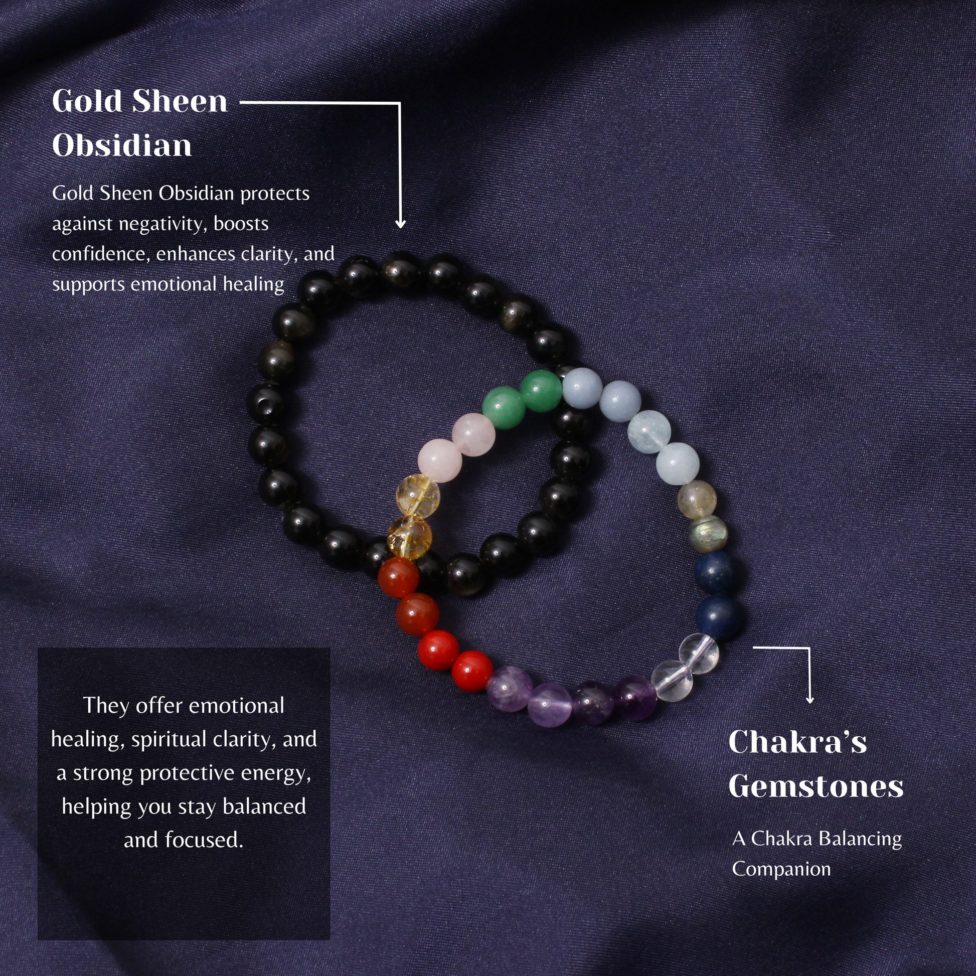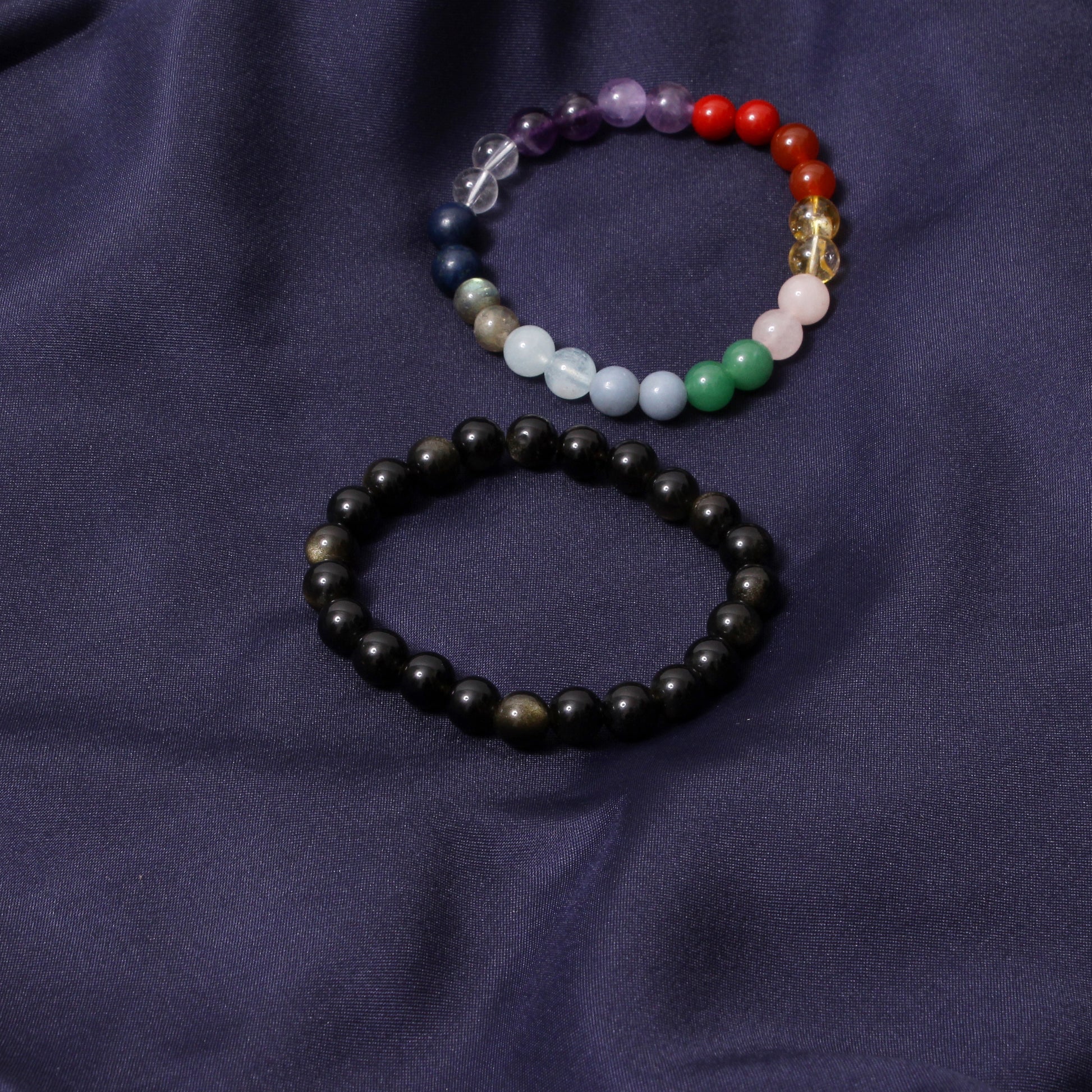 7 Chakras + Gold Sheen Obsidian Healing Stretchable Gemstone Bracelet – Protection, Clarity & Balance