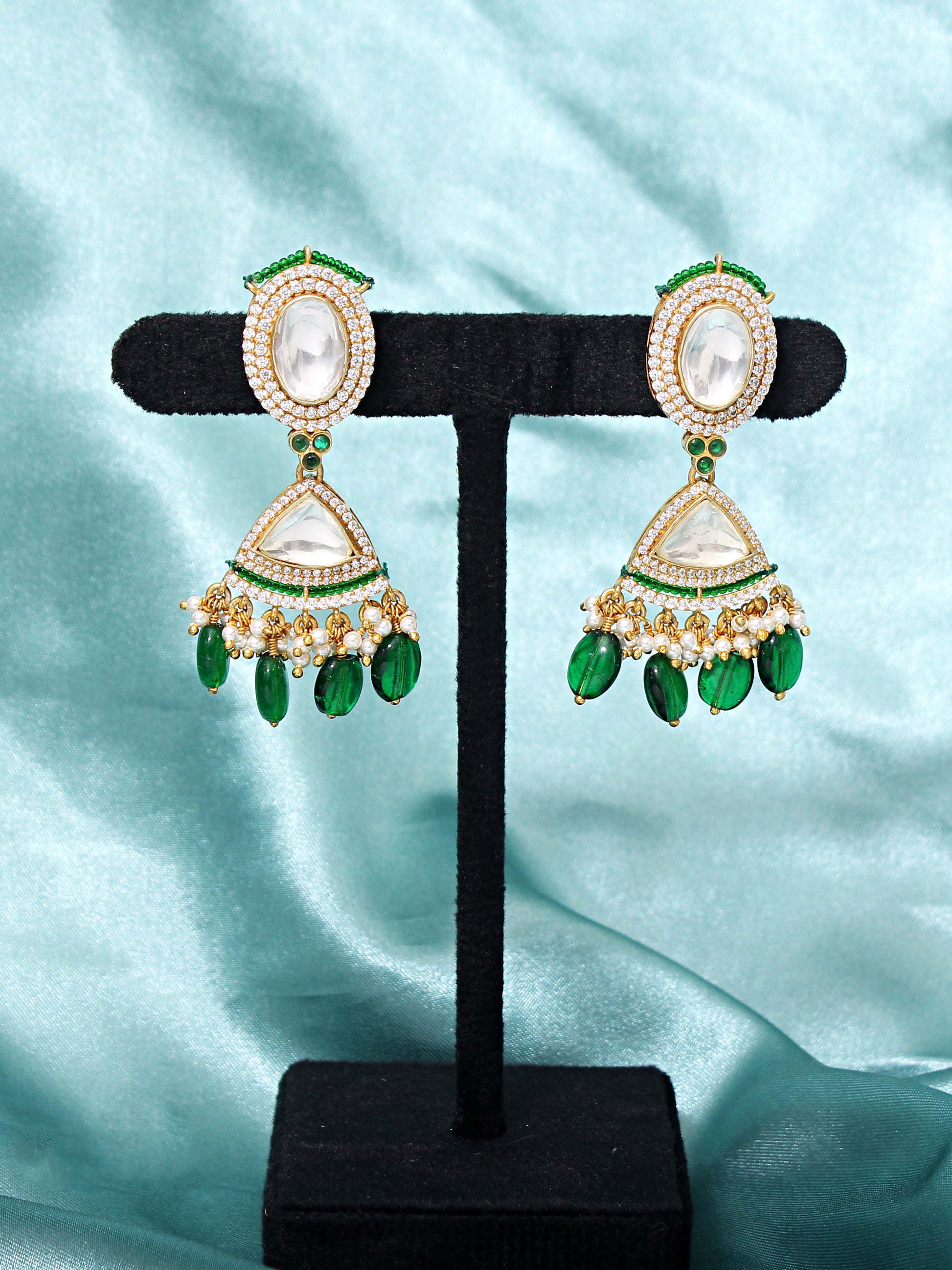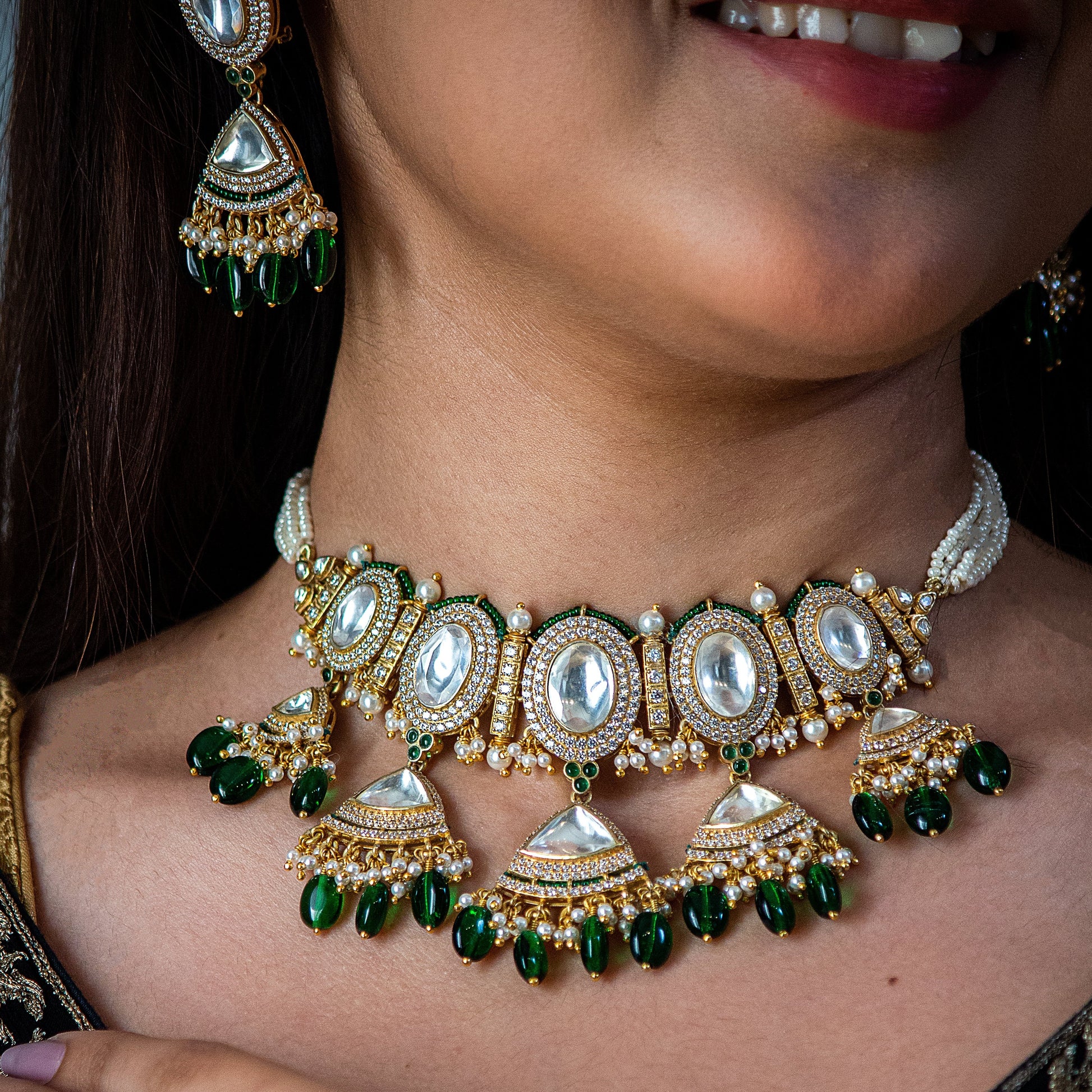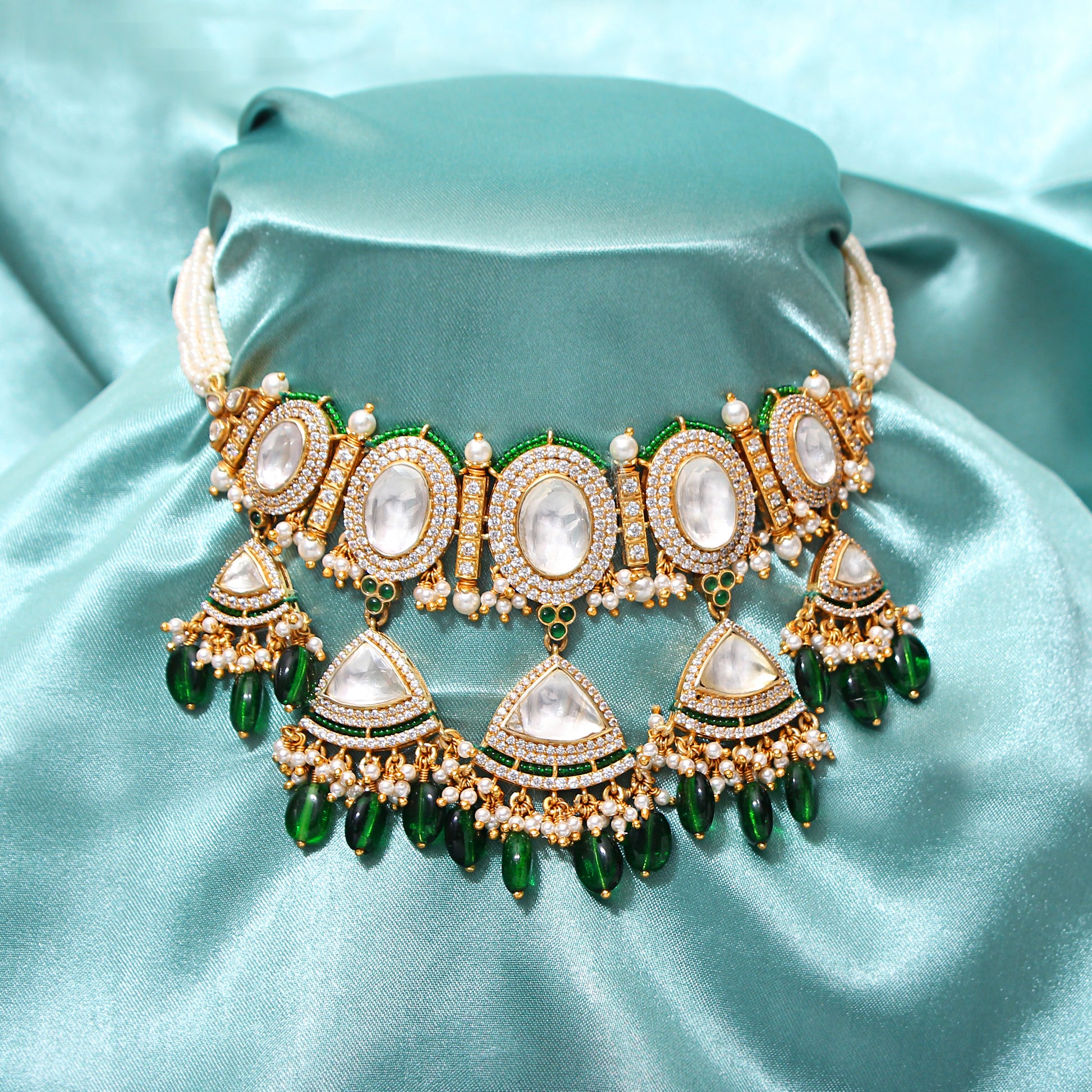 925 Silver Ethnic Jewelry Set with Faux Diamond, Pearl, and Simulated Emerald for Women