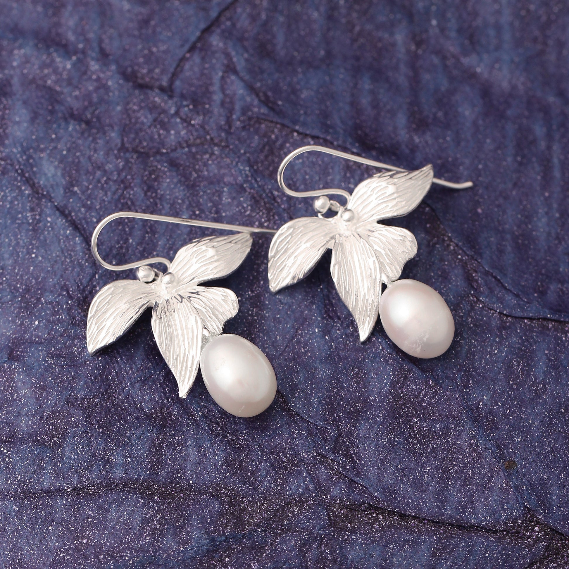 Enchanting Orchids: Dangling earrings with hand-engraved blooms and pearls.