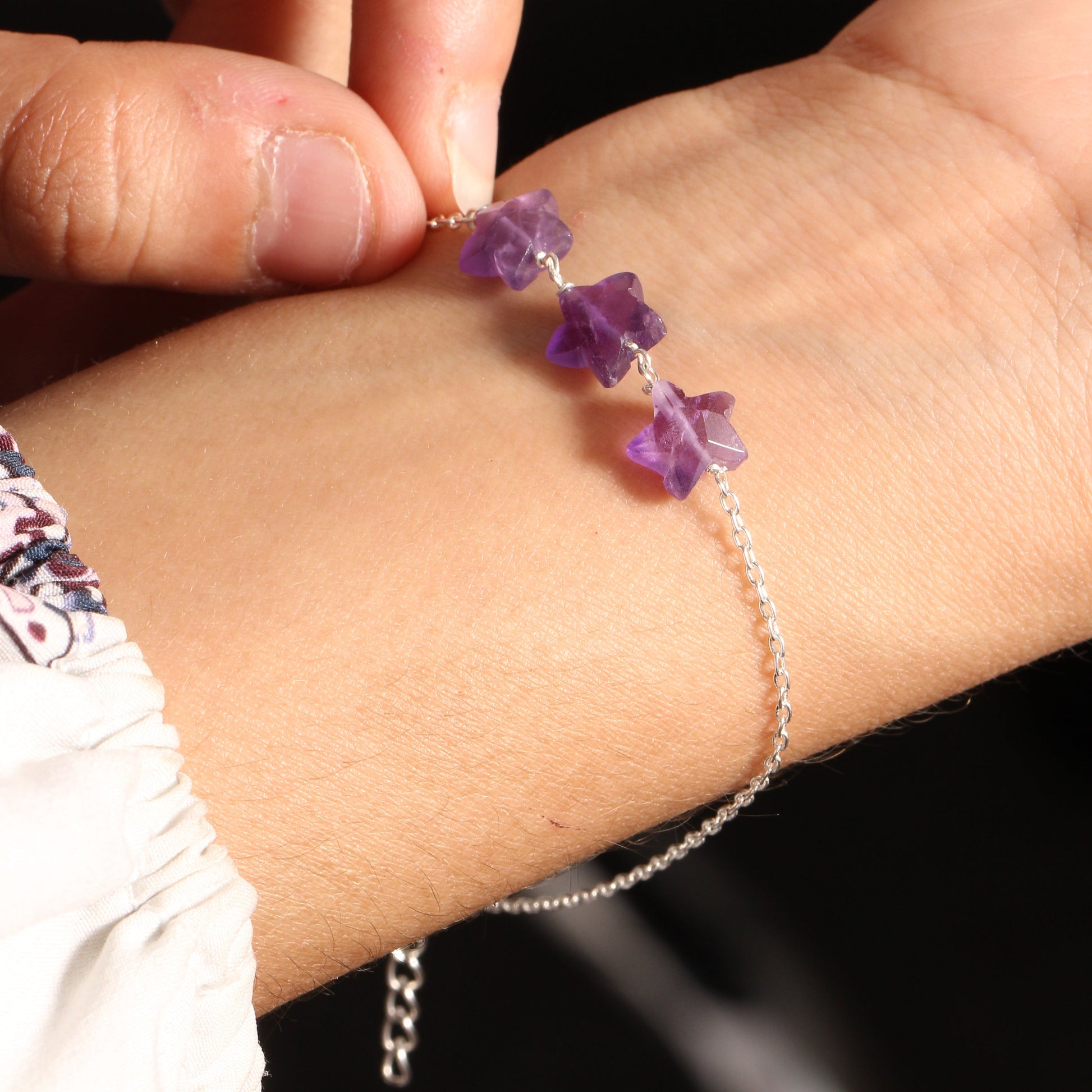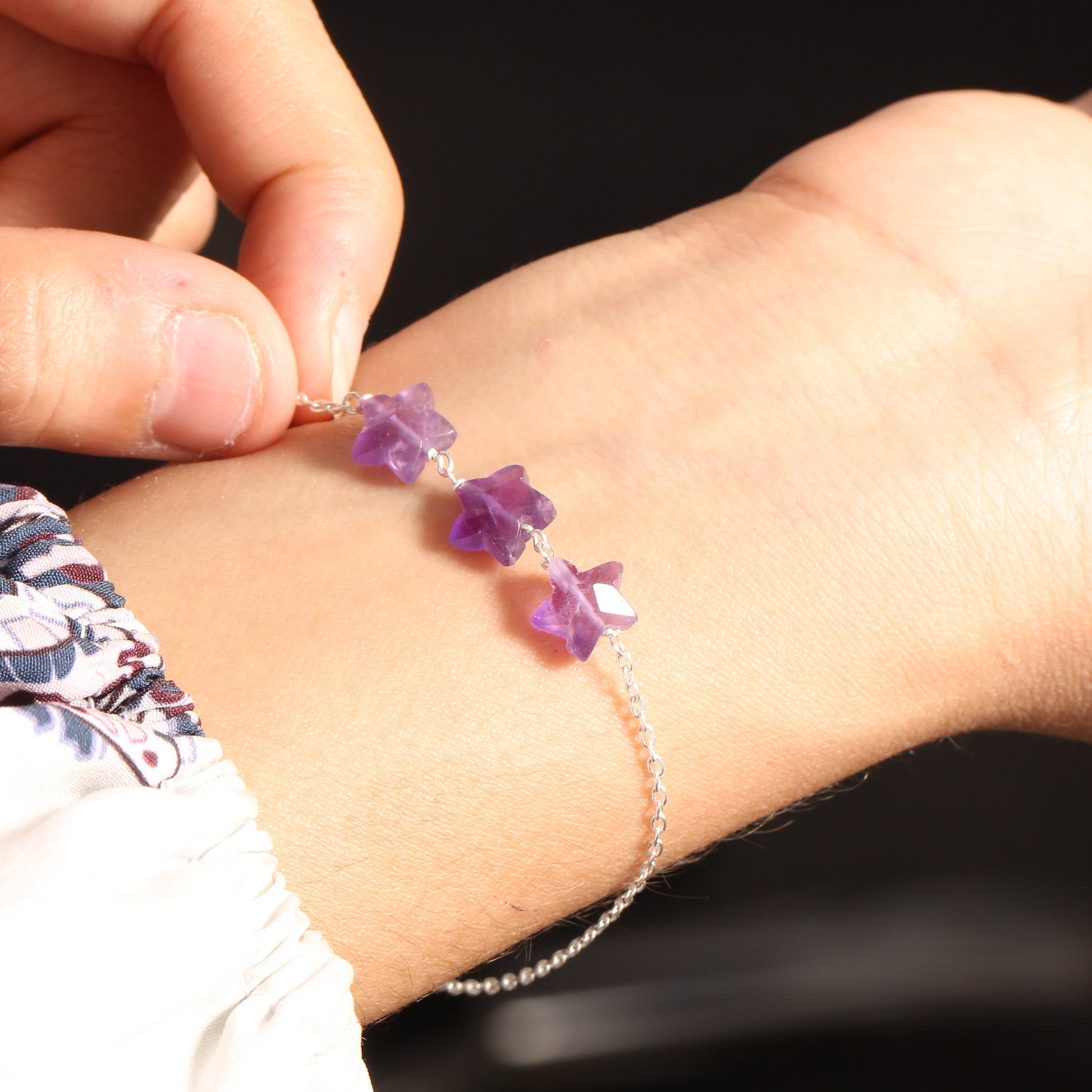 925 Sterling Silver Natural Amethyst Star Chain Bracelet – Adjustable Healing Crystal Chain for Women & Girls