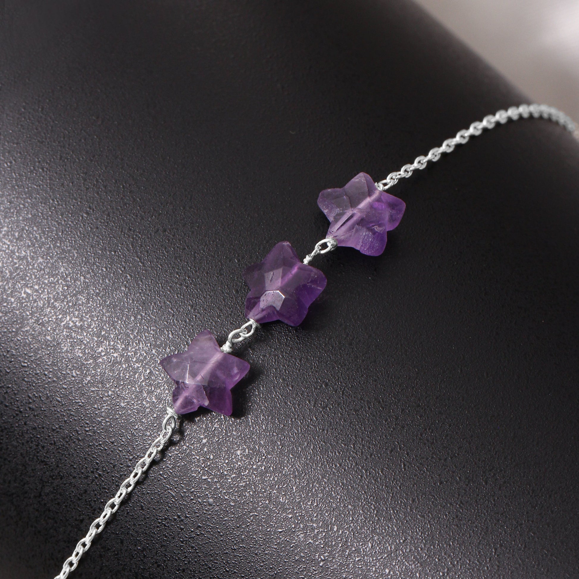 Add a touch of celestial charm to your look with this 925 sterling silver amethyst star bracelet. Featuring intricately carved star-shaped natural amethyst crystals, this adjustable bracelet promotes peace, intuition, and spiritual balance. A perfect accessory for healing energy, style, and gifting.