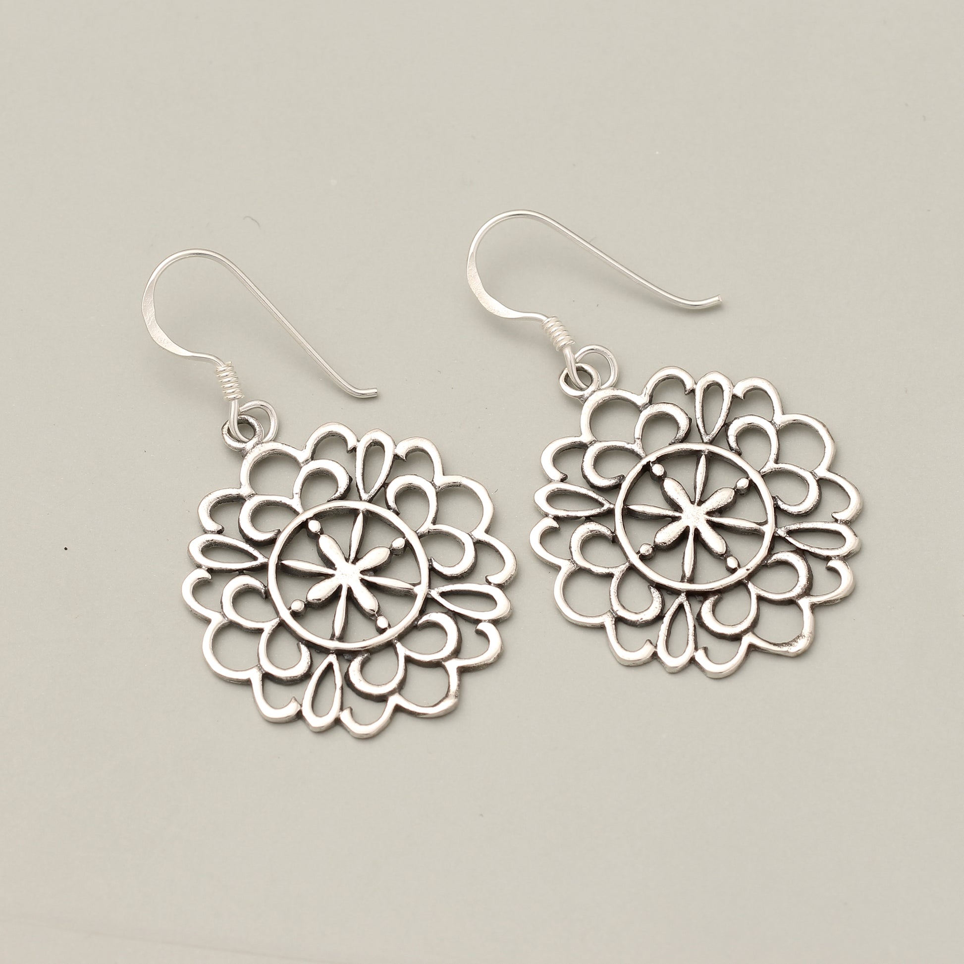 ITEM: 925 Sterling Silver Lace Shape Floral Mandala Dangle Earrings