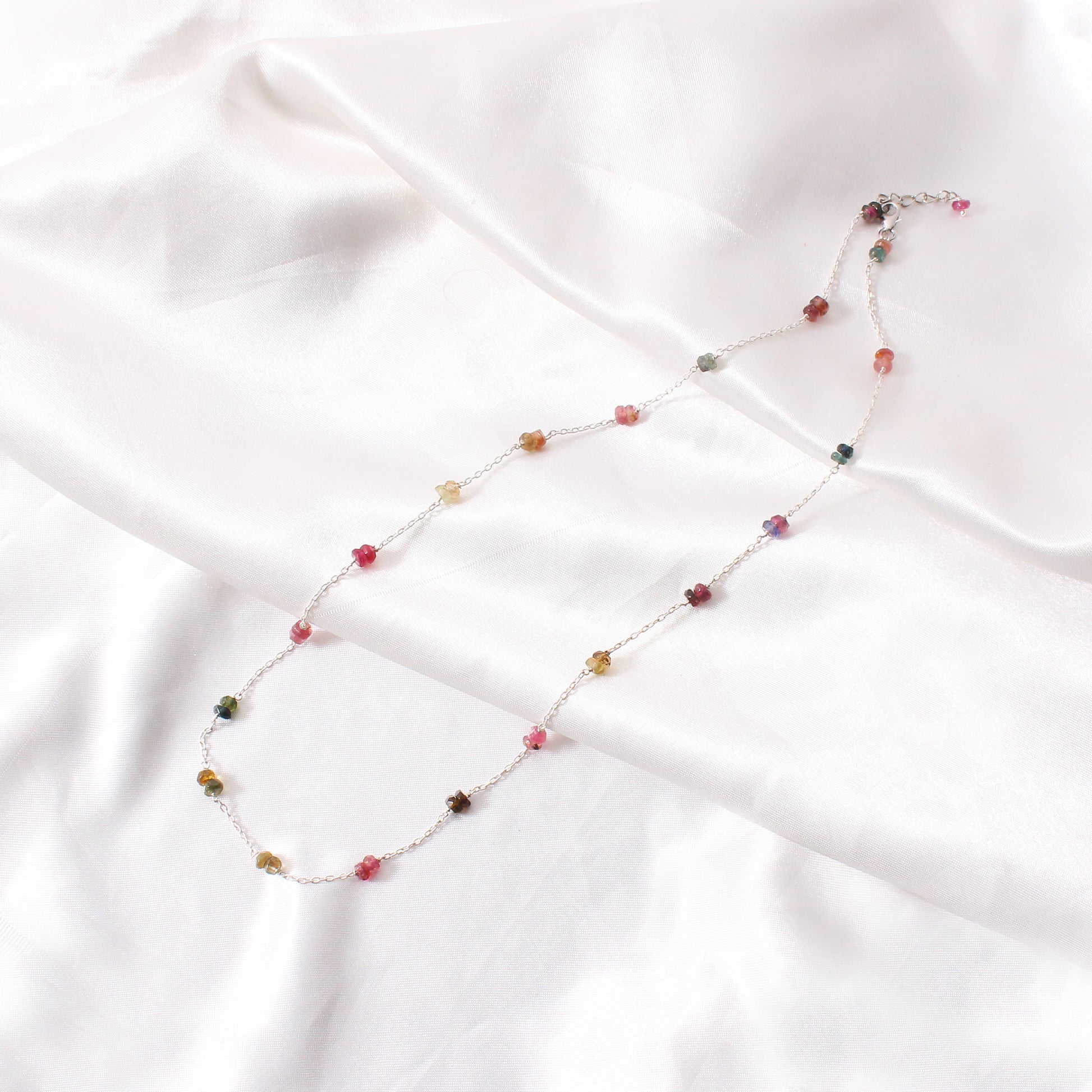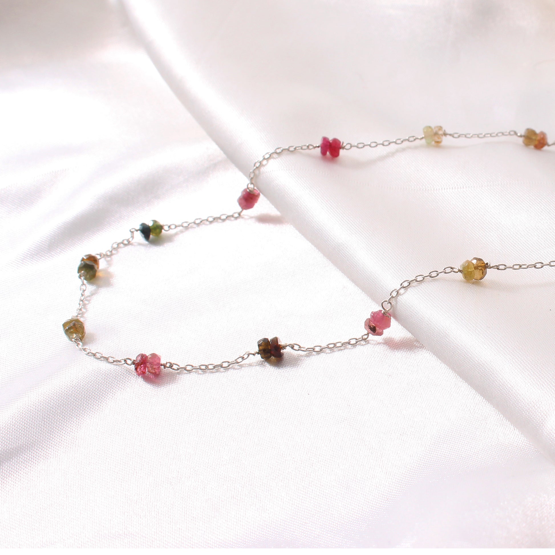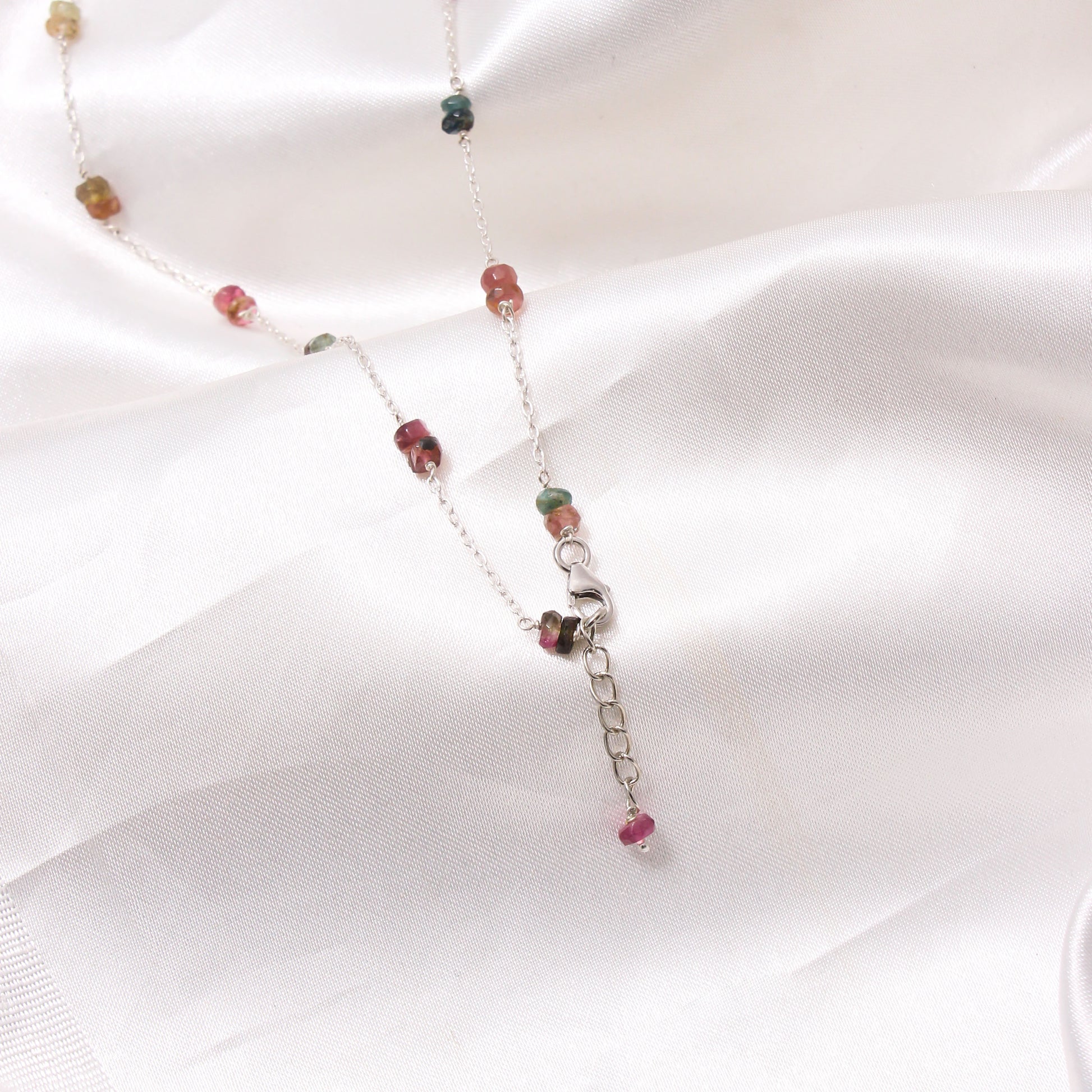 925 Sterling Silver Multi Tourmaline Beaded Chain Necklace – Delicate Multicolor Gemstone Jewelry