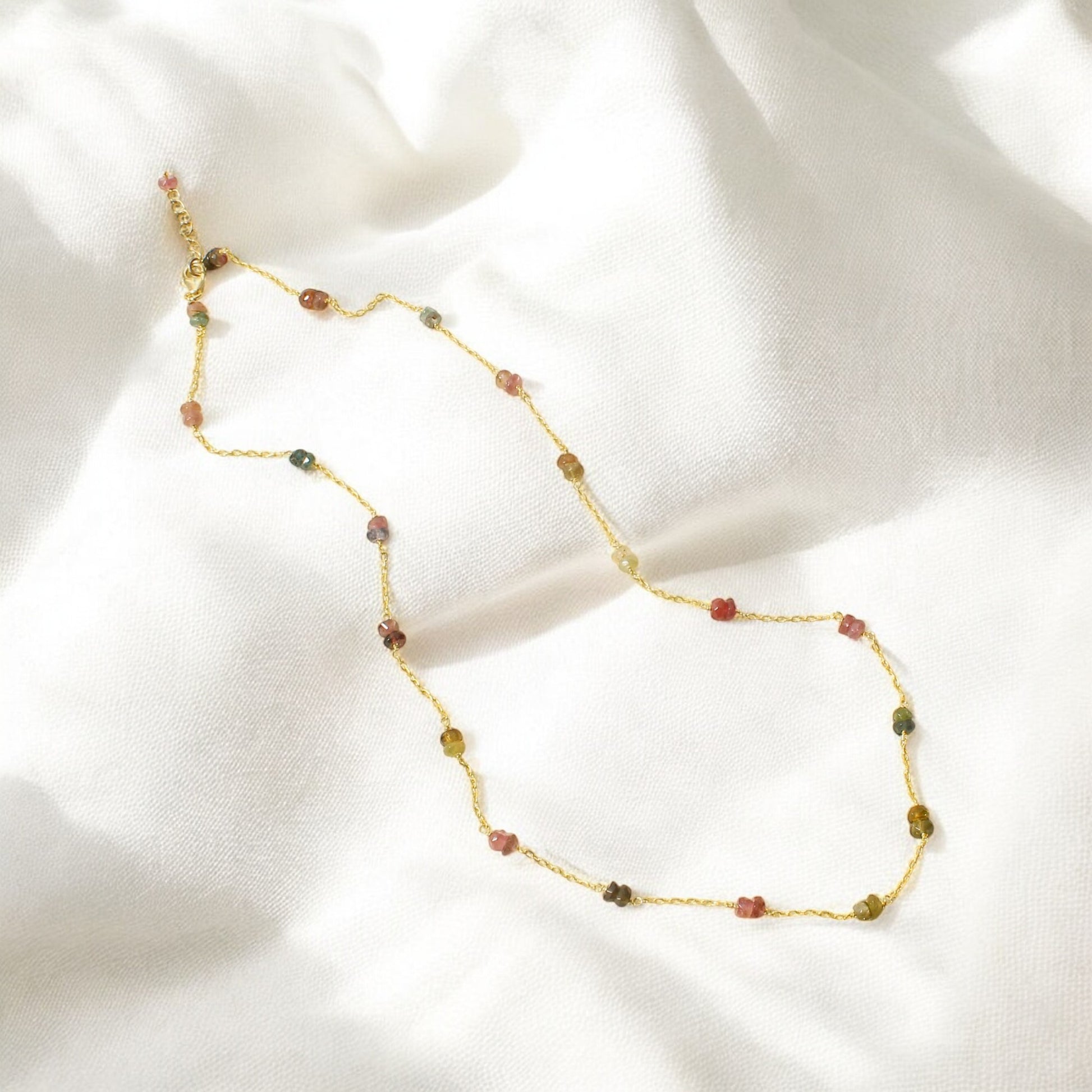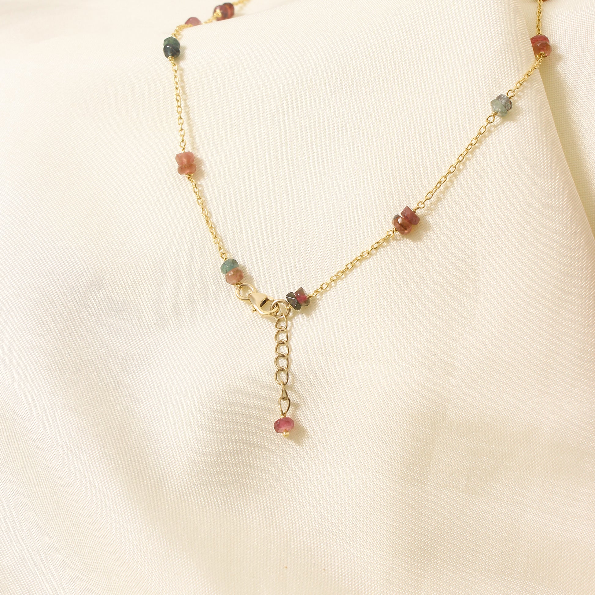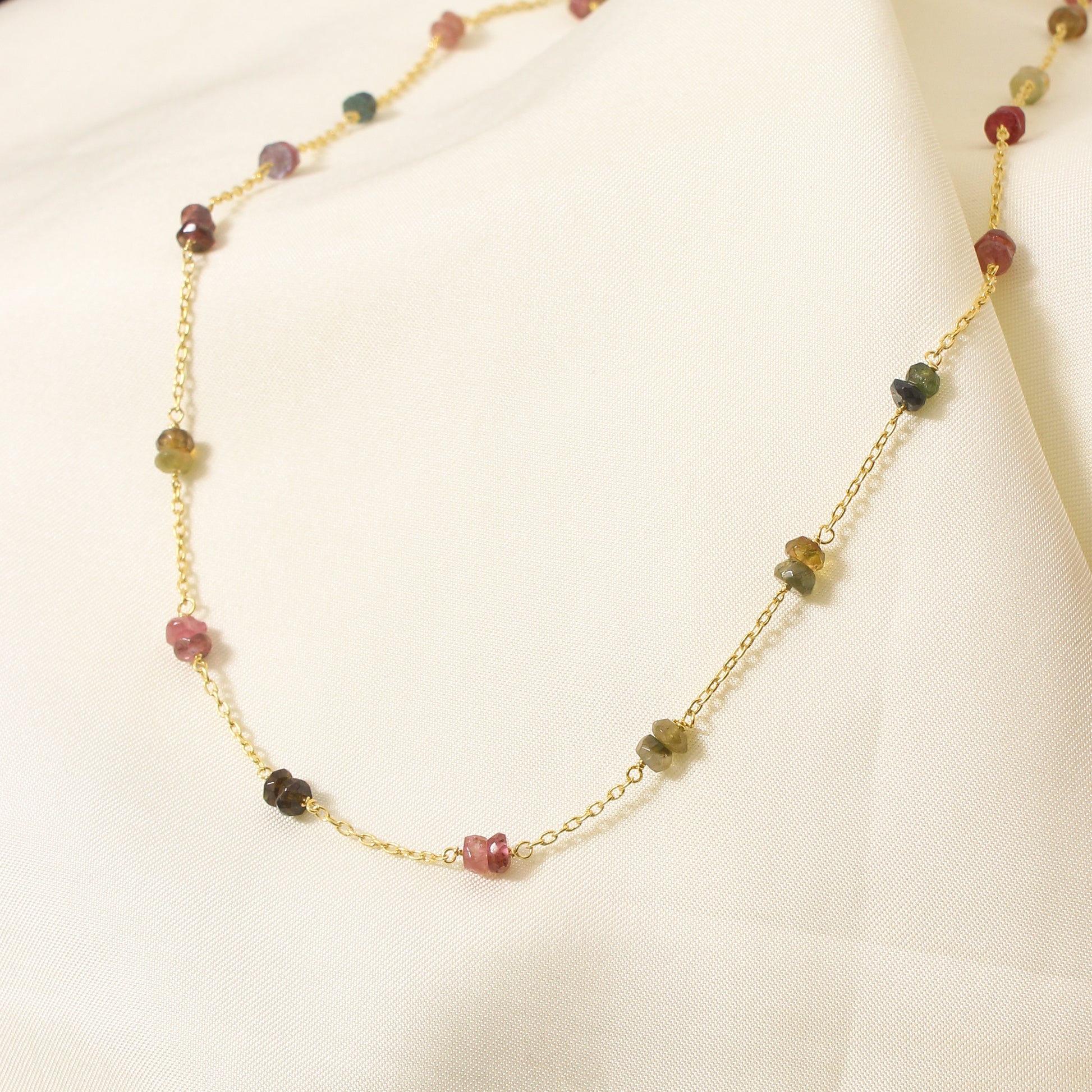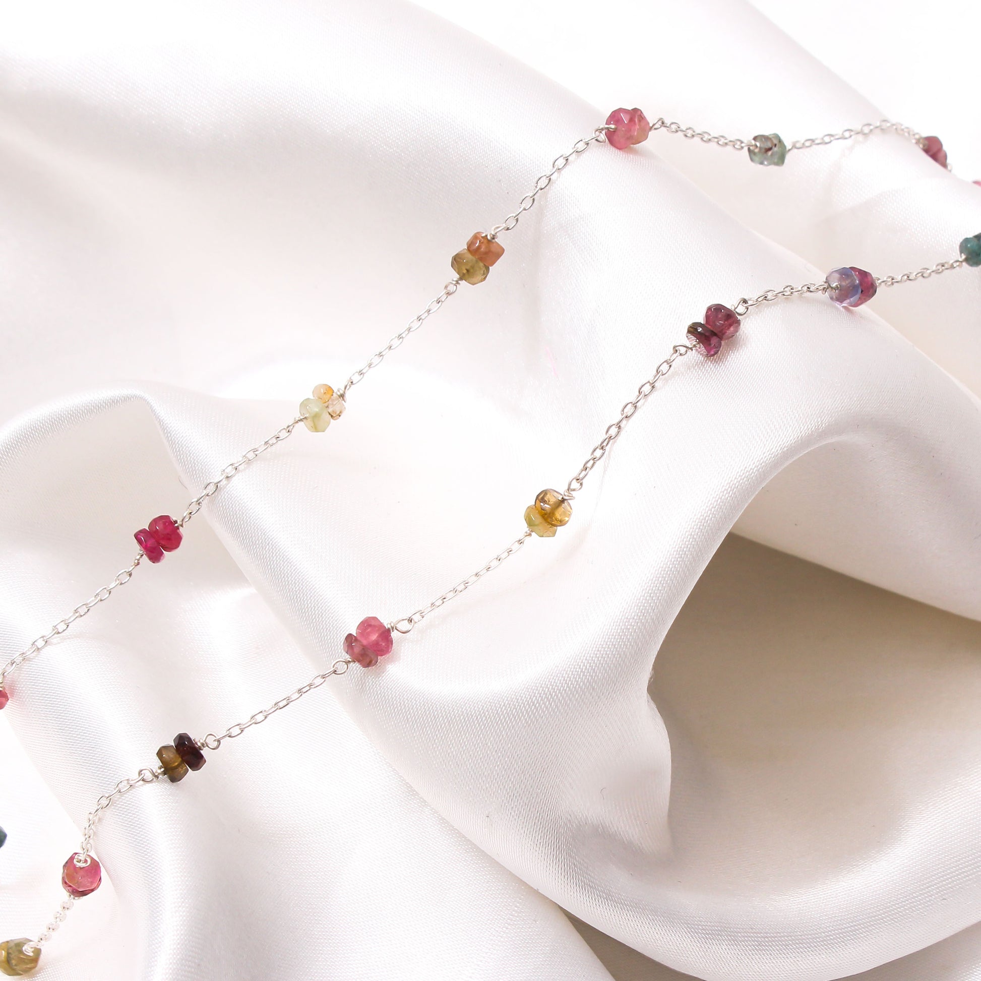 925 Sterling Silver Multi Tourmaline Beaded Chain Necklace – Delicate Multicolor Gemstone Jewelry