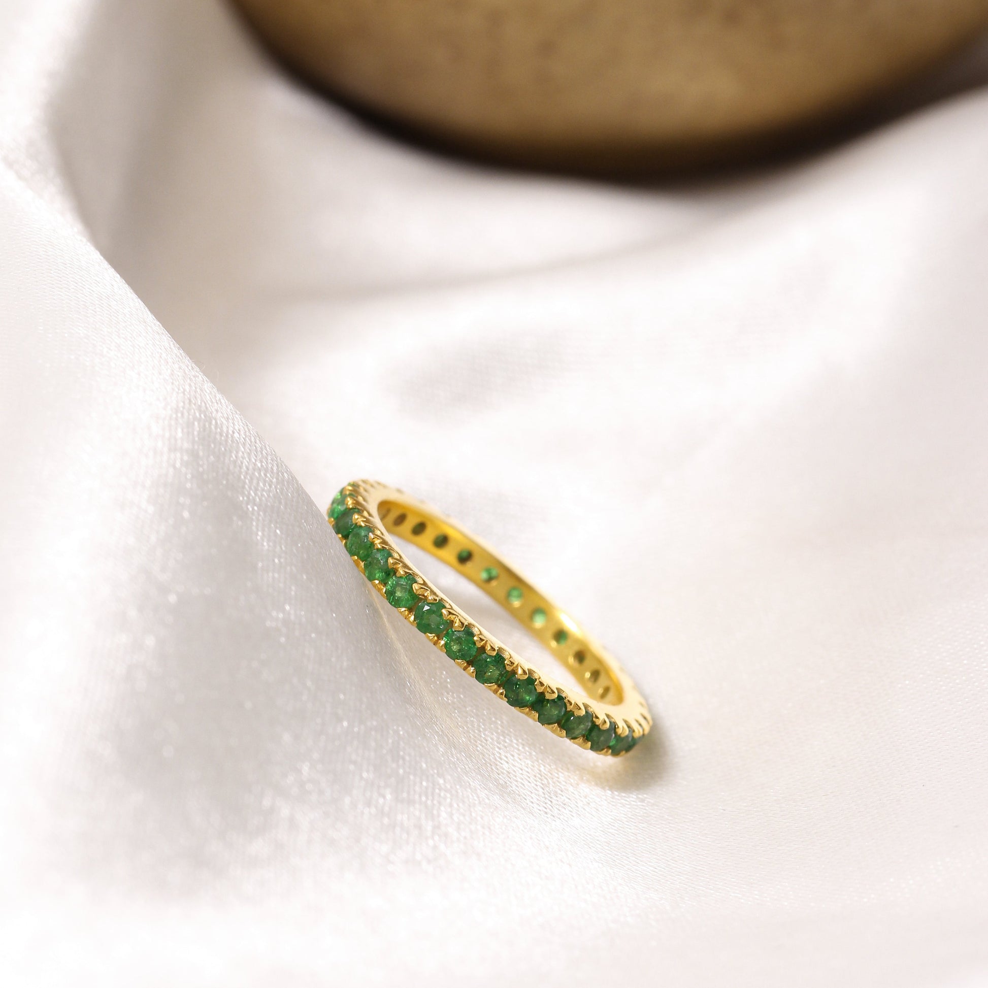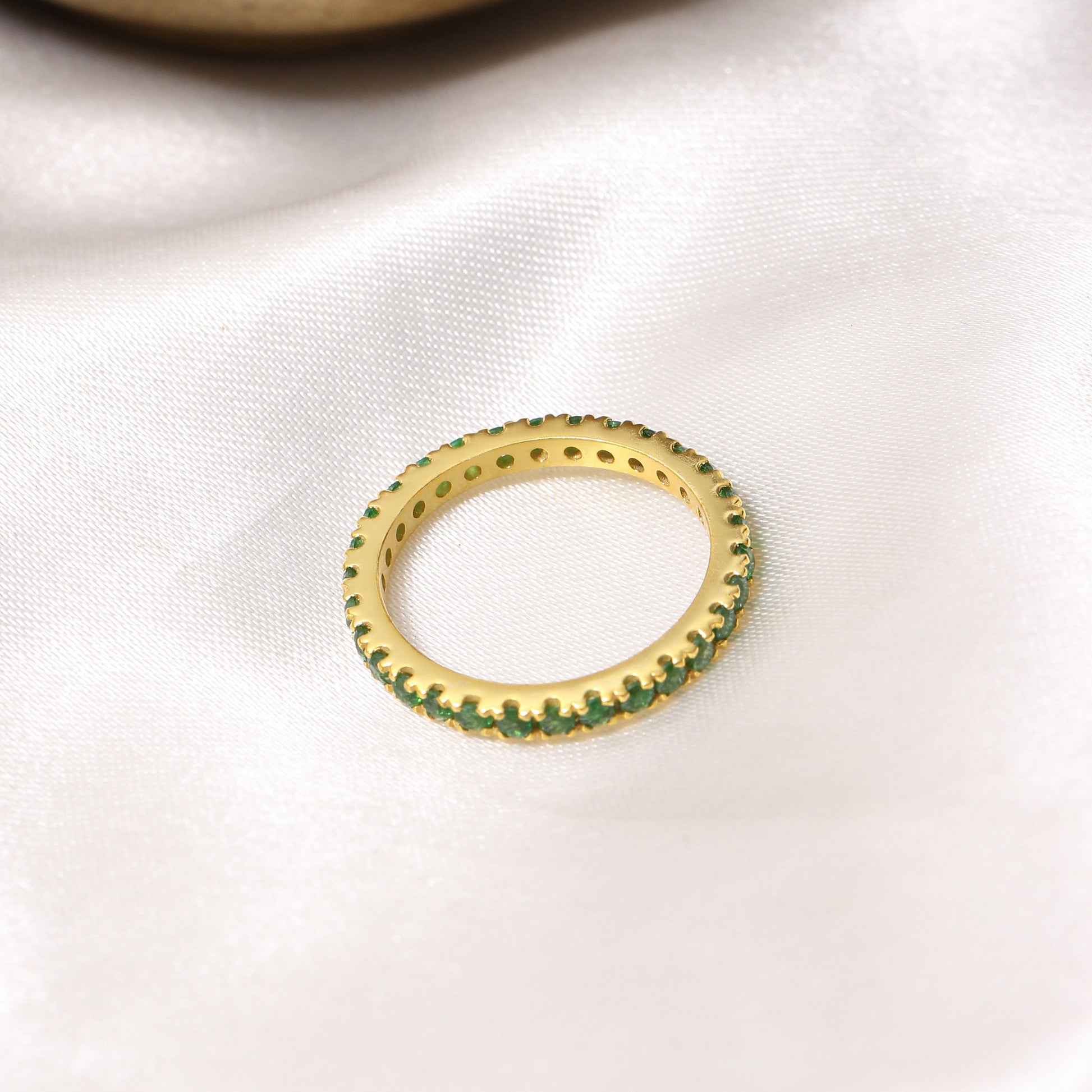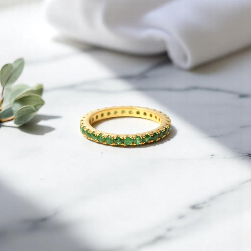 Add a touch of refreshing elegance to your look with this stunning eternity band featuring natural chrome diopside gemstones. Set in 925 sterling silver, this minimalist ring is perfect for stacking or wearing solo for a refined statement.