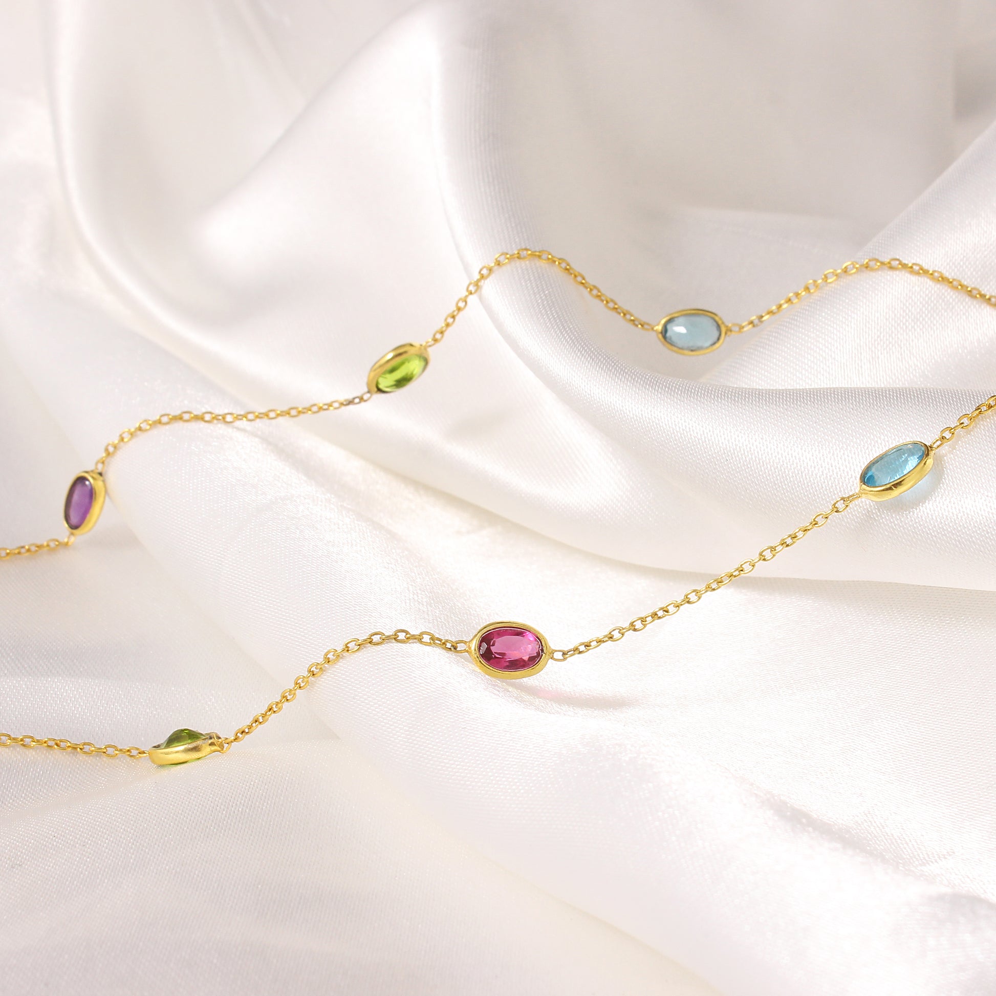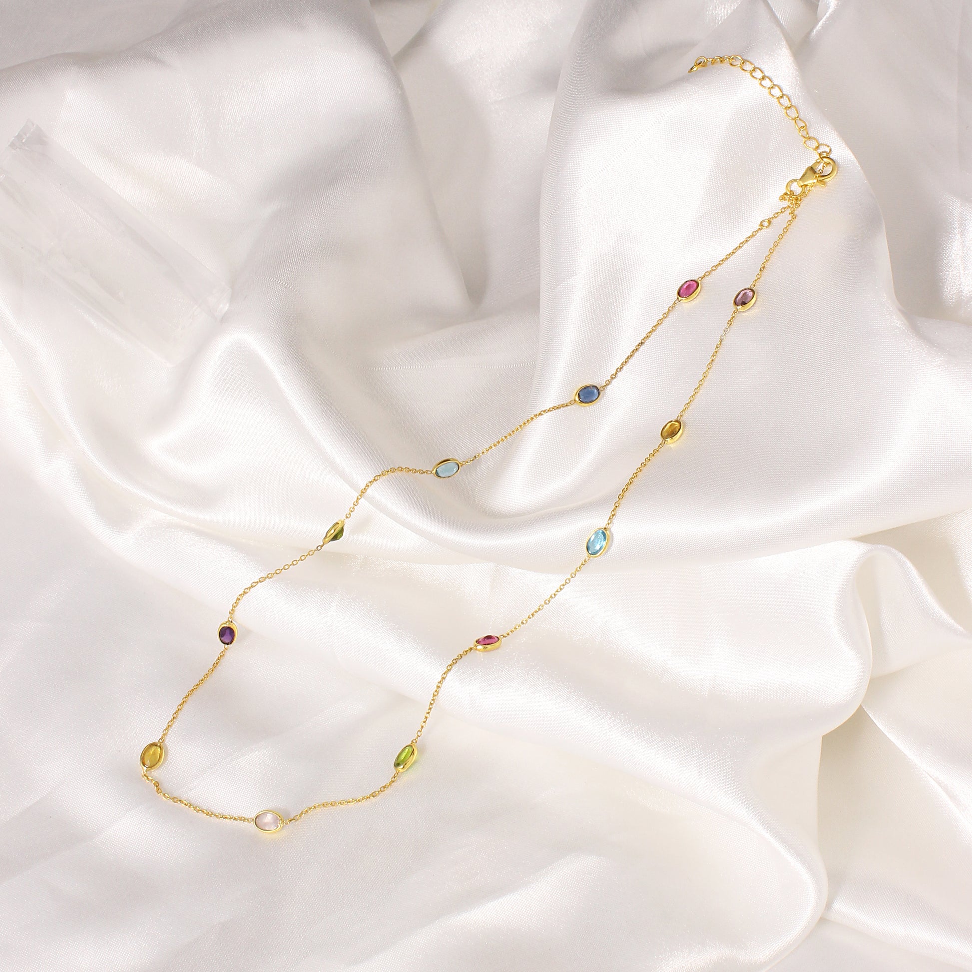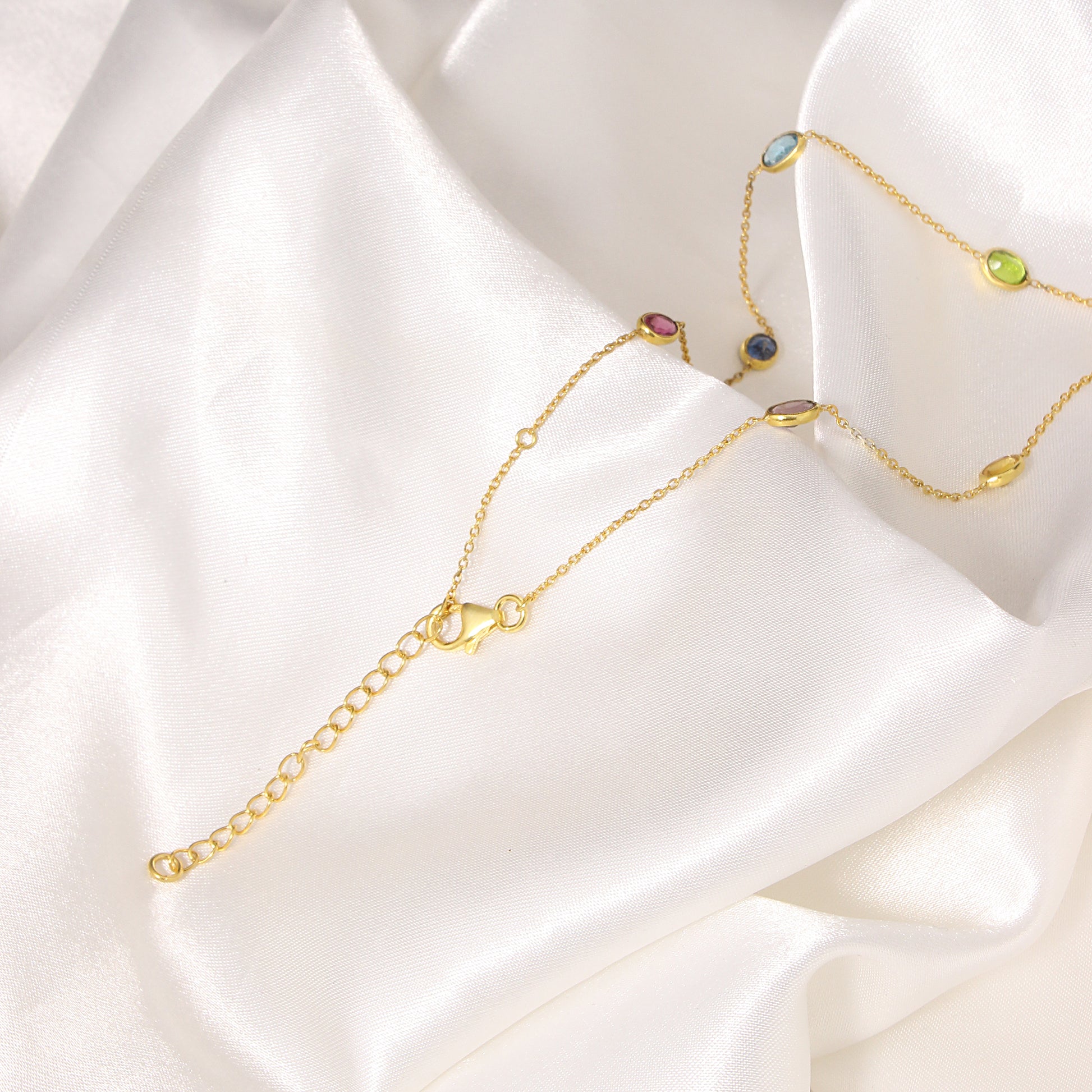 925 Sterling Silver Natural Multi-Stone Chain Necklace – Elegant Gemstone Jewelry
