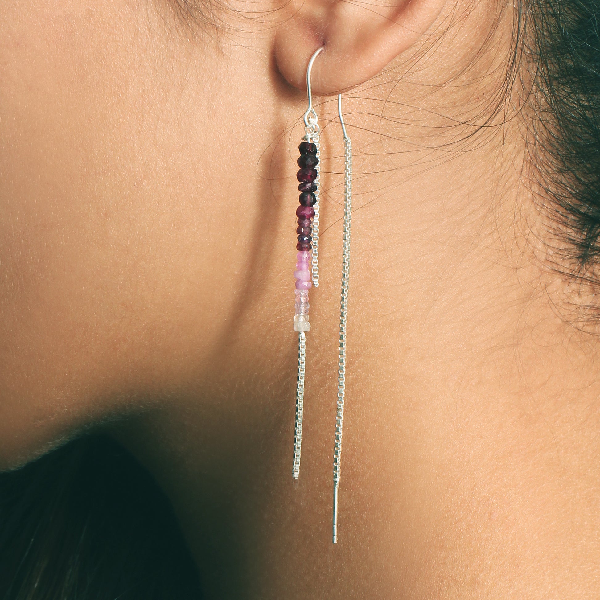 925 Sterling Silver Shaded Pink Ruby Threader Earrings | Ombre Beaded Long Chain Earrings
