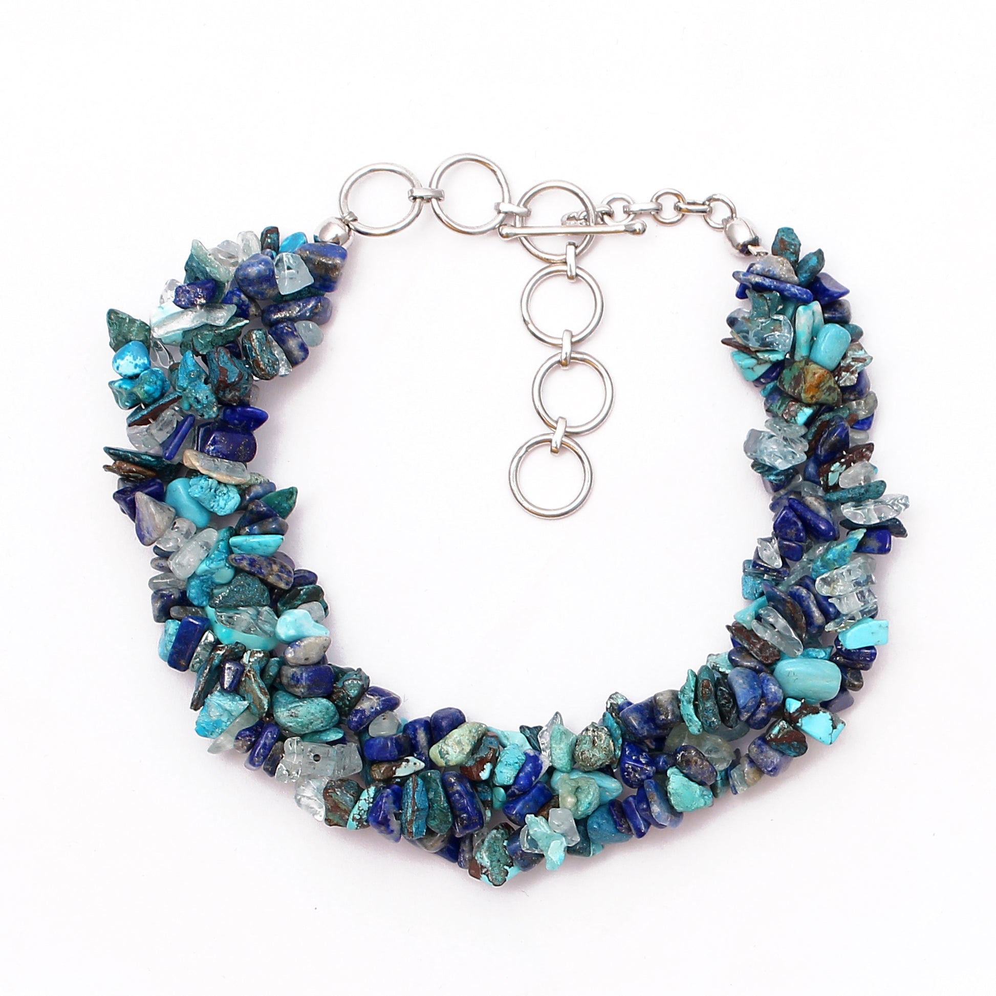 - Dazzling blue gemstones: Uncut chips of aquamarine, lapis, and aquamarine add a touch of elegance to any outfit.