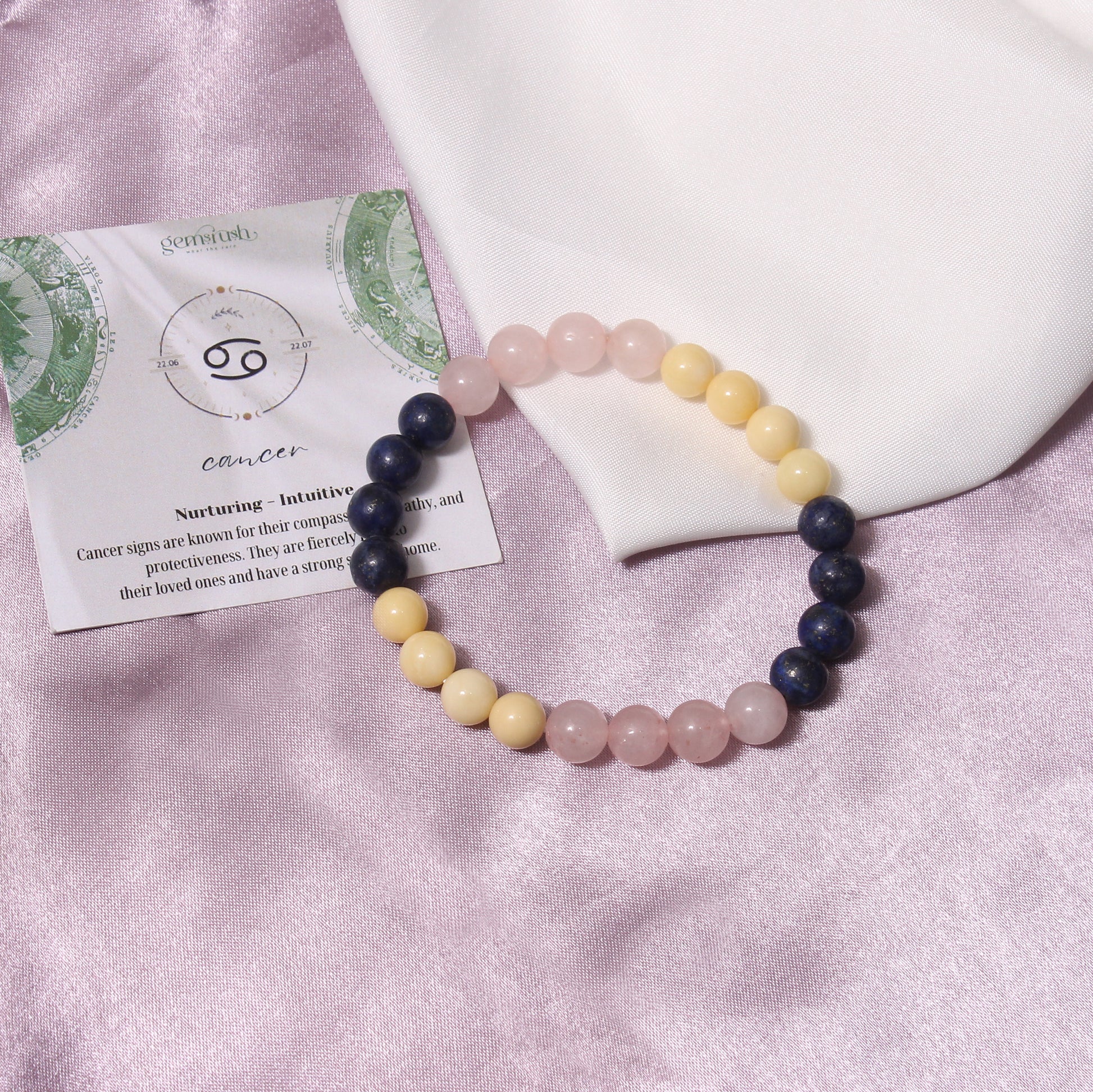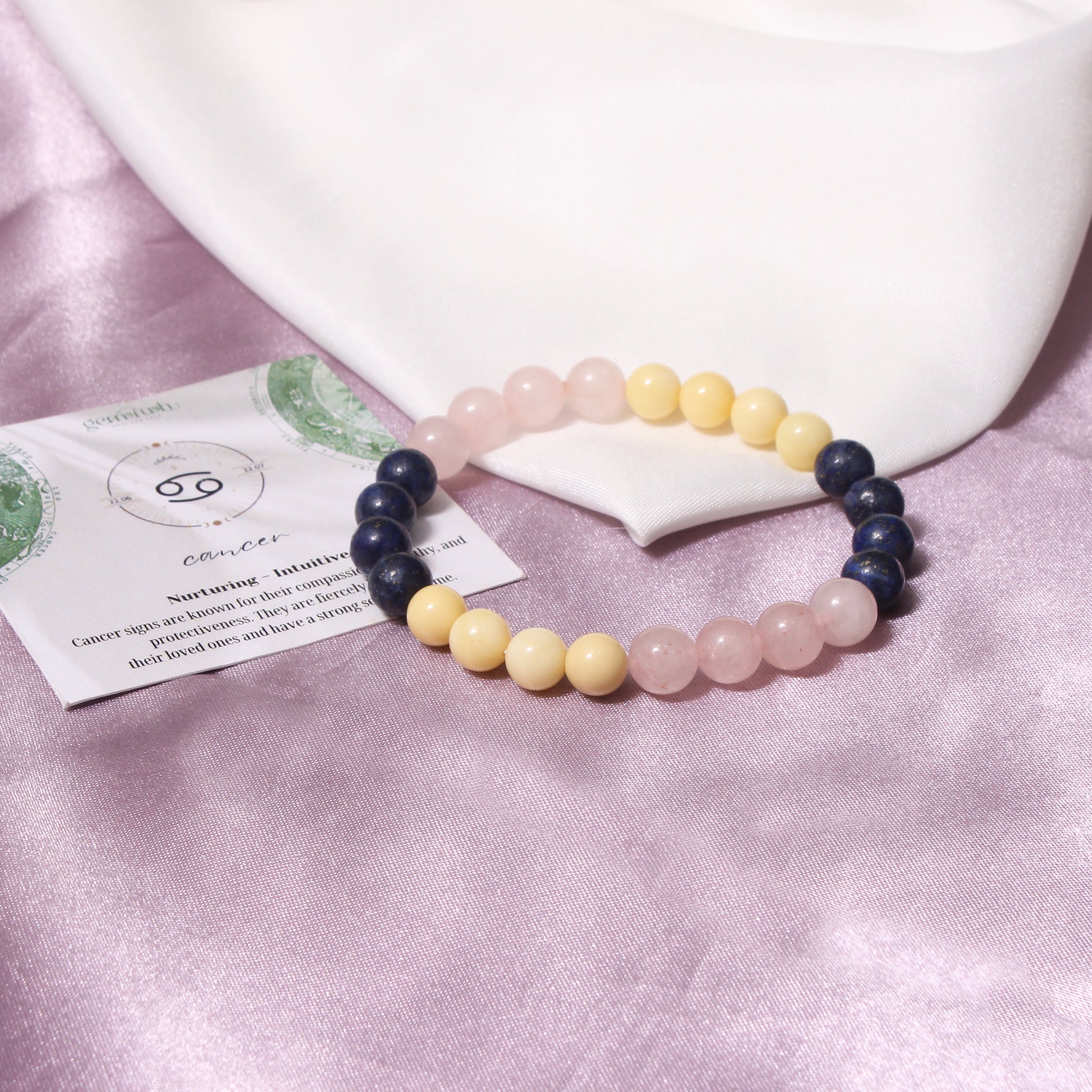 This Cancer Zodiac Bracelet is crafted to align with Cancer's nurturing and intuitive energy. Rose Quartz fosters love and emotional healing, Lapis Lazuli enhances wisdom and self-expression, while Yellow Jade promotes happiness and protection. A stylish and meaningful accessory, it helps Cancer individuals balance their emotions, strengthen intuition, and radiate positivity.