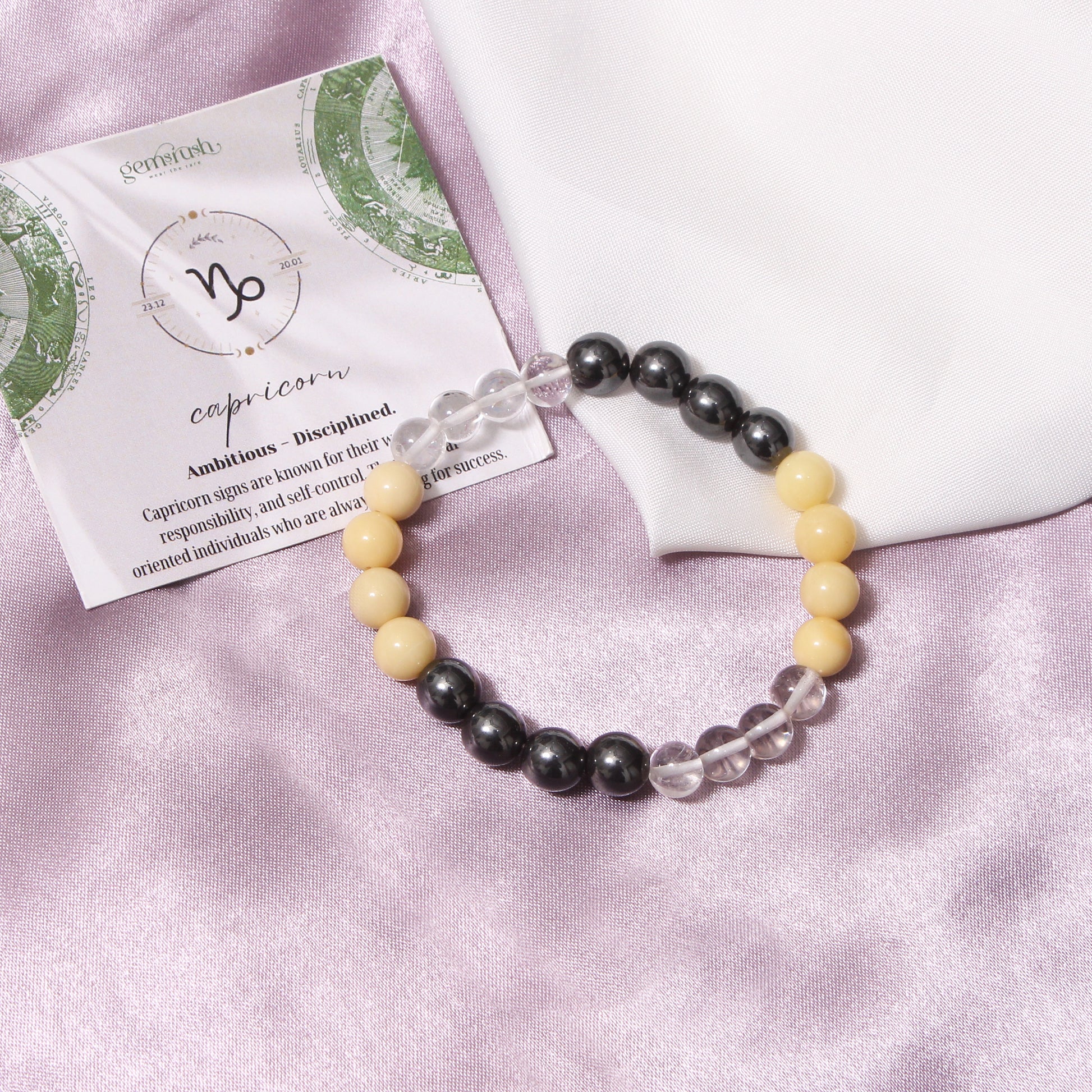 This Capricorn Zodiac Sign Bracelet is crafted to resonate with Capricorn's ambitious and disciplined nature. Featuring Hematite for grounding and focus, Yellow Jade for positivity and confidence, and Clear Quartz for clarity and balance, this bracelet empowers responsibility, enhances determination, and supports success-oriented individuals striving for greatness.