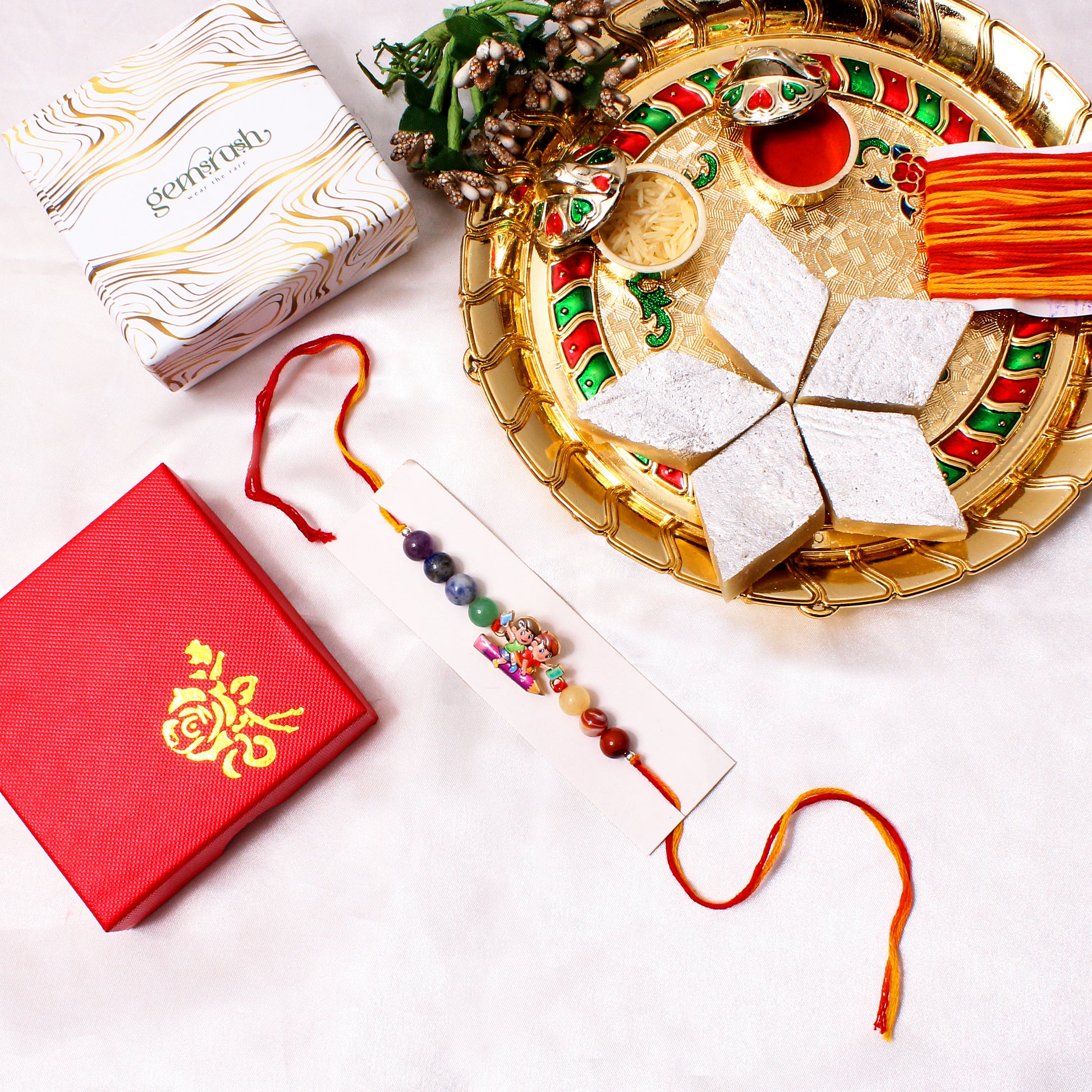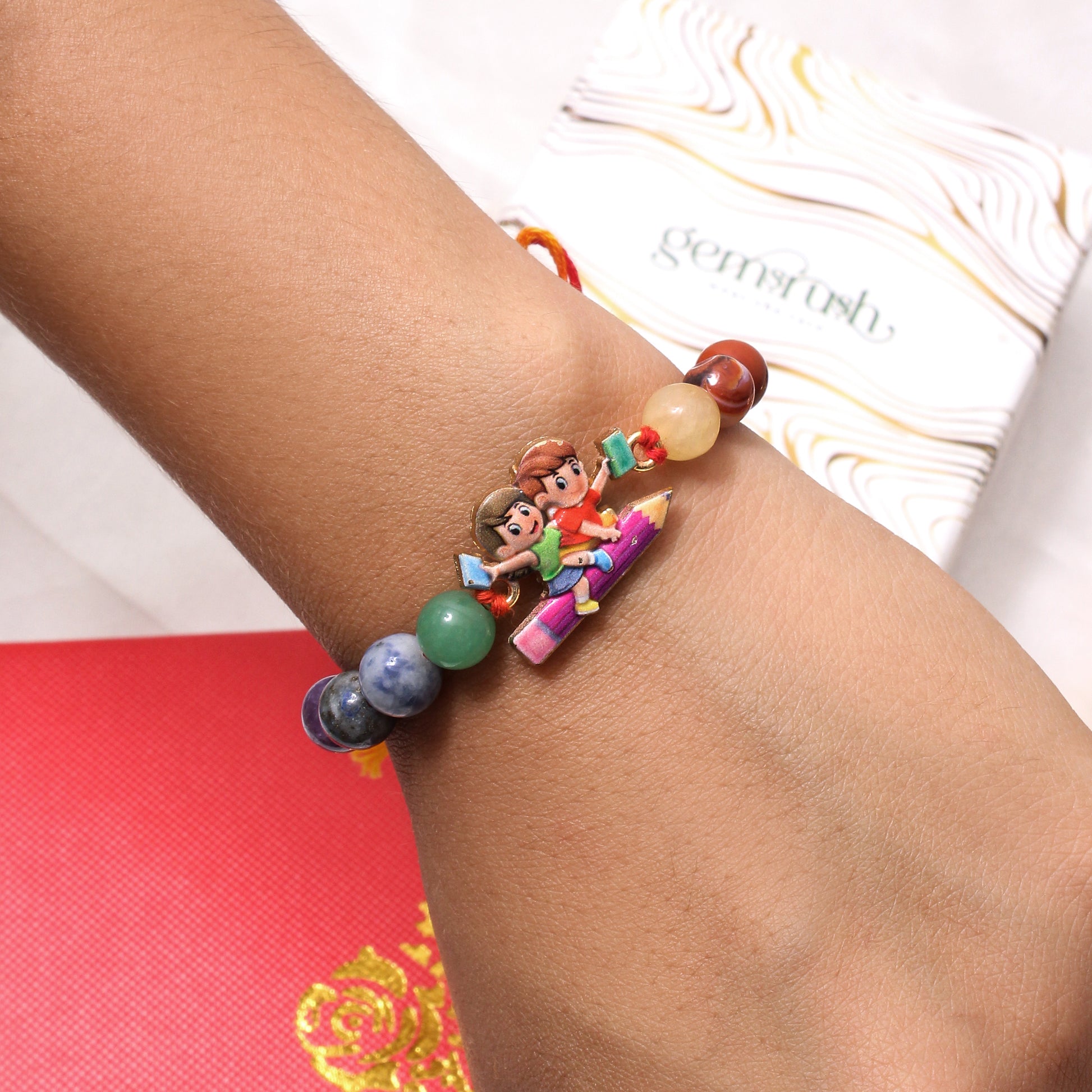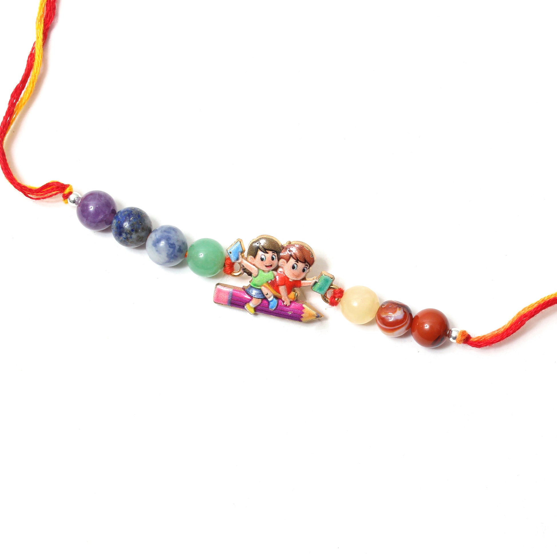 Make Raksha Bandhan extra fun and meaningful with this vibrant gemstone rakhi featuring an adorable school-themed charm. Crafted with amethyst, lapis lazuli, aventurine, sodalite, carnelian, yellow jade, and jasper—this rakhi supports focus, creativity, positivity, and joyful energy for your little learner!