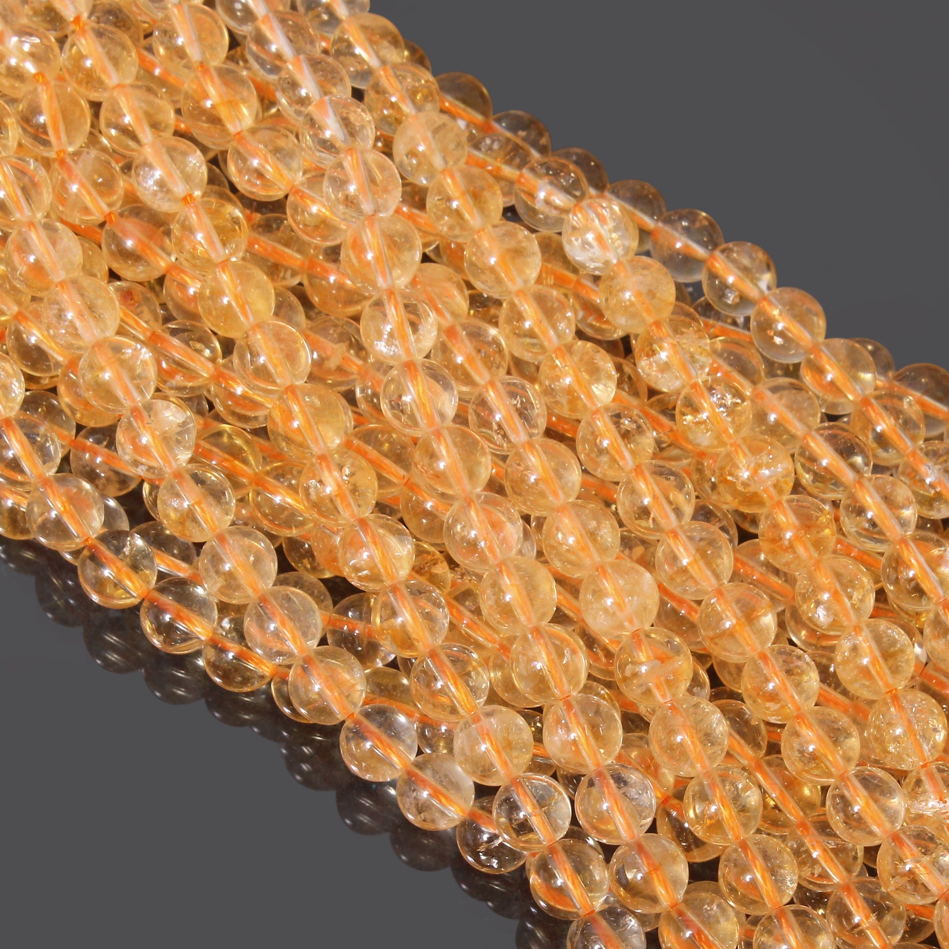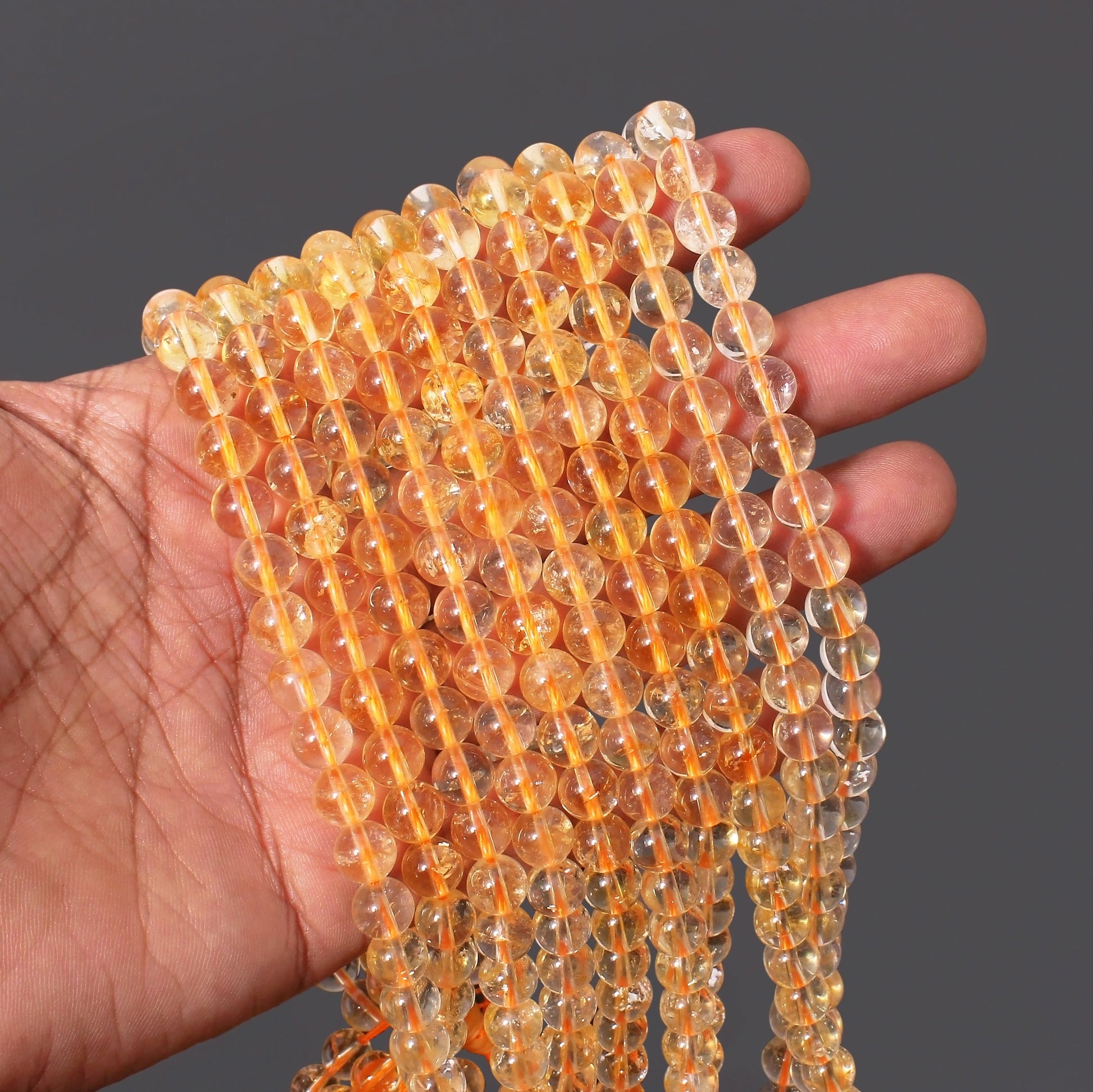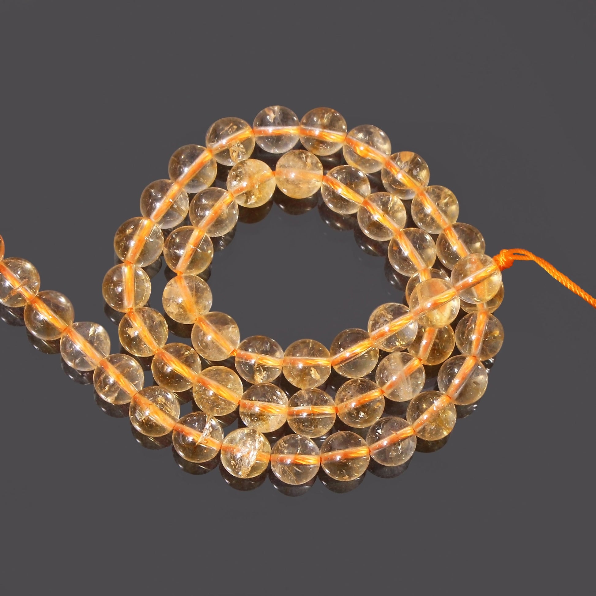 Product Details : These smooth, plain finished citrine round loose gemstones come in sizes of 8-8.5mm and have a 0.5mm drilled hole. They are strung on a double orange thread to bind them. These gemstones are perfect for making jewelry, necklaces, bracelets, and other crafts.