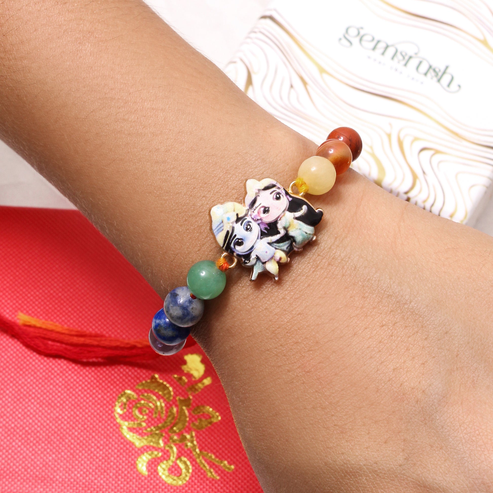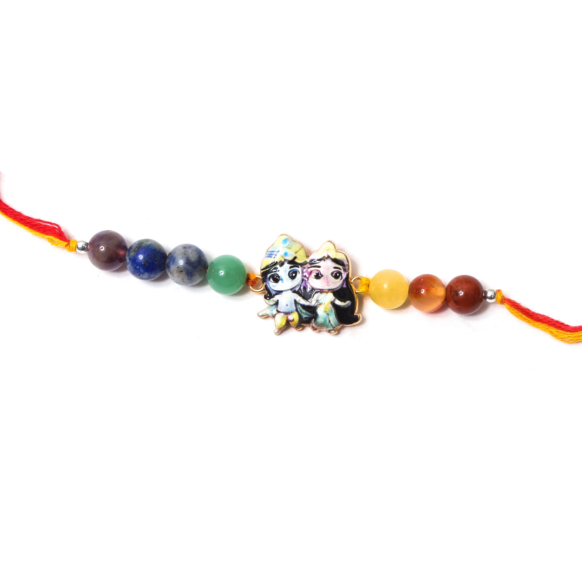 Colorful Natural Gemstone Rakhi with Krishna-Radha Cartoon Charm – Spiritual Raksha Bandhan Bracelet
