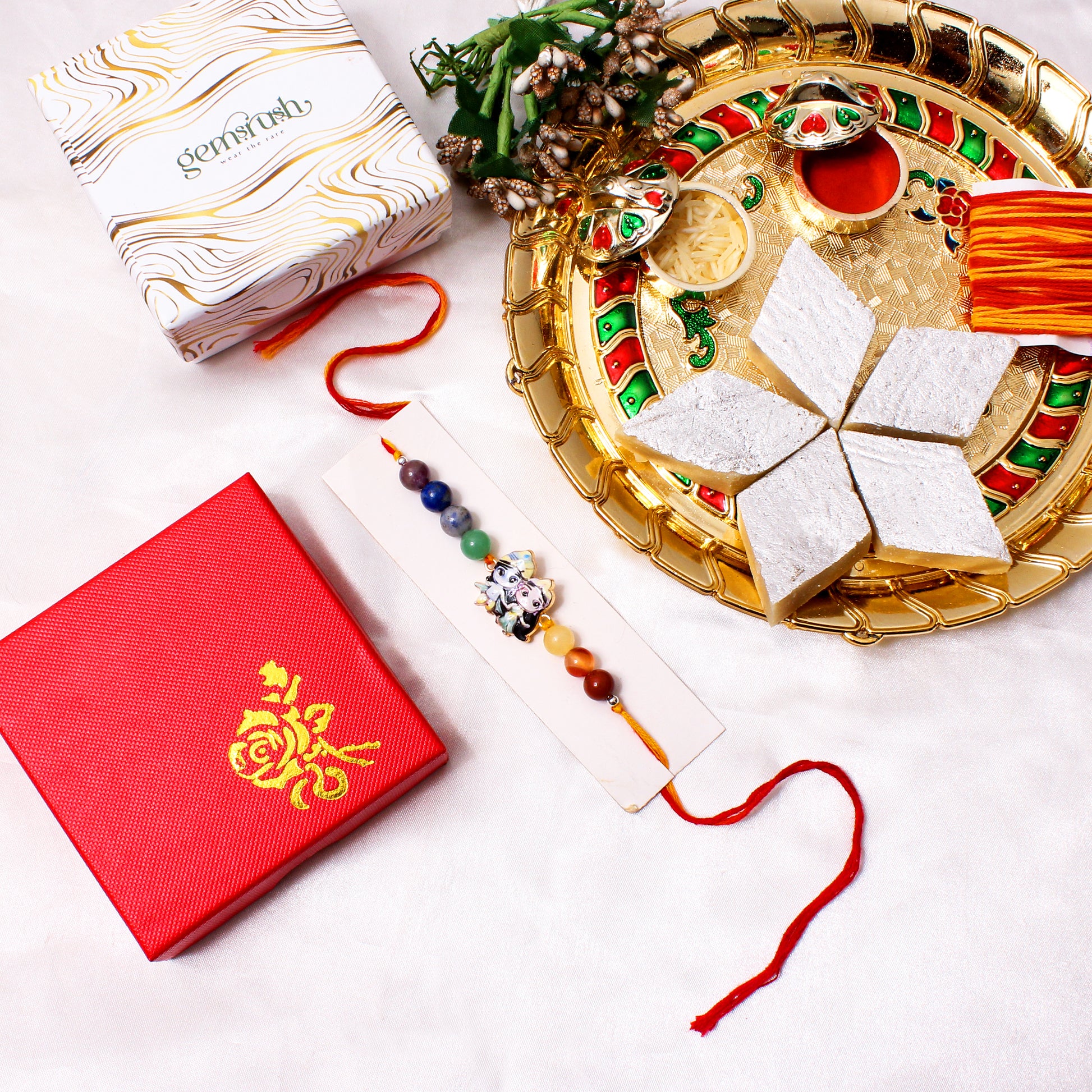 Celebrate Raksha Bandhan with love and positivity using this vibrant gemstone rakhi, featuring natural healing beads and a cute Krishna-Radha charm for divine protection, emotional balance, and joyful bonding. Ideal for brothers of all ages.