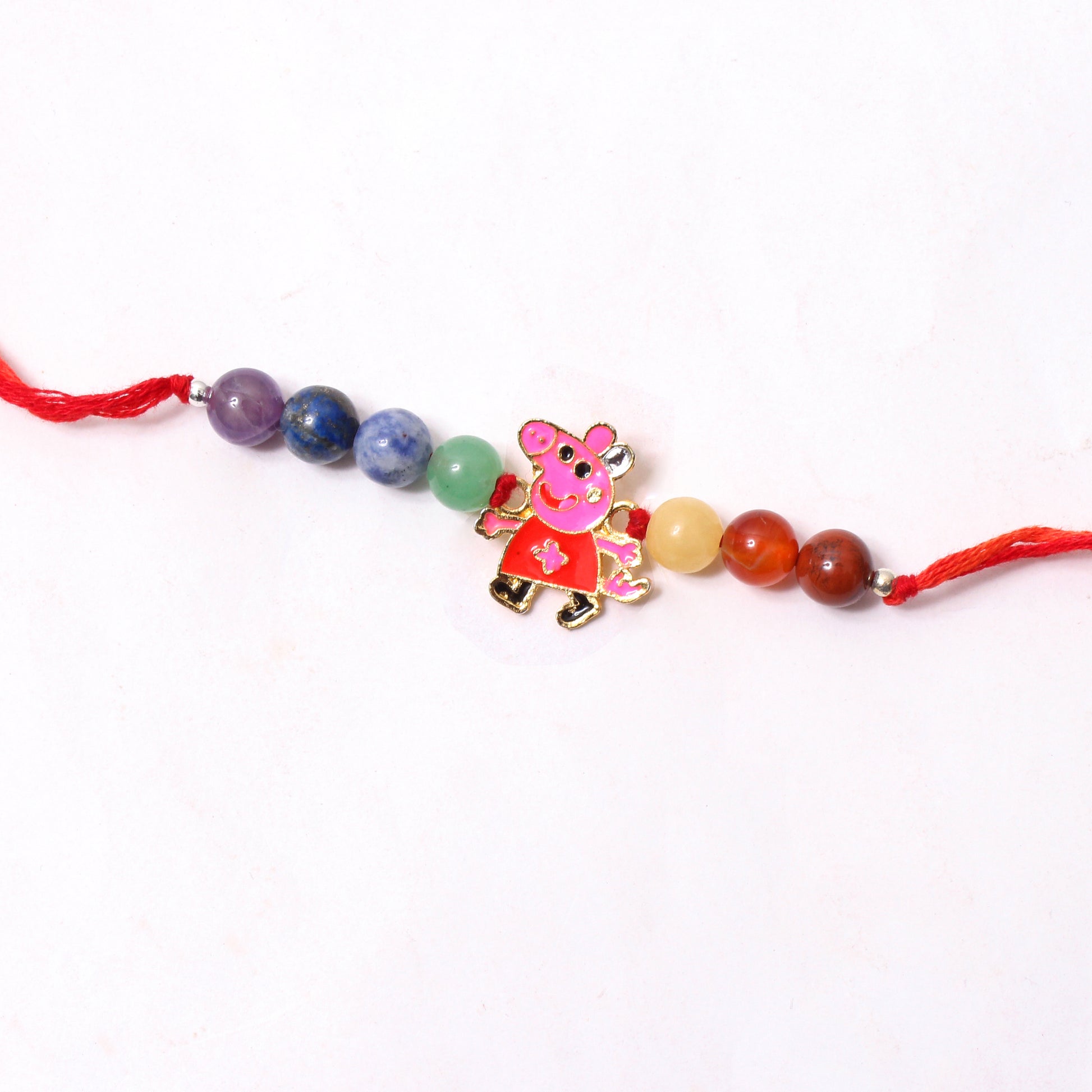 Colorful Natural Gemstone Rakhi with Peppa Pig Cartoon Charm – Fun & Healing Rakhi for Kids