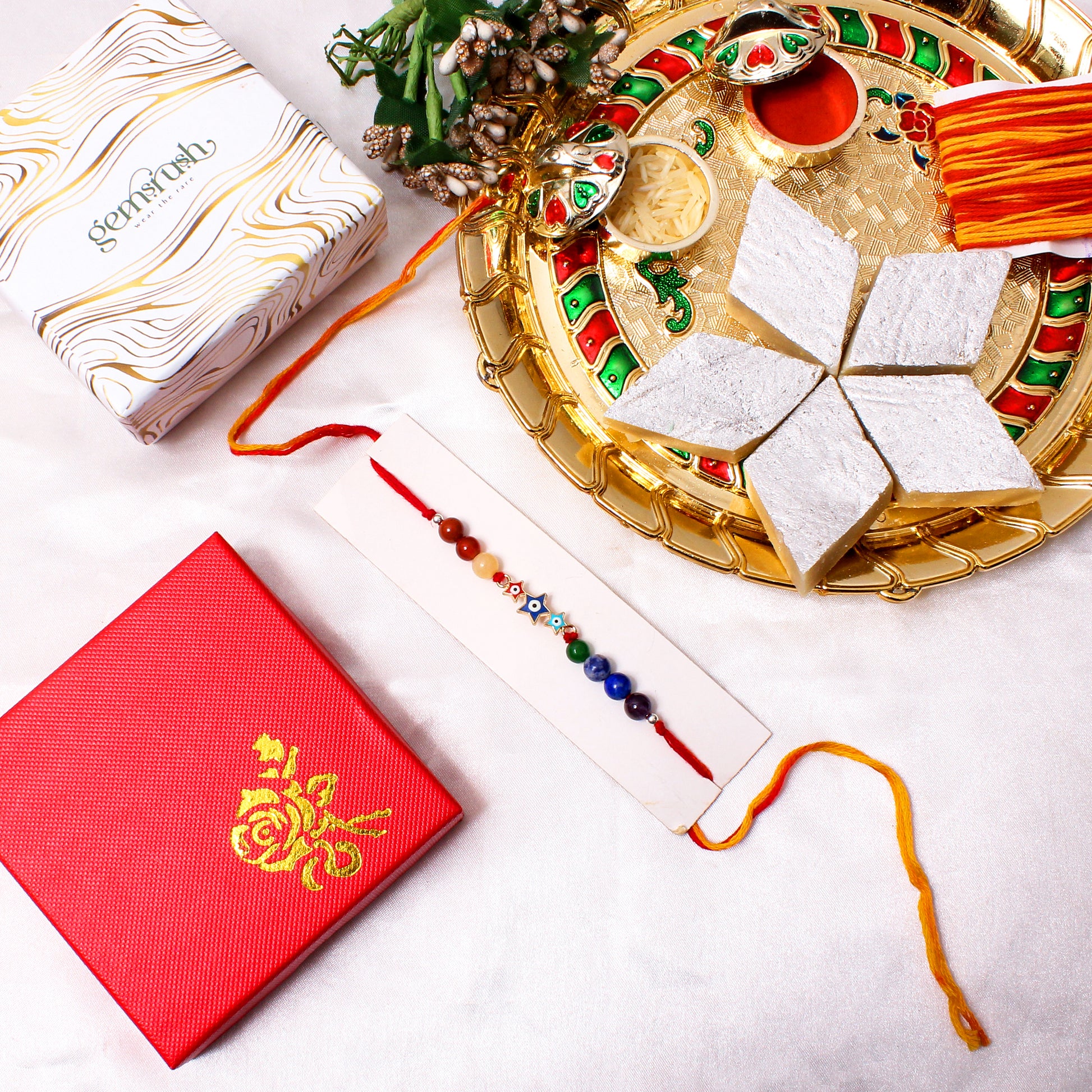 Celebrate the bond of protection with this unique Star Evil Eye Rakhi, beautifully handcrafted with multicolor gemstones. The vibrant star-shaped evil eye charms are believed to ward off negativity and bring positive energy, while the natural gemstones promote healing and balance. A perfect Rakhi for your brother that’s full of color, meaning, and love.