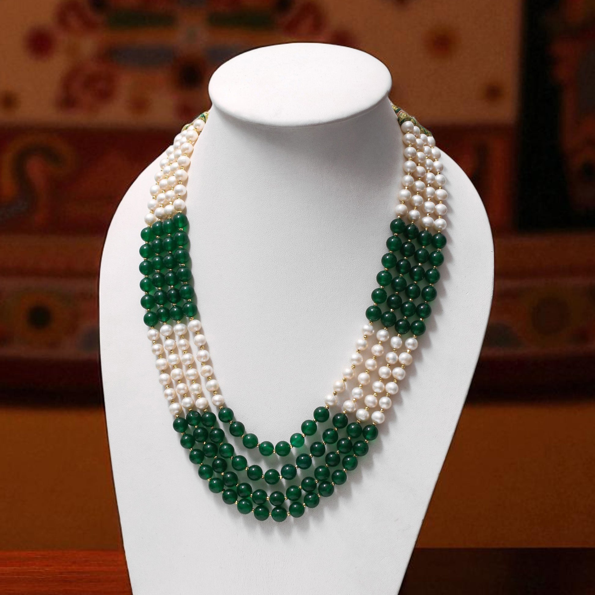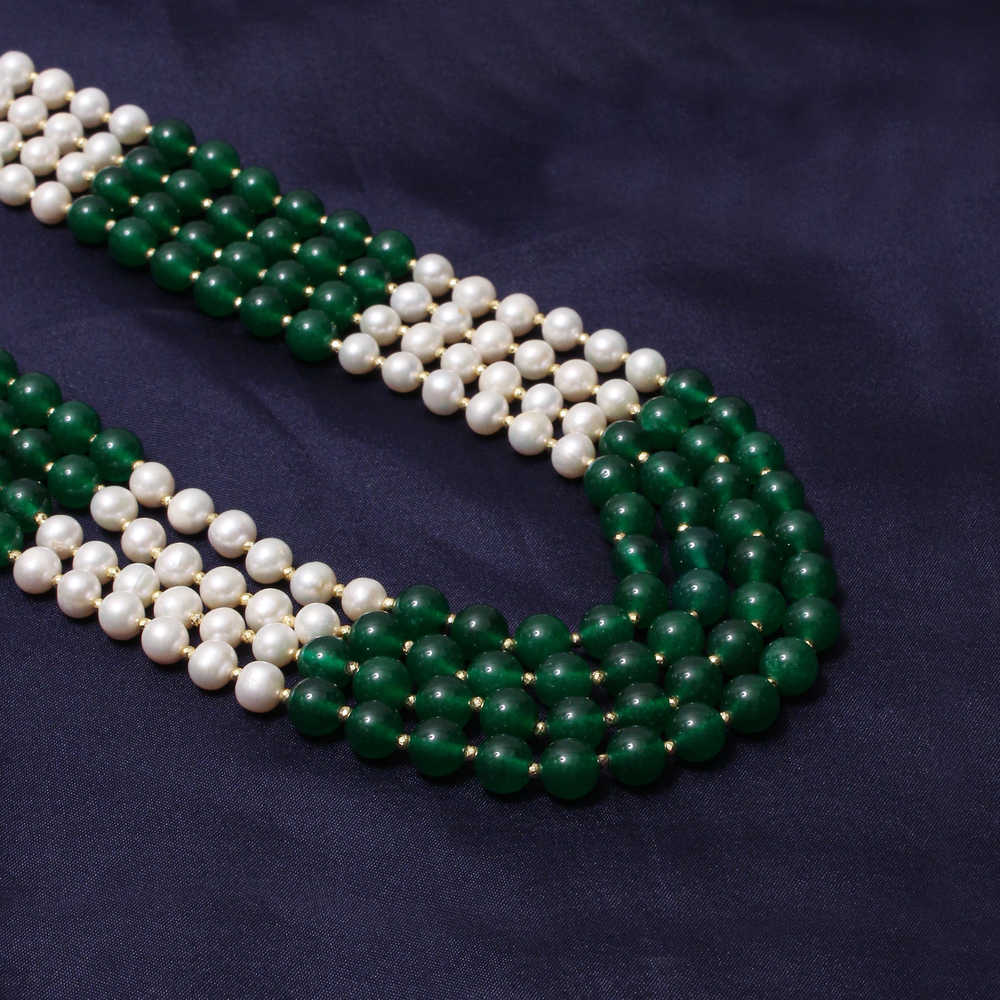 ITEM: Elegant 4-Layer Green Jade, Pearl & Pyrite Sarafa Necklace
