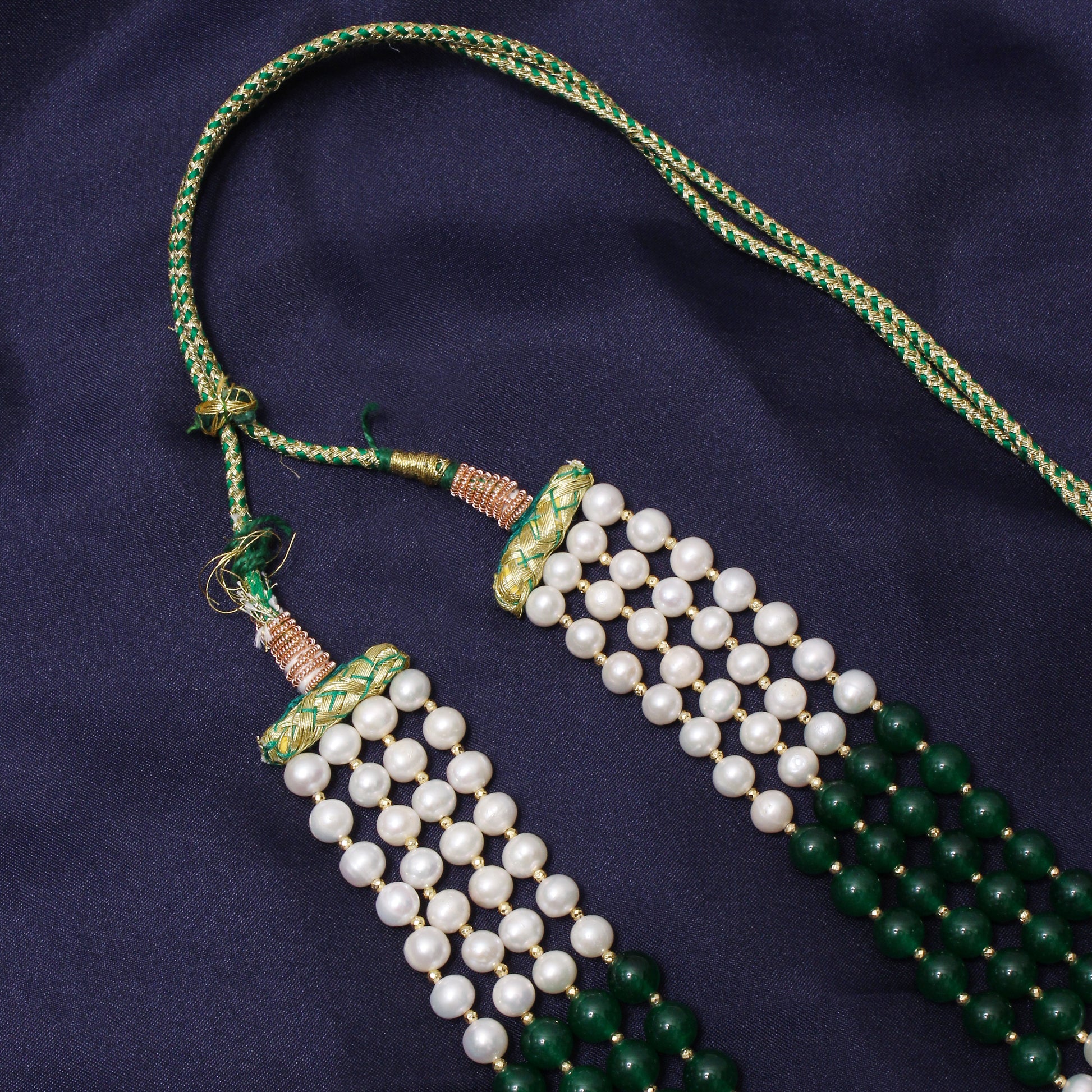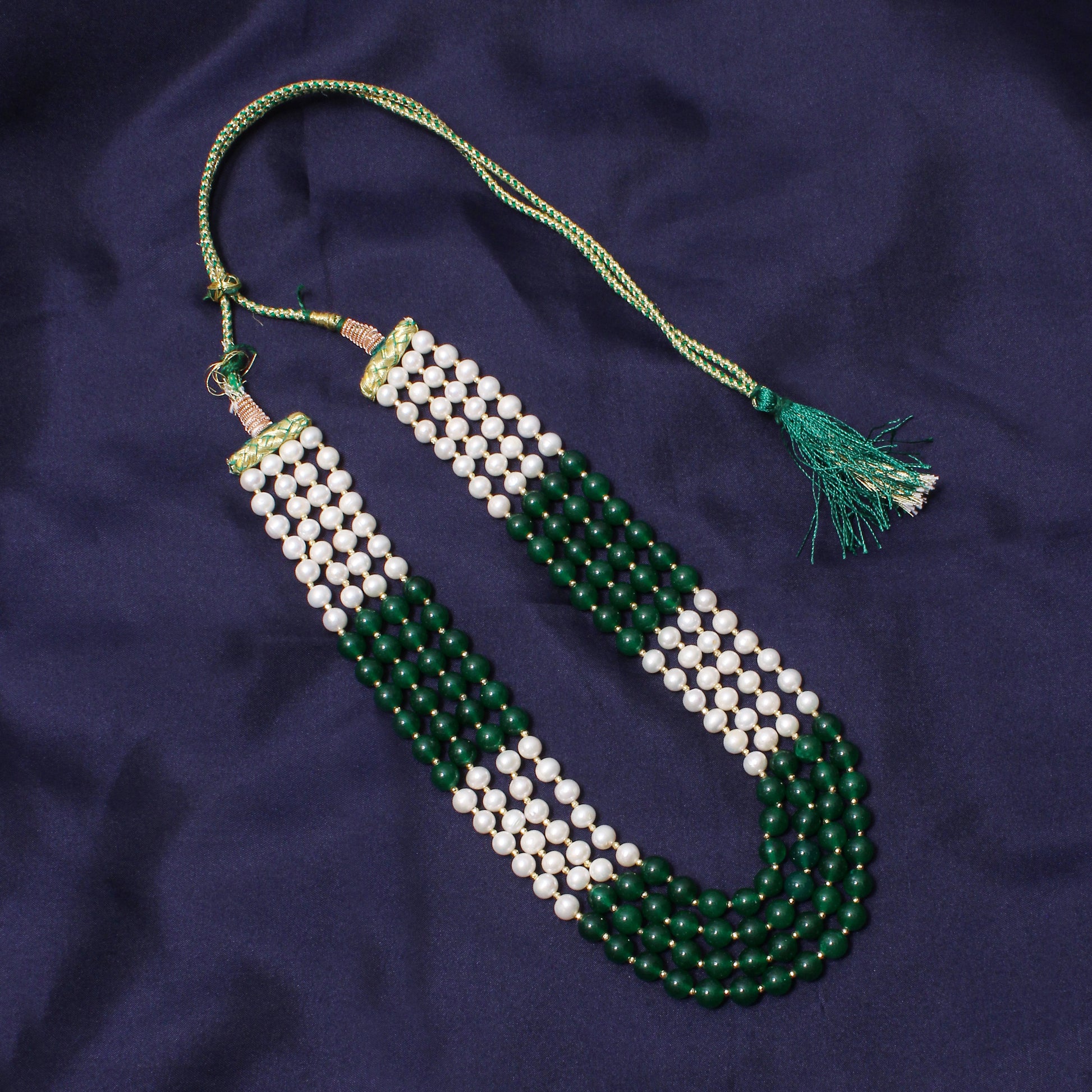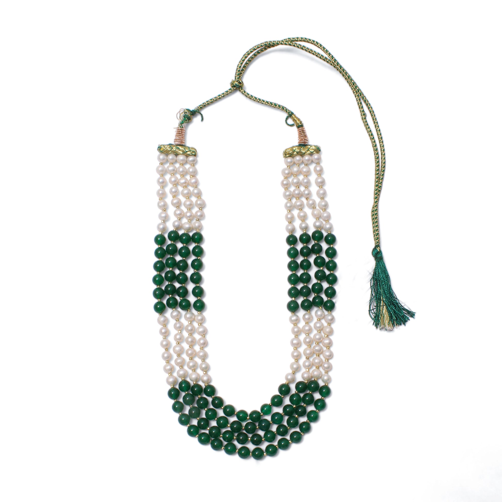 Elegant 4-Layer Green Jade, Pearl & Pyrite Sarafa Necklace – Timeless Ethnic Luxury