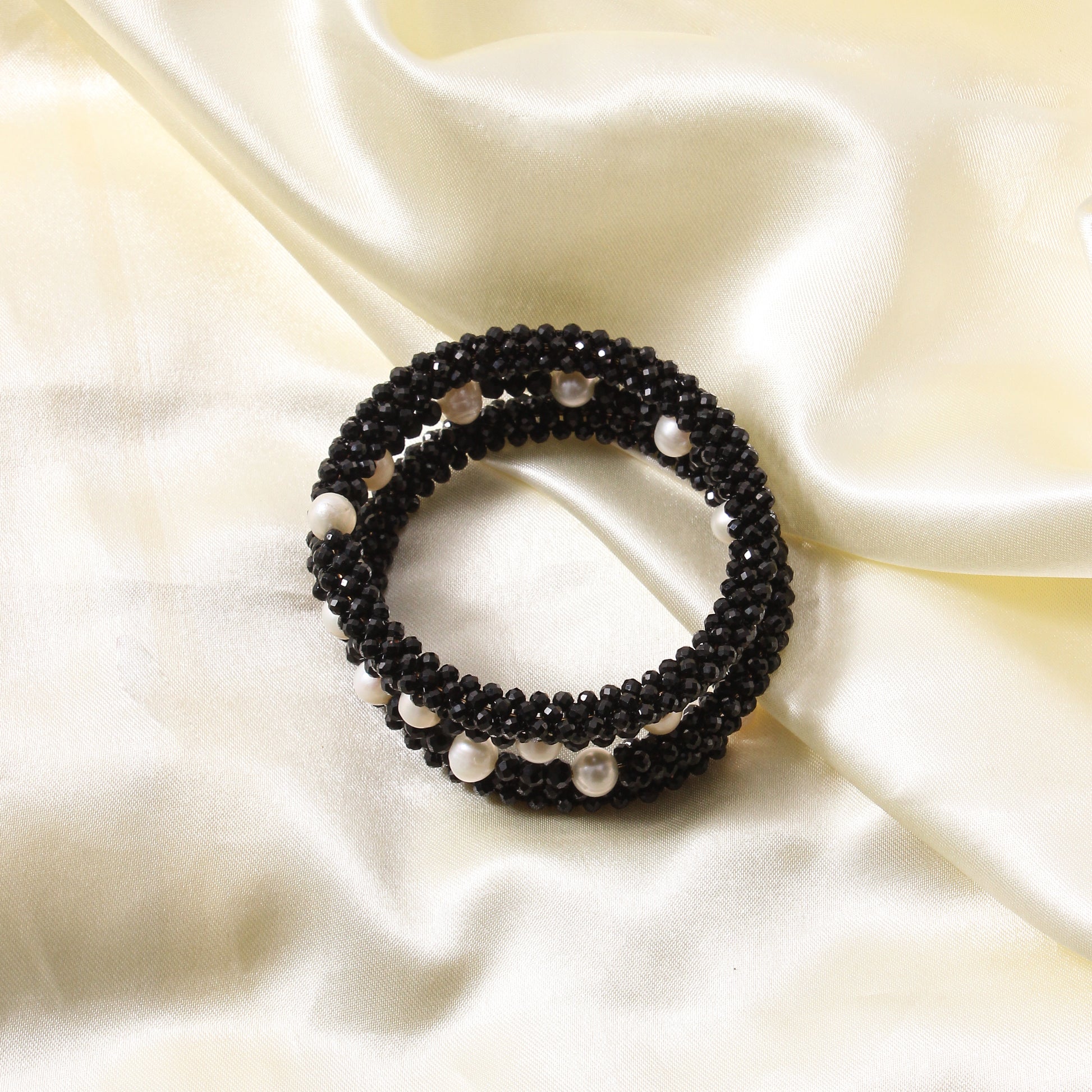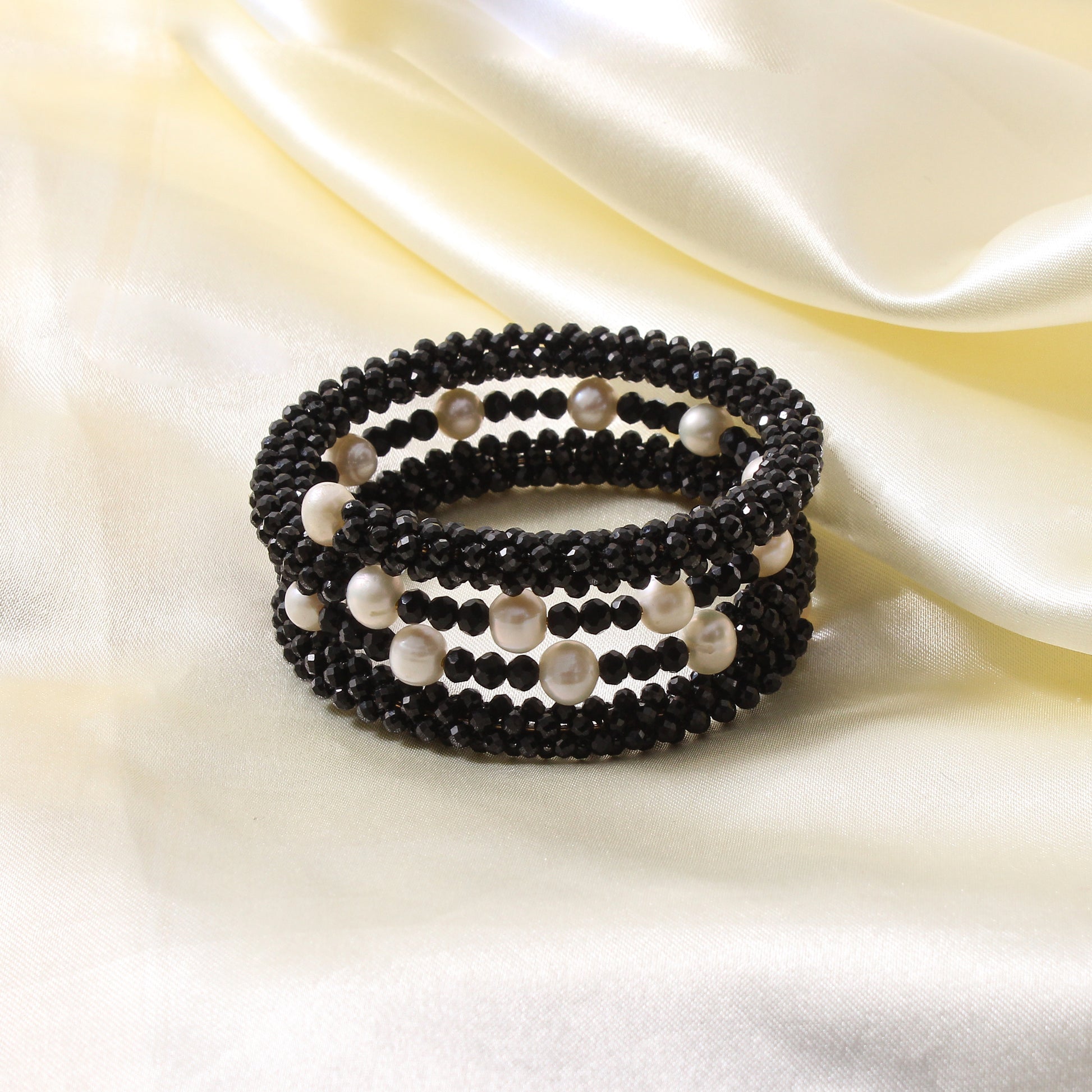 Elegant Natural Black Spinel & Pearl Wrap Style Beaded Bangle – Handmade Stretch Bracelet
