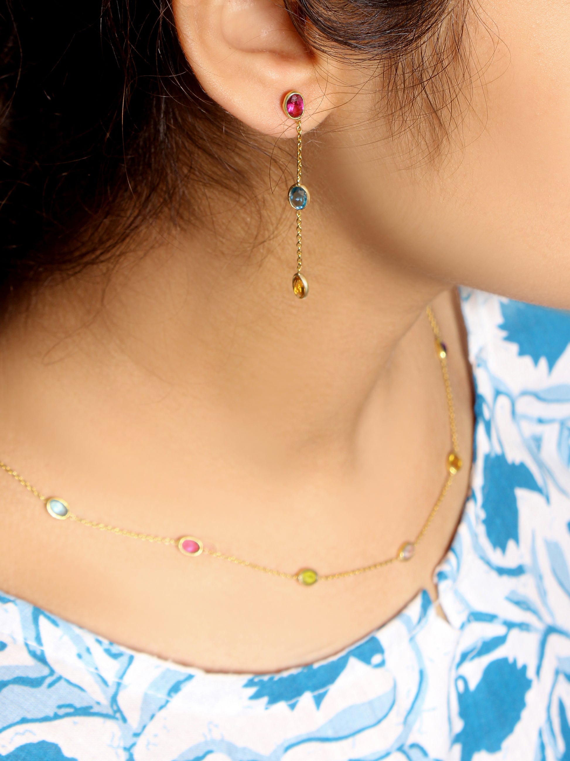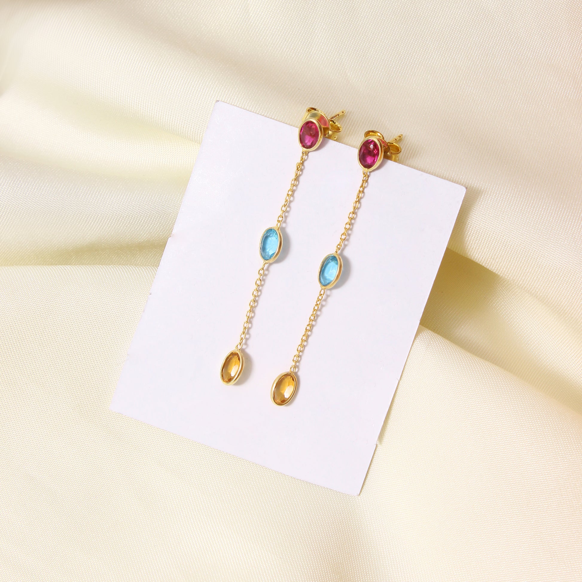 Elevate your everyday style with these graceful triple gemstone earrings, featuring the joyful glow of Citrine, heart-opening Pink Tourmaline Quartz, and soothing Swiss Blue Quartz. The delicate gold-plated chain drop design adds a refined, feminine charm—ideal for healing energy lovers and fashion-forward spirits alike.