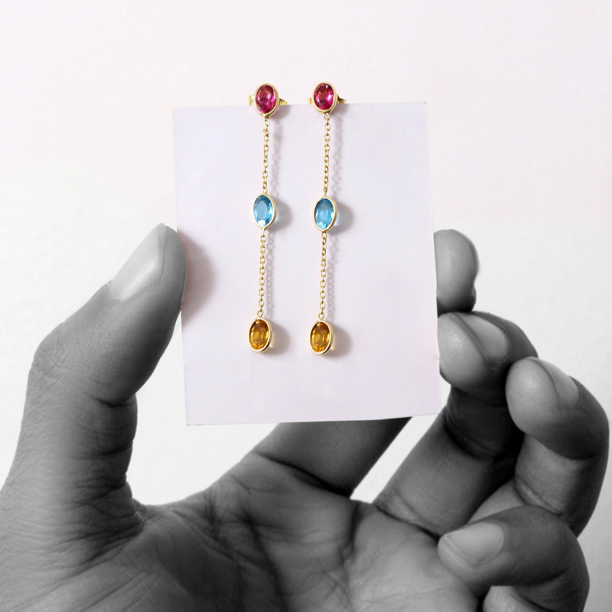 Elegant Natural Citrine, Pink Tourmaline Quartz & Swiss Blue Quartz Drop Earrings – 3-Stone Dangle Earrings
