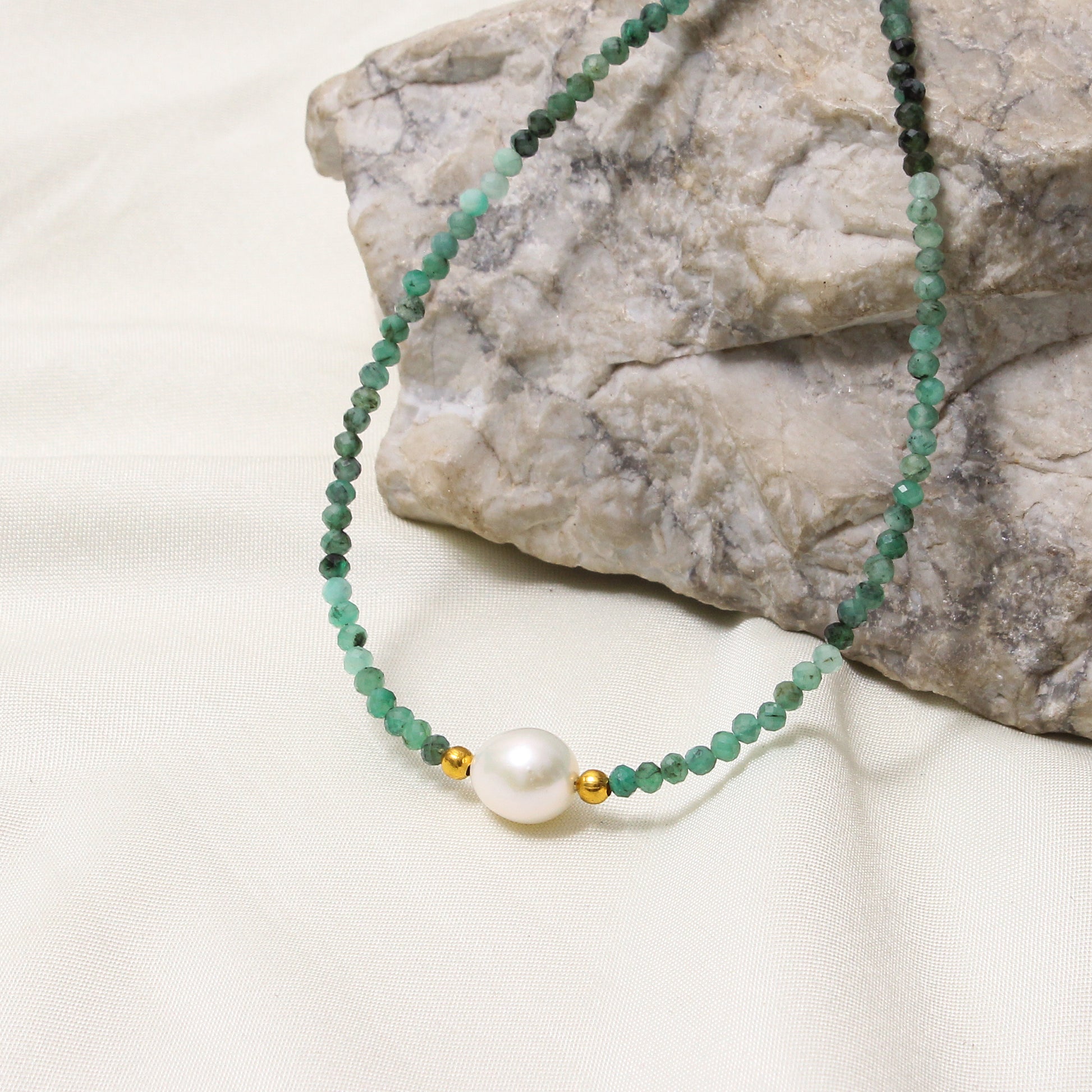 This handcrafted necklace features radiant emerald beads paired with a lustrous pearl centerpiece, symbolizing wisdom, prosperity, and inner harmony. Emerald promotes emotional balance and renewal, while pearl brings calming energy and timeless elegance—making it perfect for both healing and style.