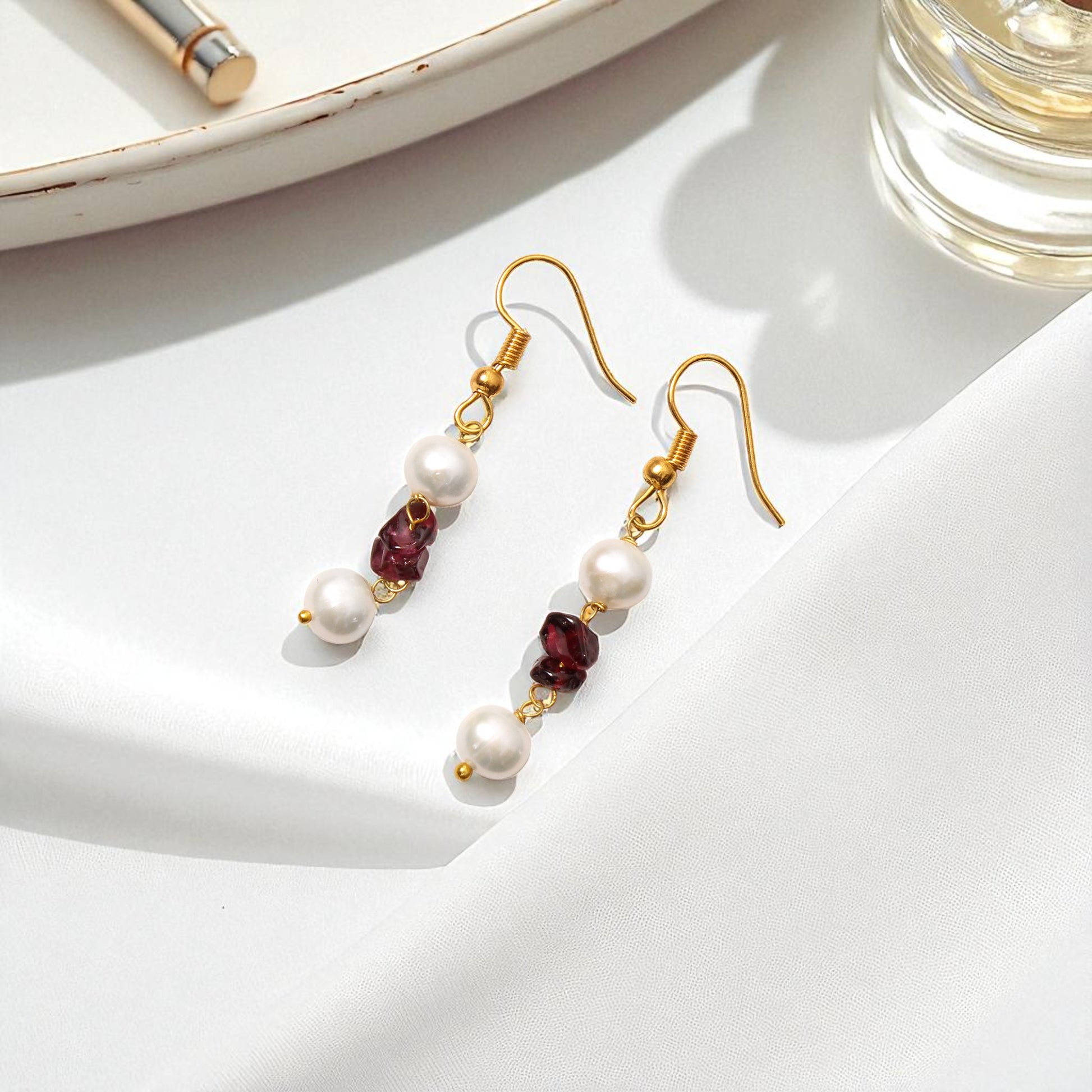 Elegant Natural Pearl & Garnet Drop Earrings – Natural Gemstone Jewelry for Love, Wisdom & Grace