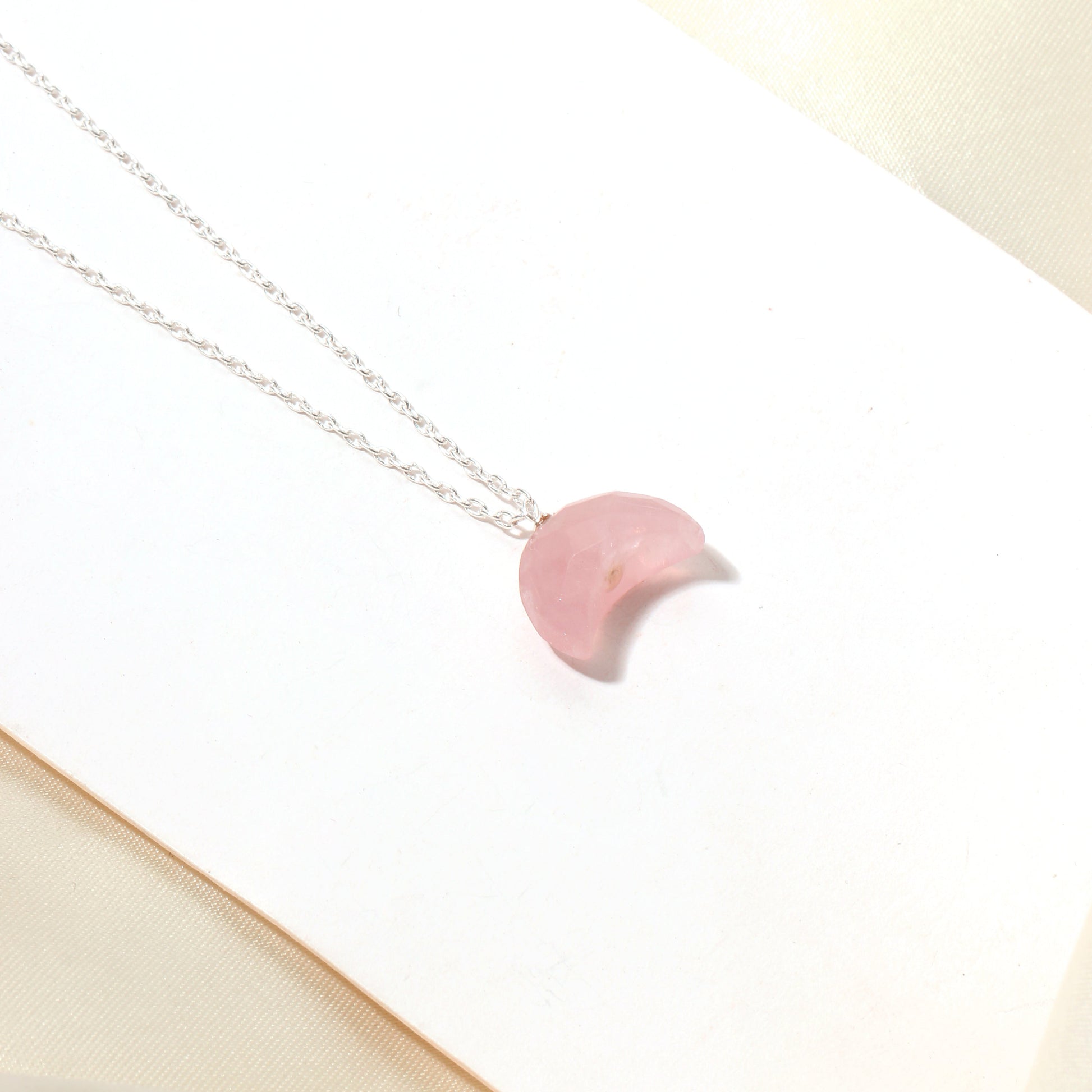 Elegant Rose Quartz Crescent Moon Pendant Necklace – 925 Sterling Silver Chain for Love & Emotional Healing