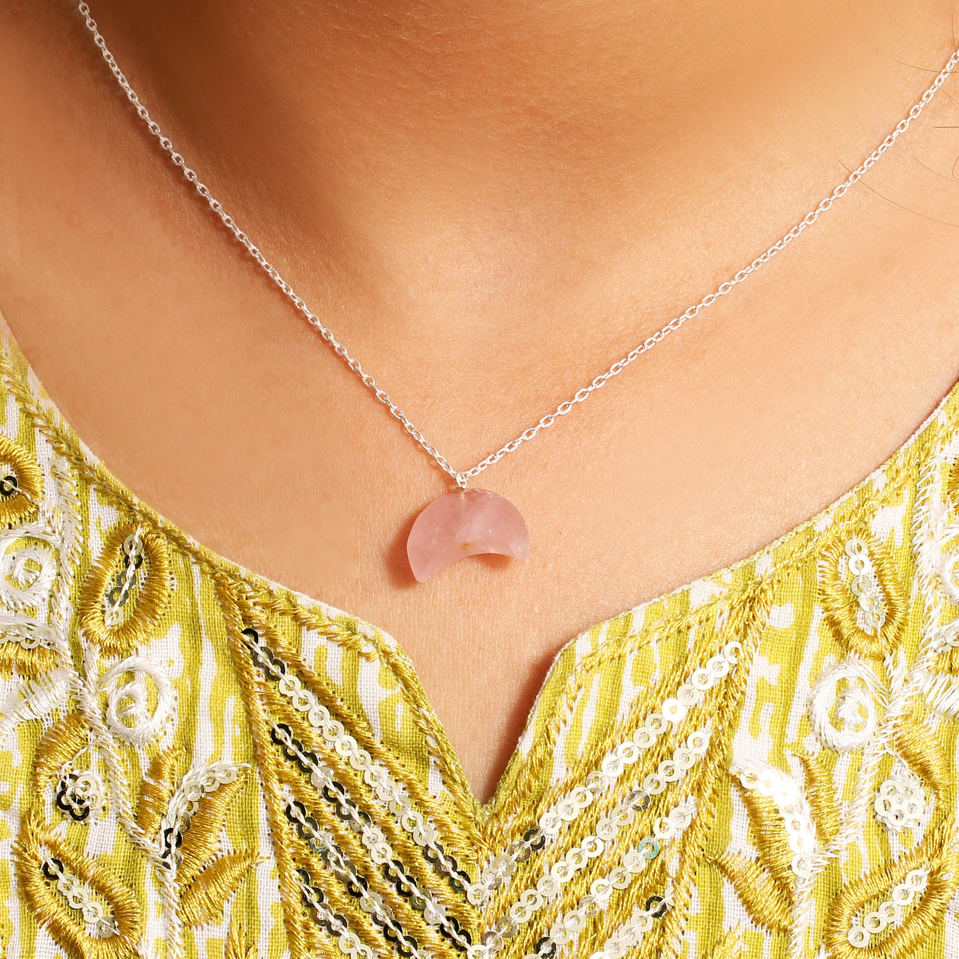 Embrace the gentle energy of love and healing with this elegant crescent moon pendant featuring natural rose quartz on a 925 sterling silver chain. Ideal for daily wear or gifting, it promotes emotional balance, self-love, and calming vibes.