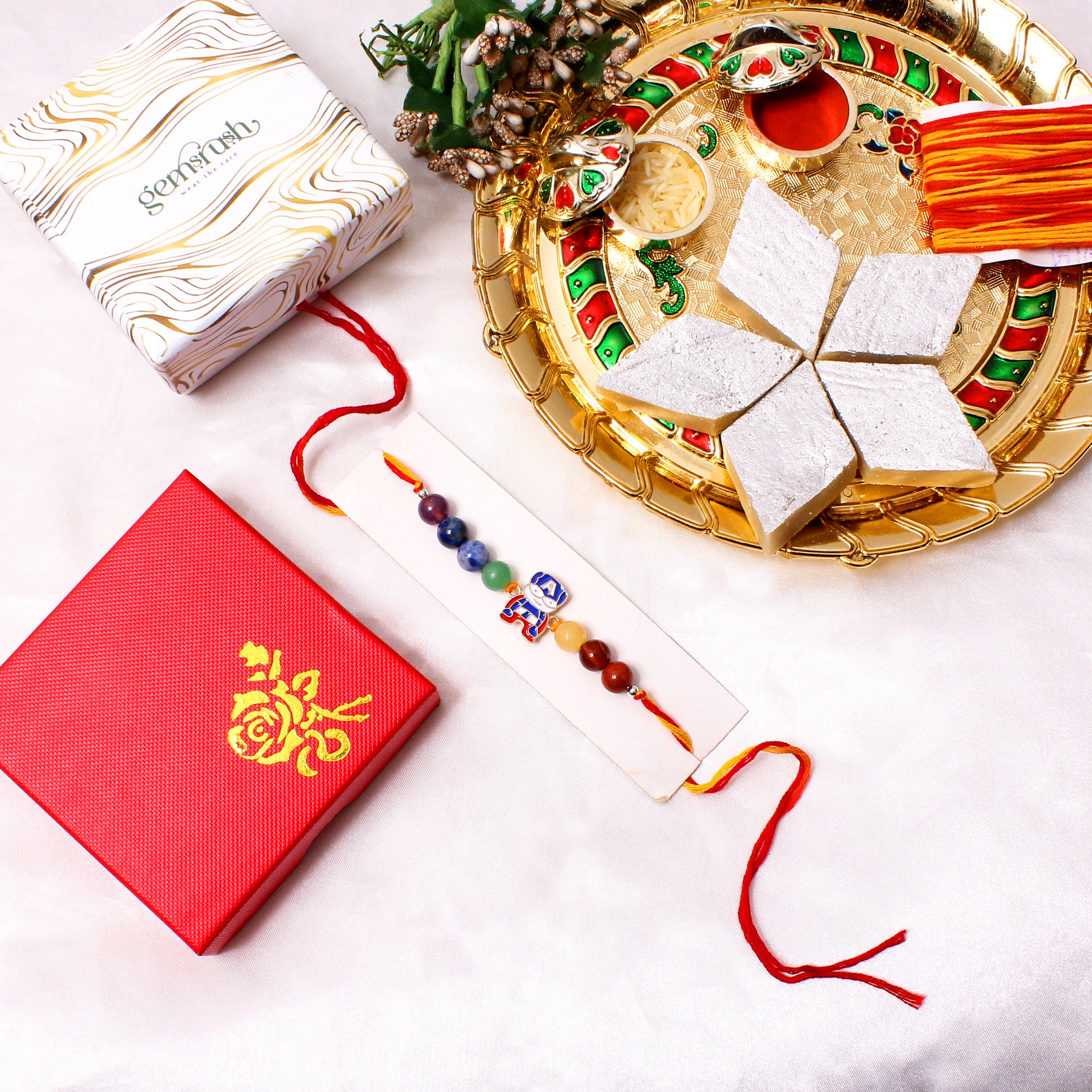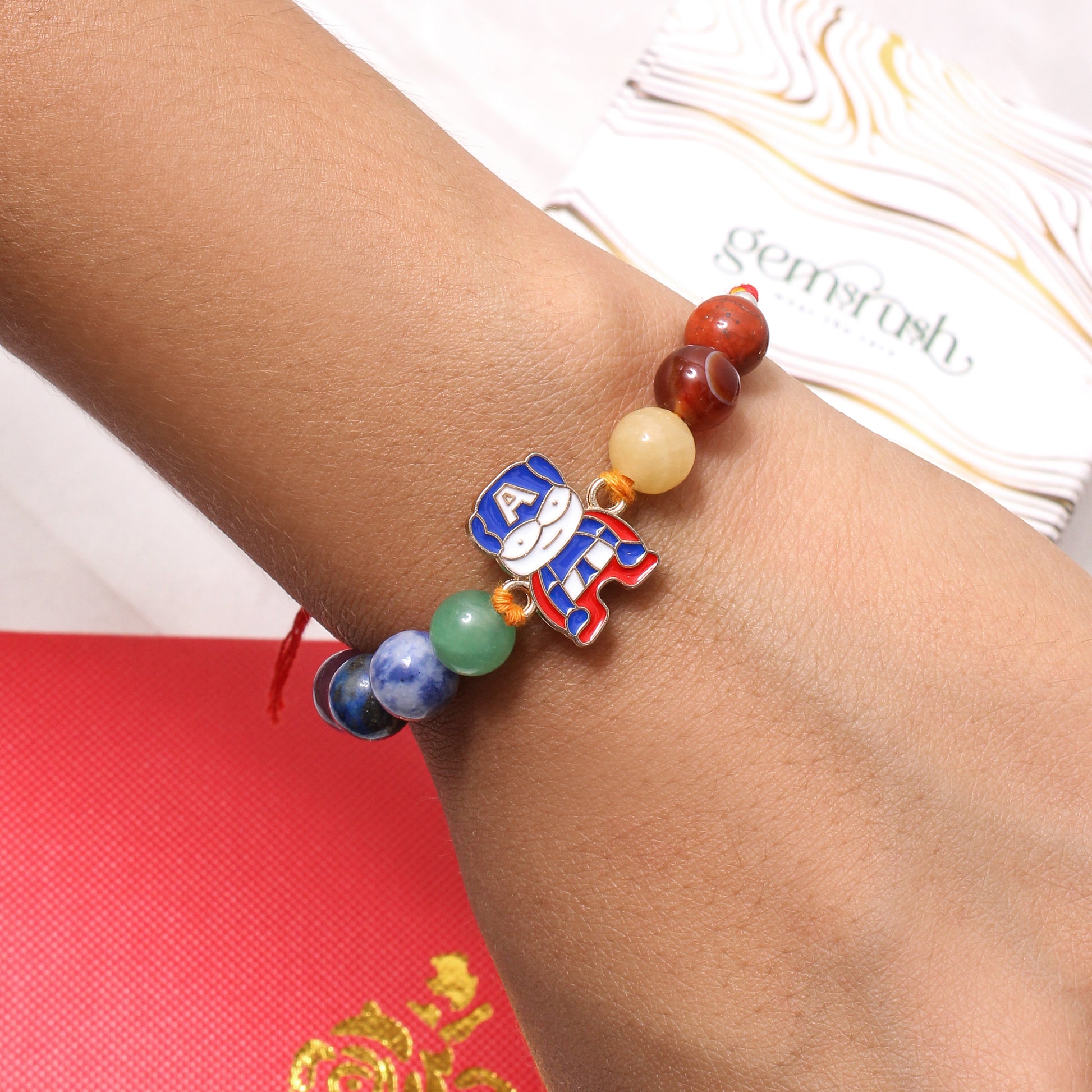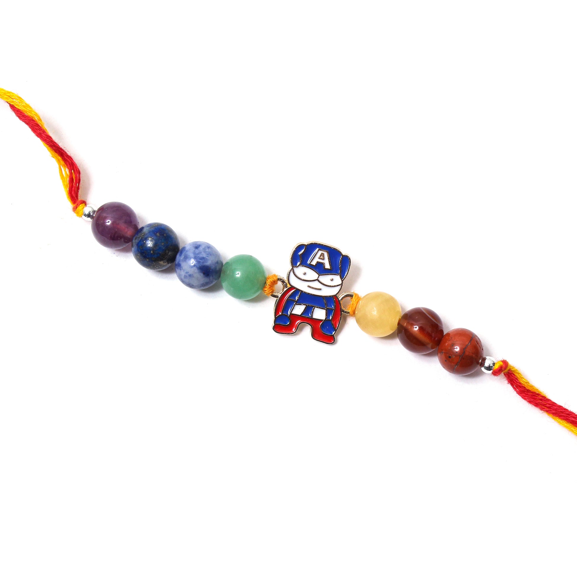 Add a heroic twist to Raksha Bandhan with this vibrant gemstone rakhi featuring a fun Captain-inspired superhero charm. Crafted with amethyst, lapis lazuli, aventurine, carnelian, sodalite, jasper, and yellow jade—these natural stones promote courage, focus, emotional balance, and protection. A perfect gift to empower and delight your little superhero brother.