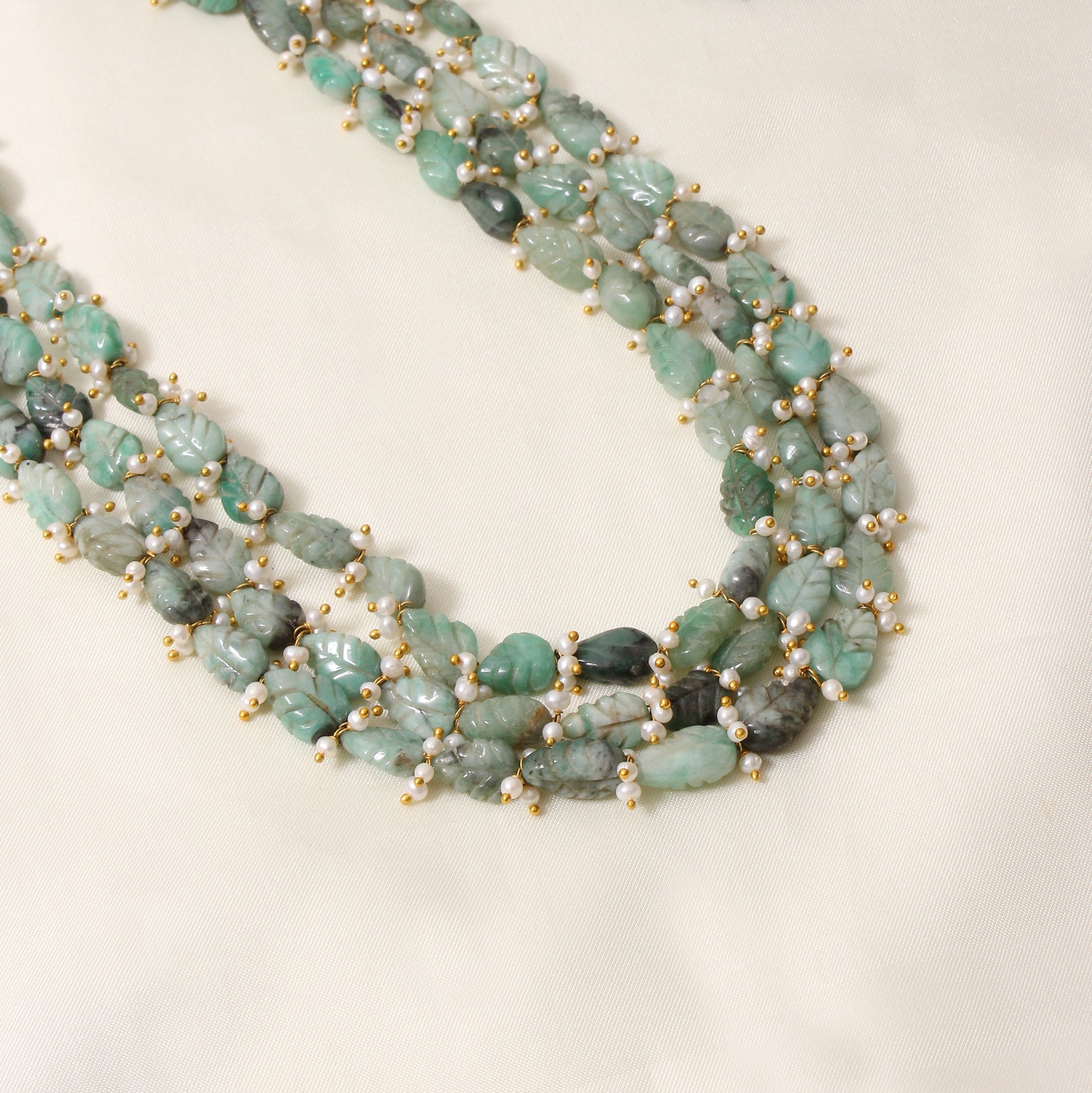 Handcrafted Natural Emerald & Pearl Leaf-Shape 6 Layer Sarafa Necklace – Elegant Green Gemstone Jewelry