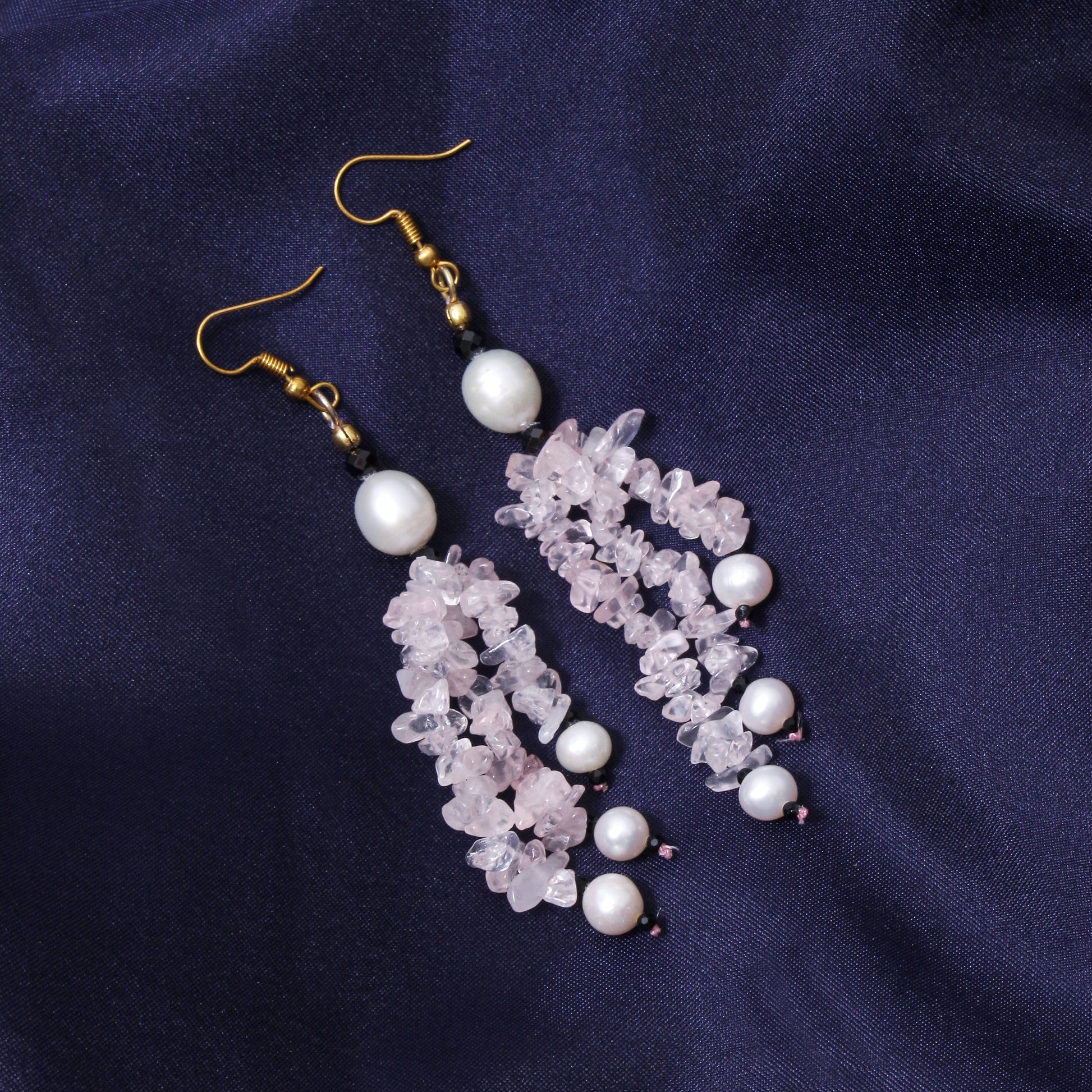 These elegant handmade dangle earrings feature natural rose quartz chips paired with lustrous pearls and sparkling black spinel beads, creating a soft yet luxurious look. Rose quartz promotes love and emotional healing, pearls add purity and calmness, and black spinel offers grounding and protection. Lightweight and stylish, these gemstone earrings are perfect for daily wear or special occasions, adding a feminine, healing-inspired touch to any outfit.