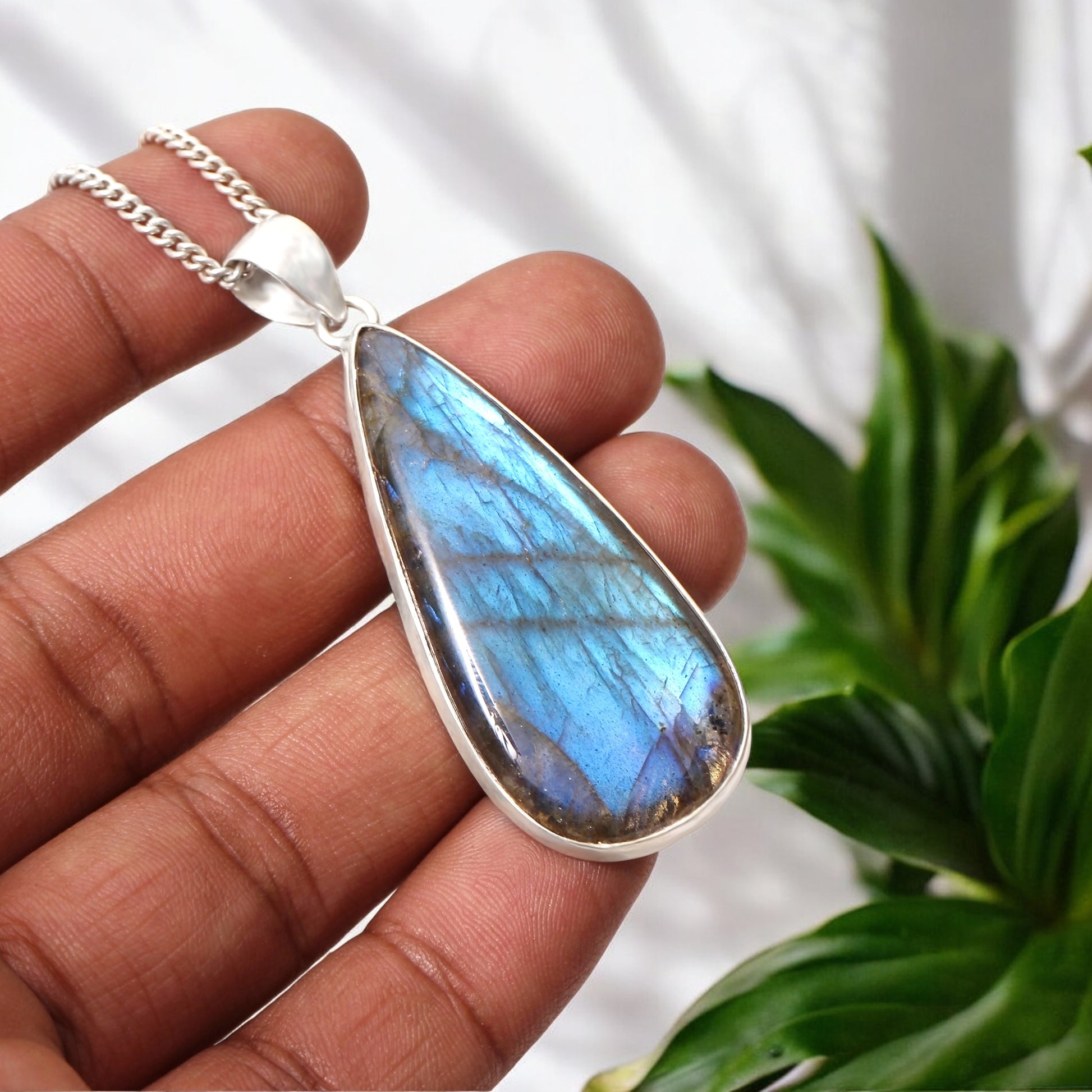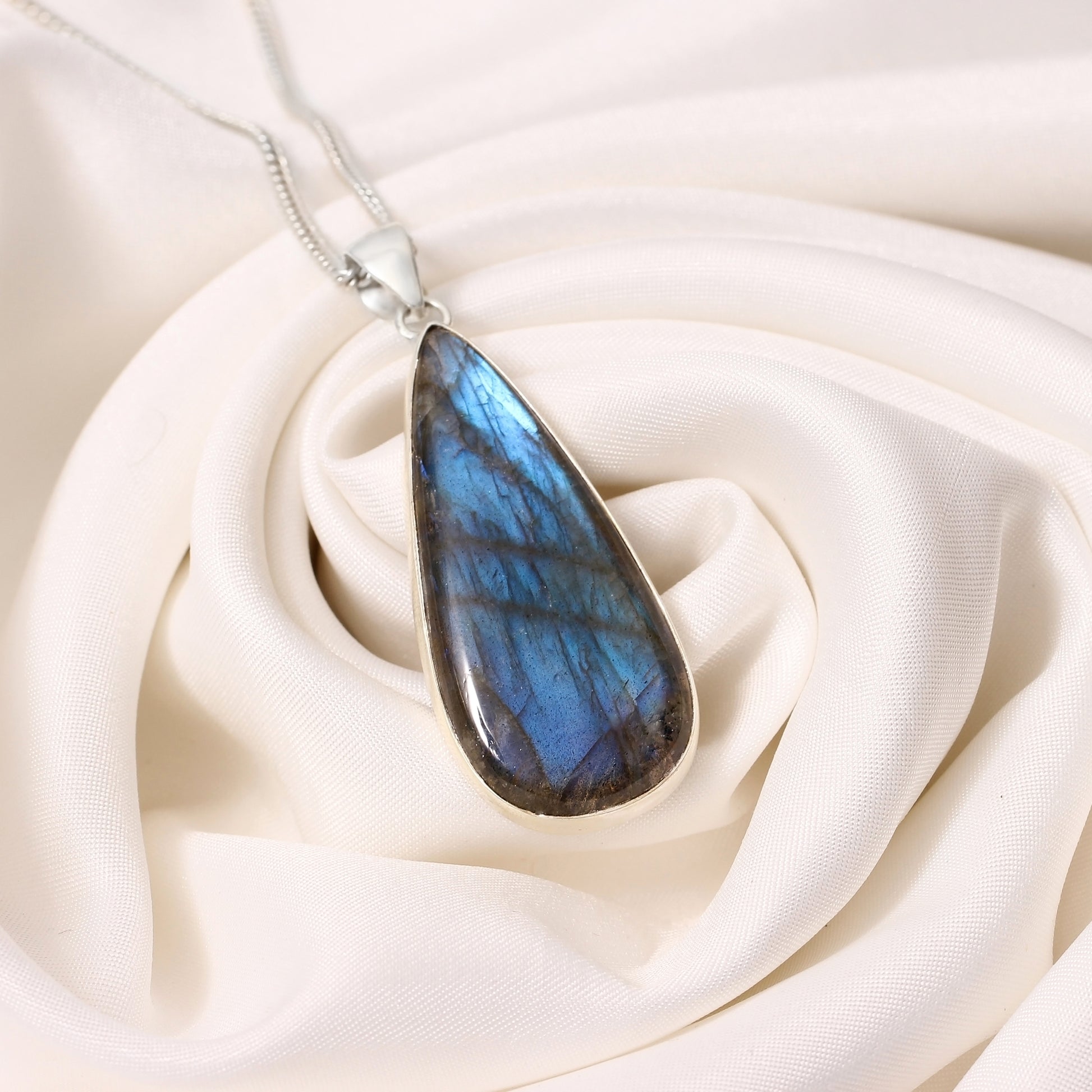 Adorn yourself with the mystical allure of labradorite with this stunning 925 sterling silver teardrop pendant necklace. The iridescent gemstone captures the light beautifully, revealing flashes of blue, green, and gold. Perfect for adding a touch of elegance and magic to any outfit, this handmade piece is a must-have for gemstone lovers and those who appreciate unique, natural jewelry.