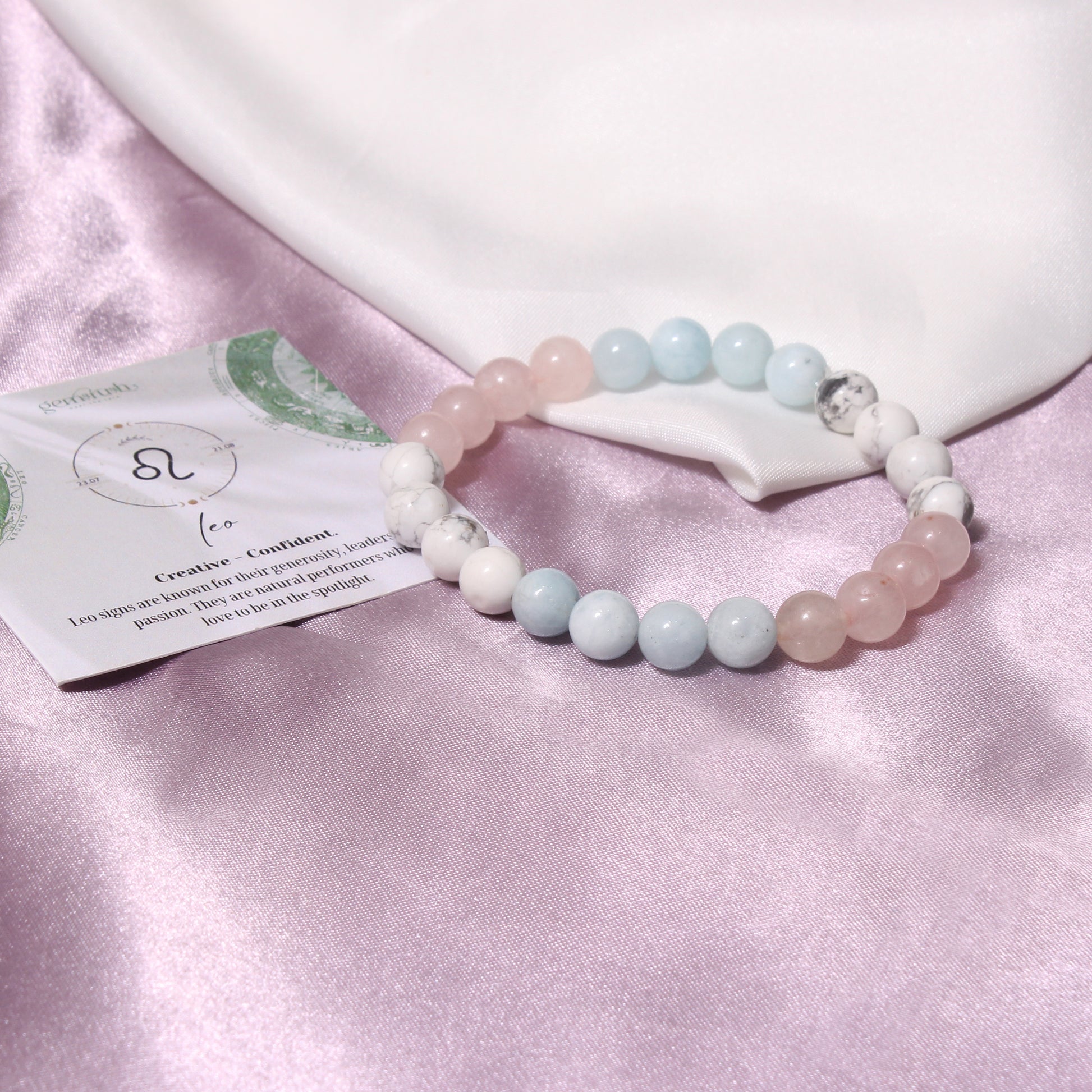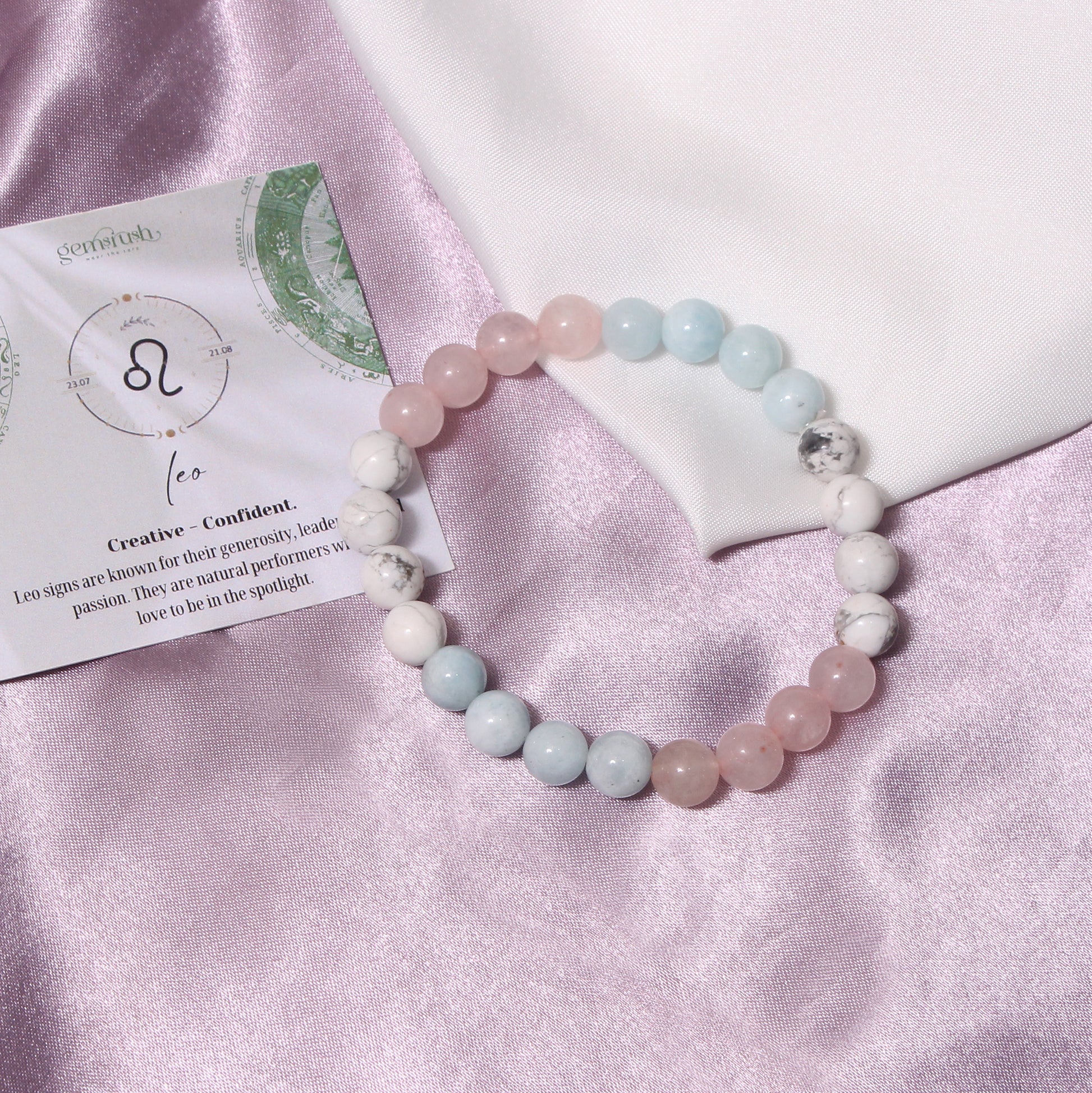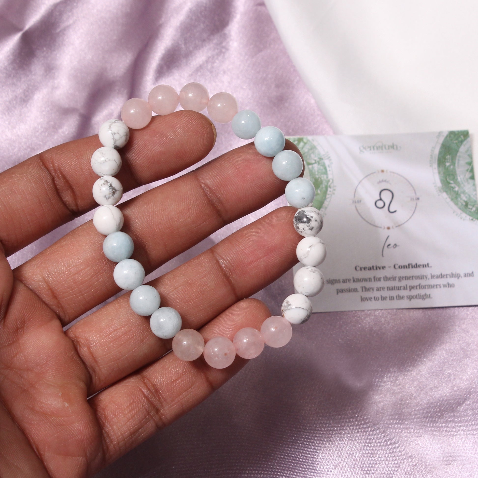 This Leo Zodiac Sign Bracelet is crafted with Rose Quartz, Aquamarine, and Howlite, perfectly attuned to the creative and confident nature of Leo (Simha Rashi). Rose Quartz promotes self-love and compassion, Aquamarine enhances communication and courage, while Howlite brings calmness and clarity. Designed to resonate with Leo's leadership and generosity, this bracelet is a stunning accessory for spiritual balance and empowerment. Perfect for those who shine in the spotlight and love to inspire others!