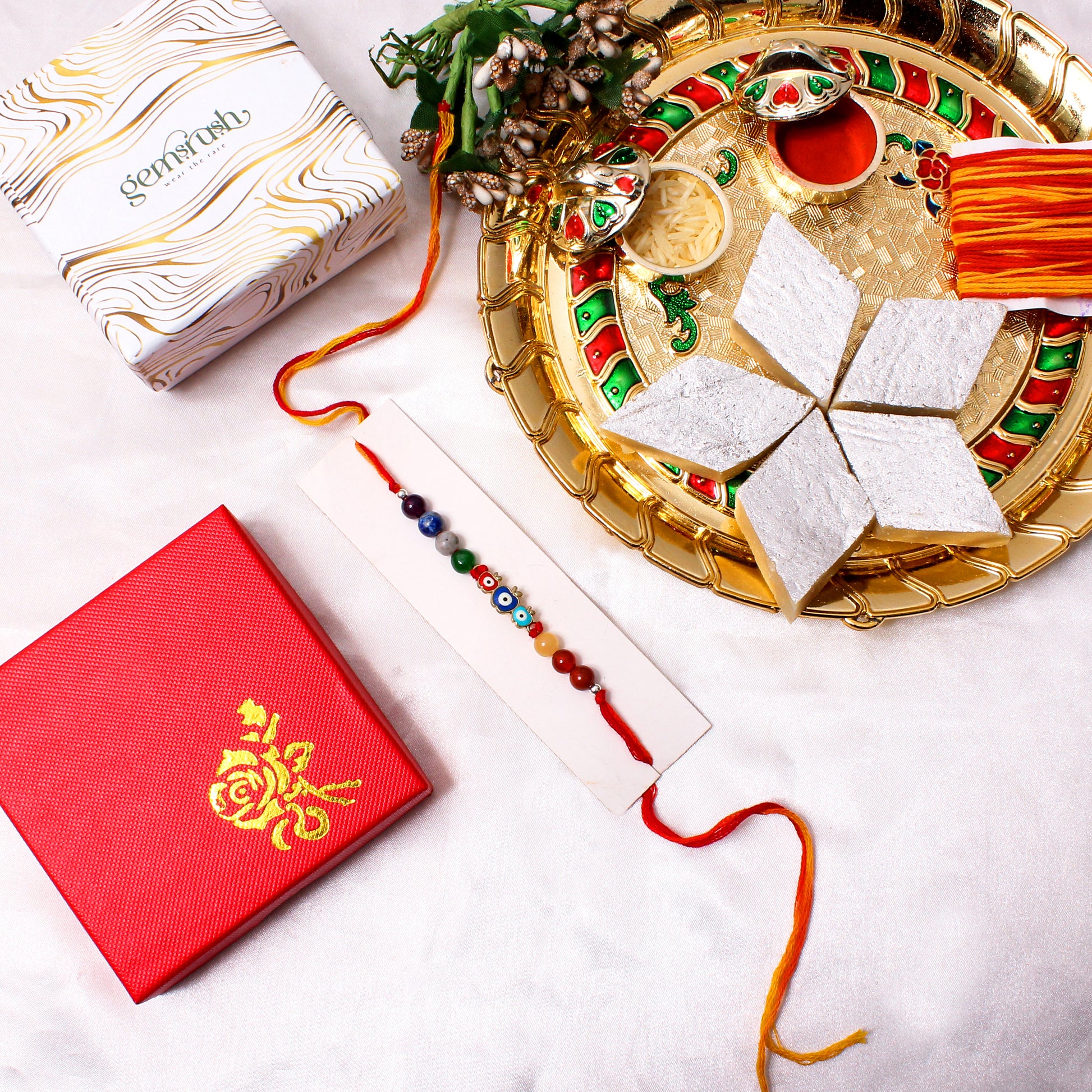 Celebrate Raksha Bandhan with this vibrant Rakhi featuring cute apple-shaped evil eye charms for protection and style. Adorned with amethyst for peace, lapis lazuli for wisdom, pyrite for prosperity, green aventurine for good luck, yellow jade for joy, carnelian for energy, and jasper for grounding, this Rakhi brings together meaningful gemstones and playful design in one thoughtful gift.