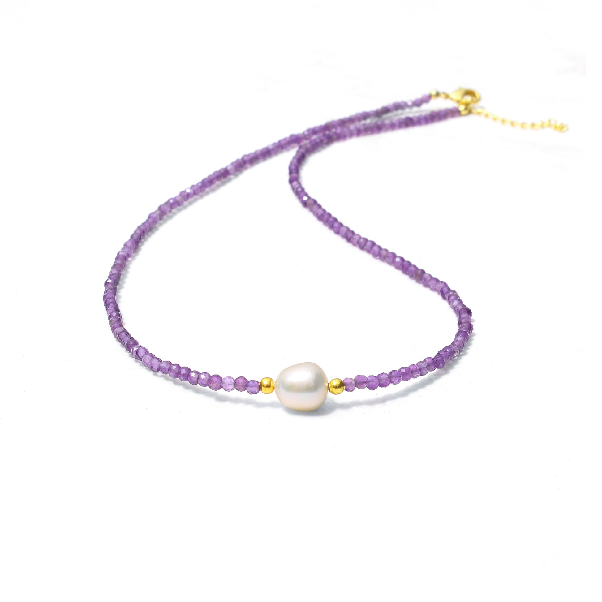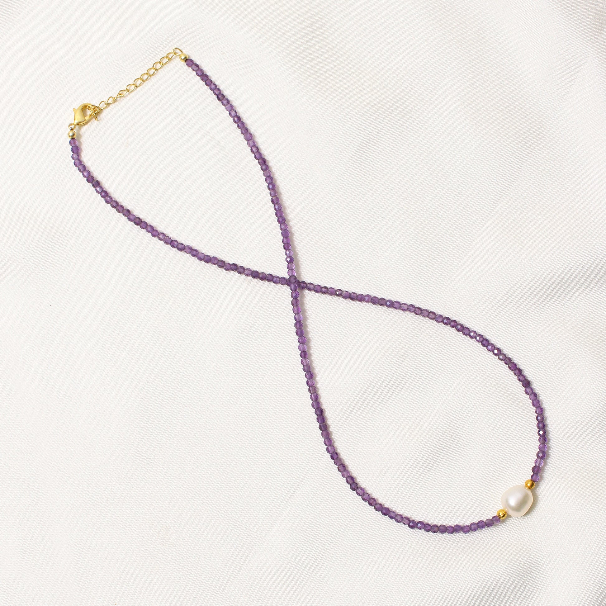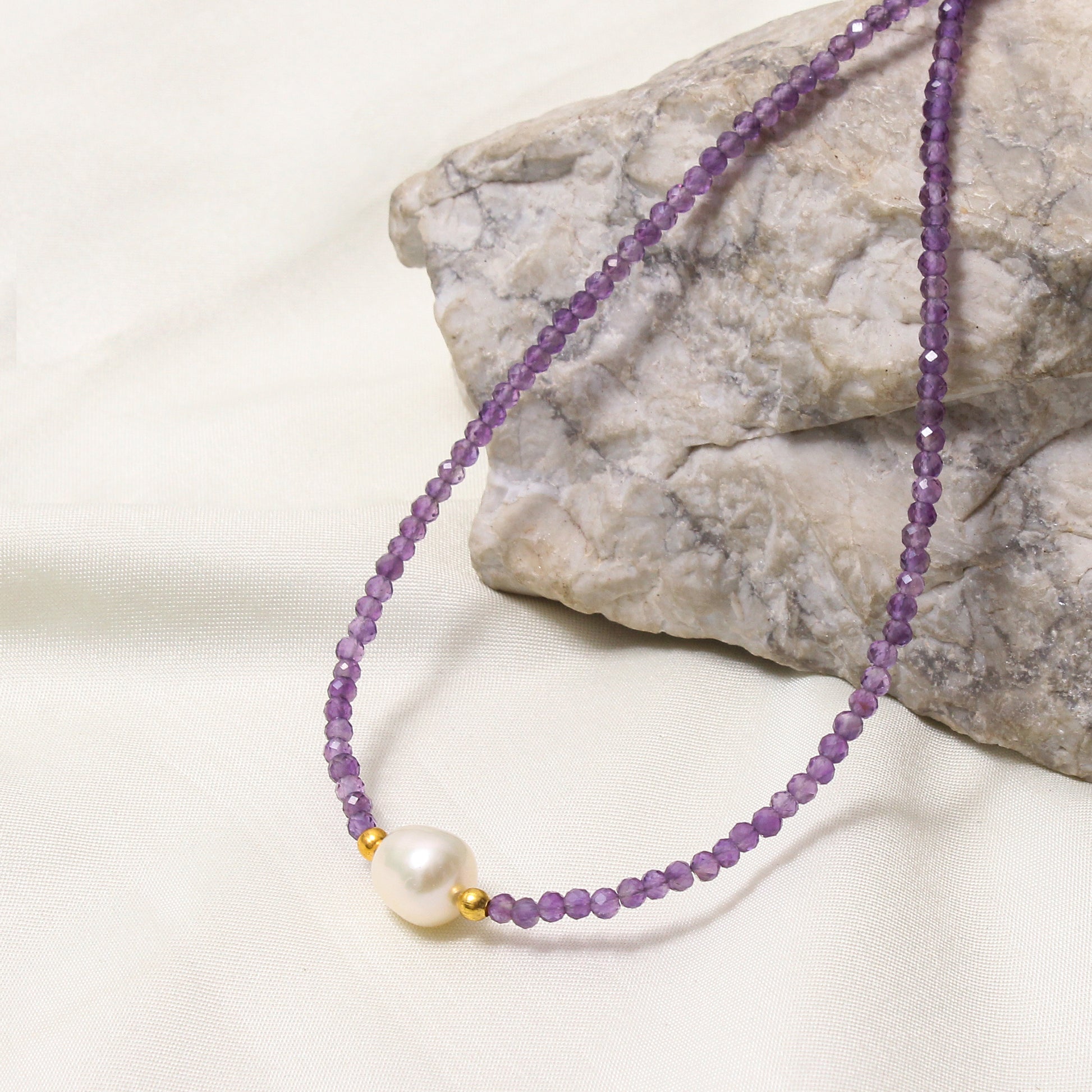 This exquisite necklace combines the soothing energy of amethyst with the timeless beauty of a freshwater pearl. Amethyst promotes peace, clarity, and spiritual balance, while the pearl adds grace and harmony—perfect for elevating both everyday and special occasion looks.