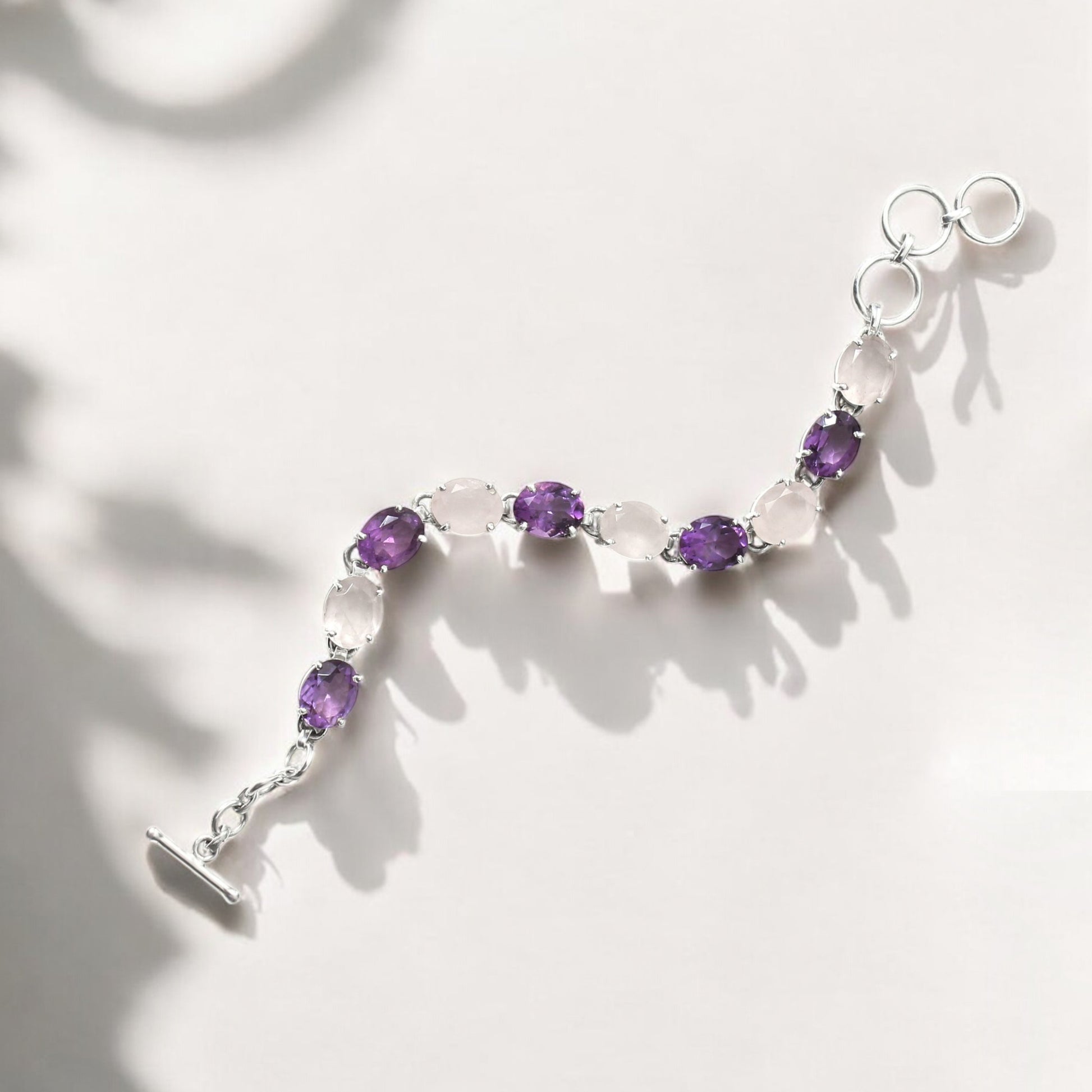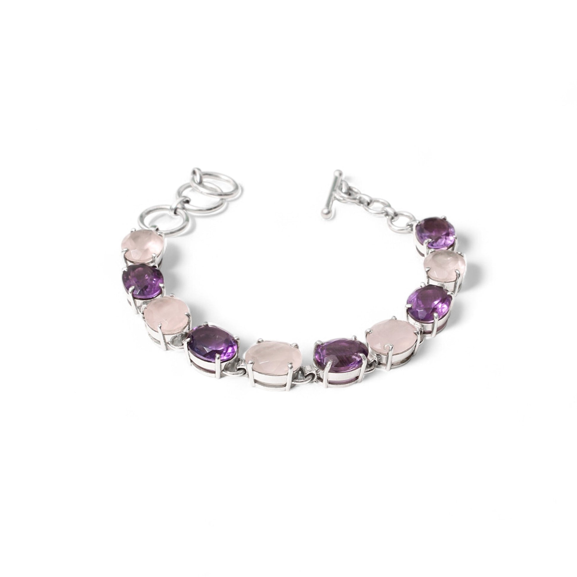 Enhance your style with this exquisite 925 sterling silver bracelet featuring captivating amethyst and rose quartz gemstones. Known for their calming and heart-healing properties, this bracelet combines elegance with the benefits of emotional balance and inner peace. Perfect for daily wear or special occasions!