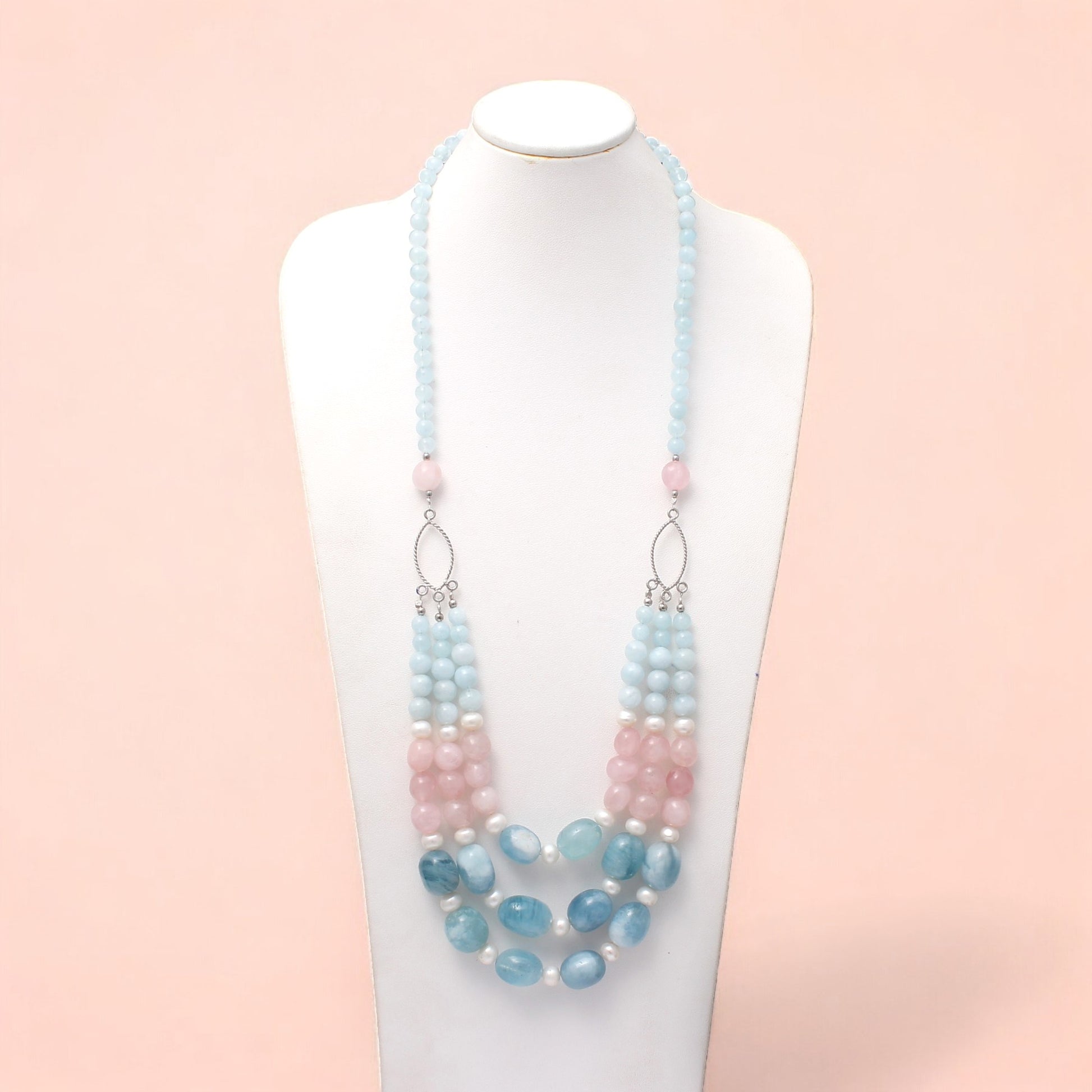Natural Aquamarine, Rose Quartz & Pearl Beads Gemstone Necklace – Serenity & Elegance
