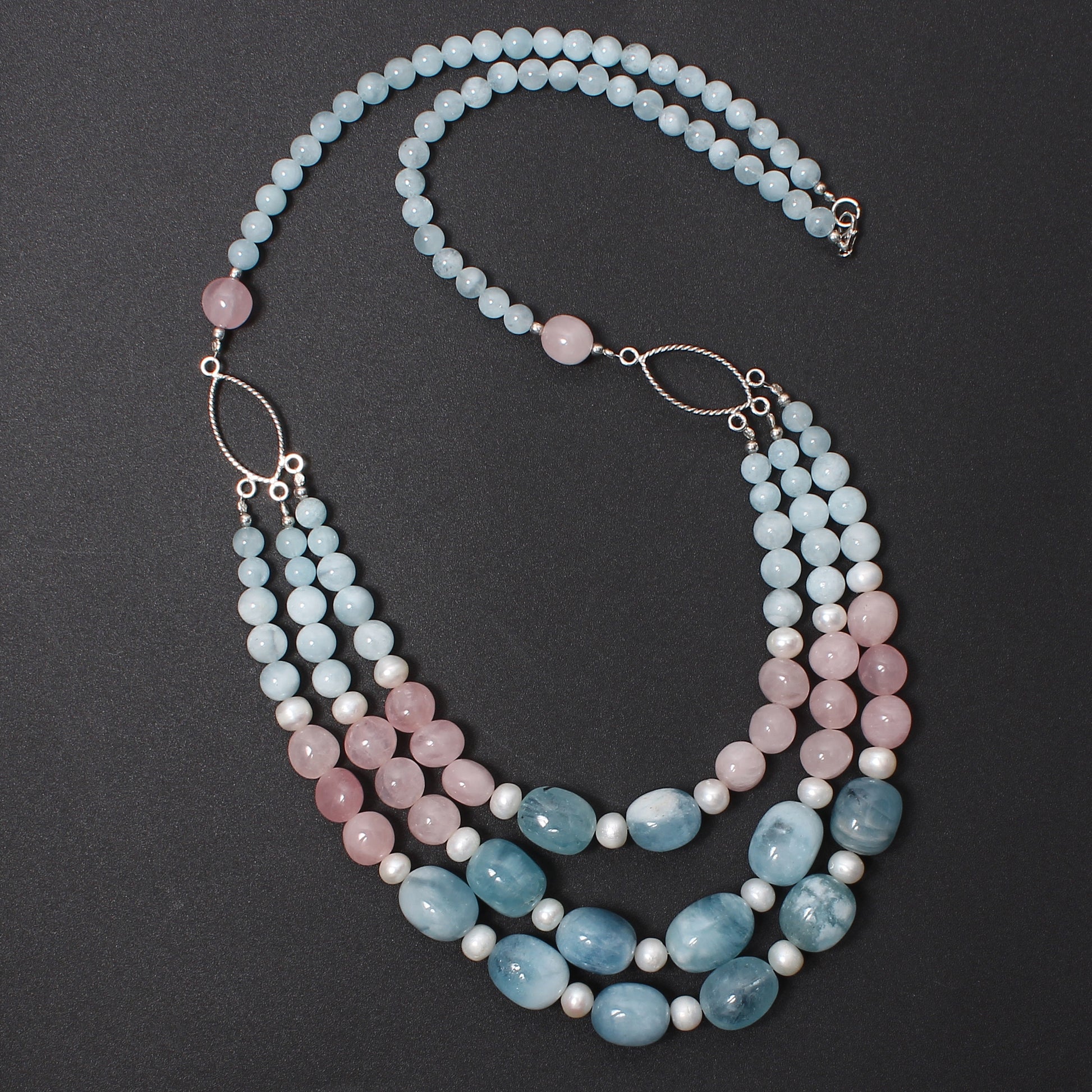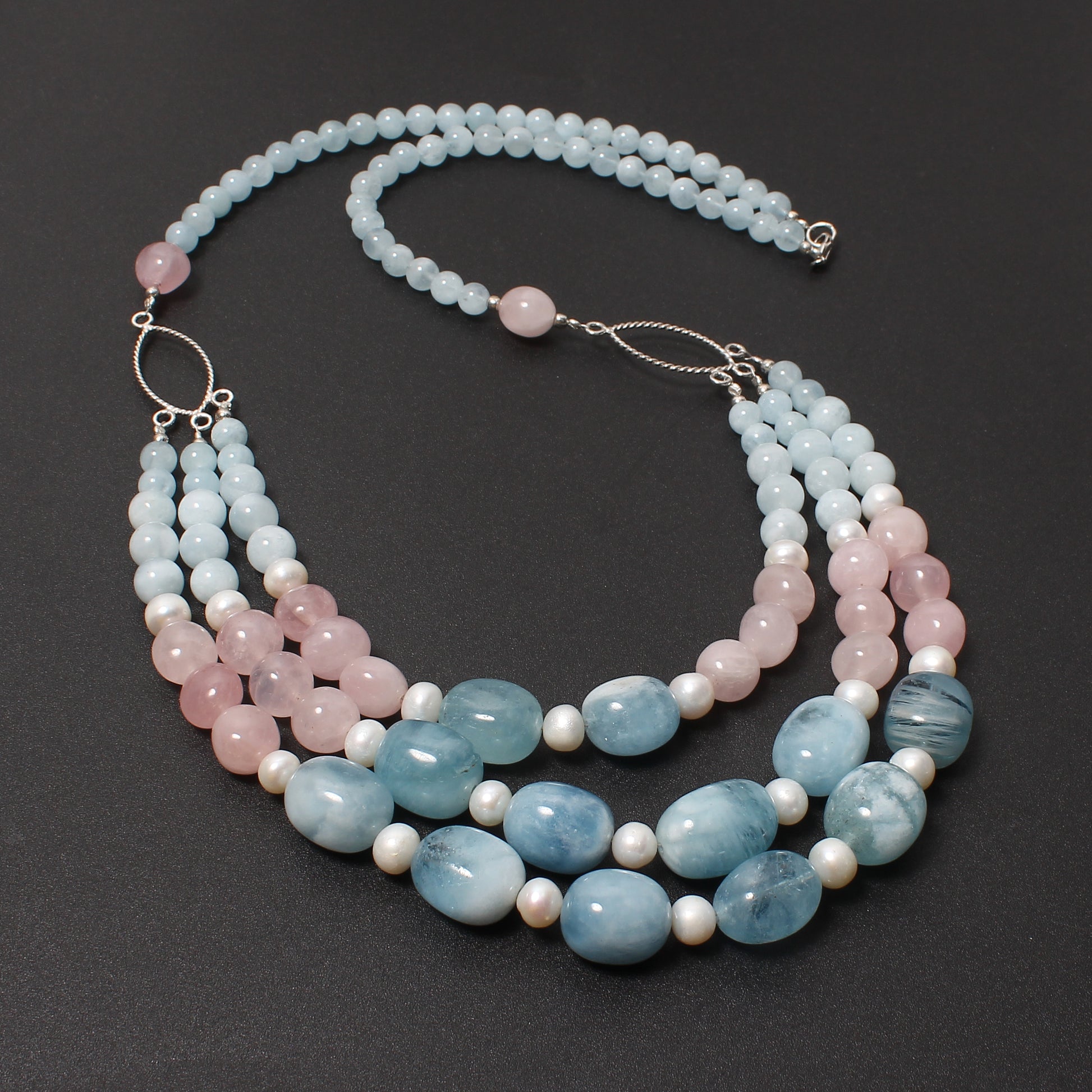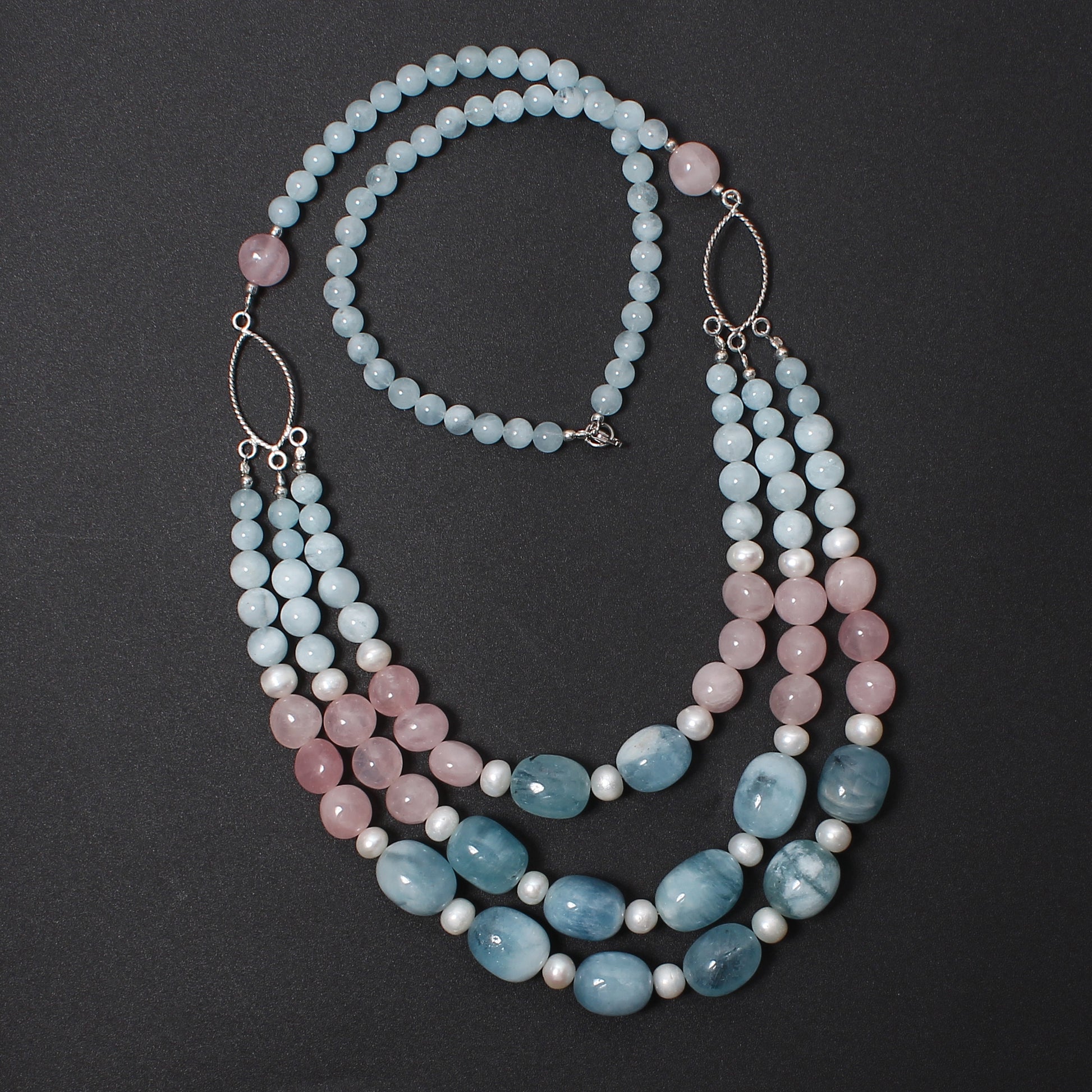 ITEM: Natural Aquamarine/Rose Quartz/Pearl Beads Gemstone Necklace
