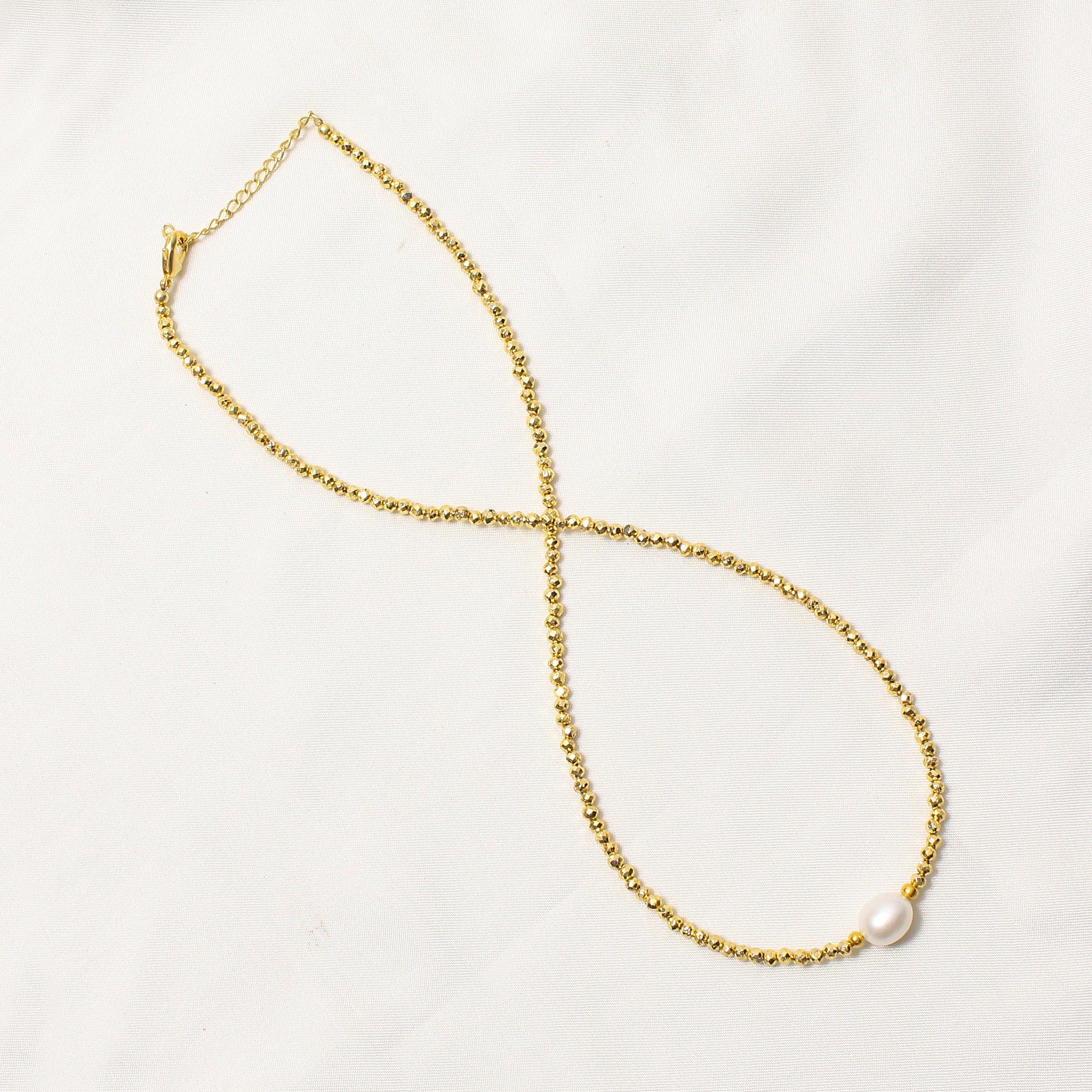 Elevate your style with this golden pyrite & pearl necklace, blending the grounding energy of pyrite with the timeless elegance of a freshwater pearl. Perfect for layering or wearing solo, this handmade beaded choker adds a radiant golden shimmer and classic charm to any outfit.
