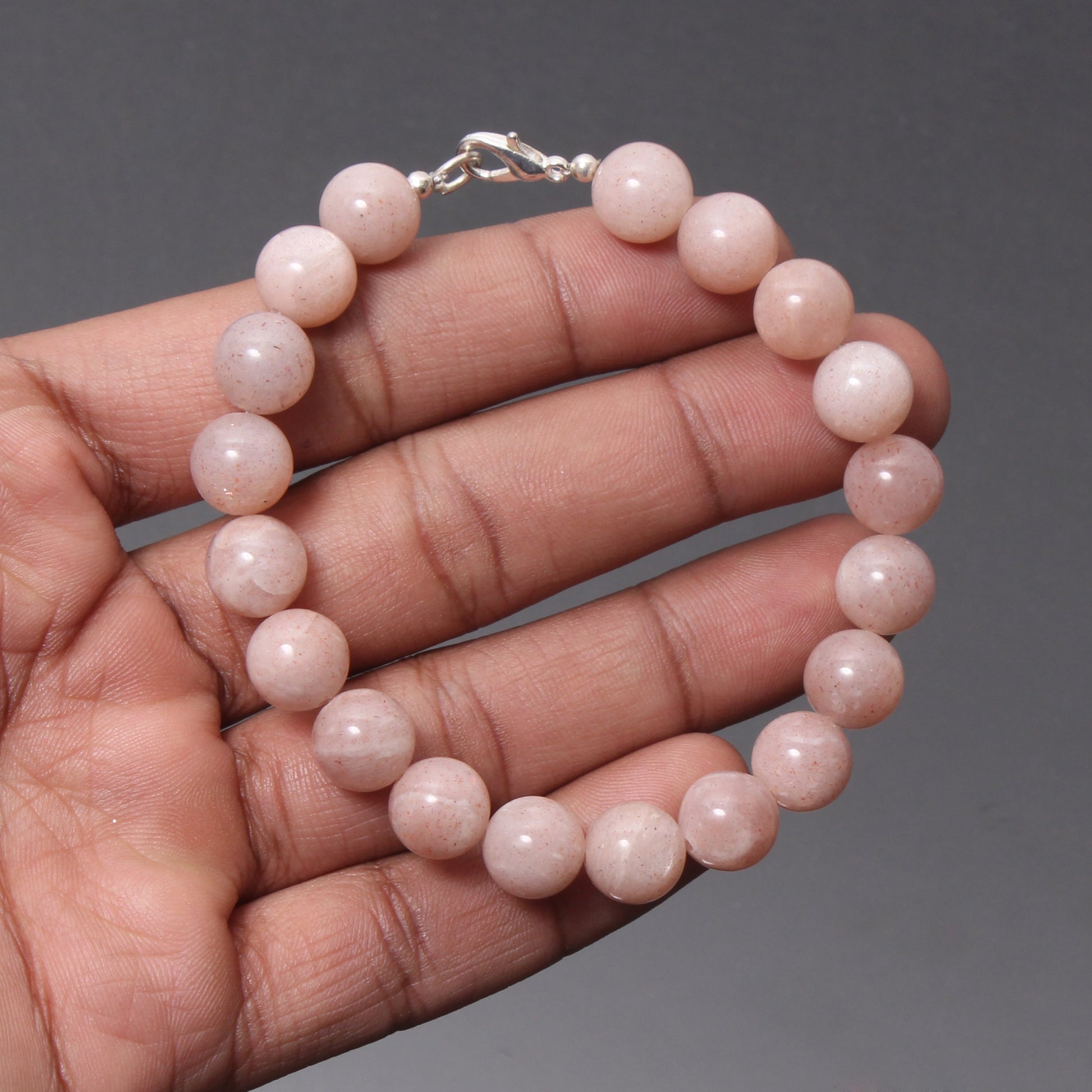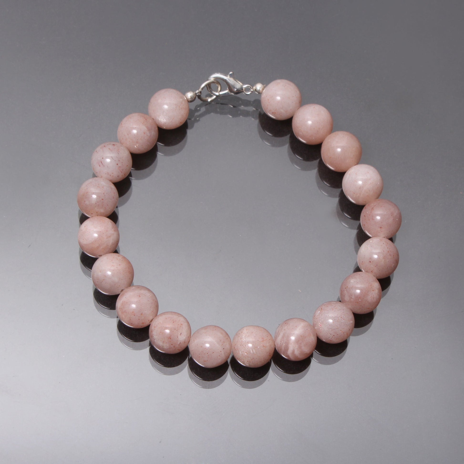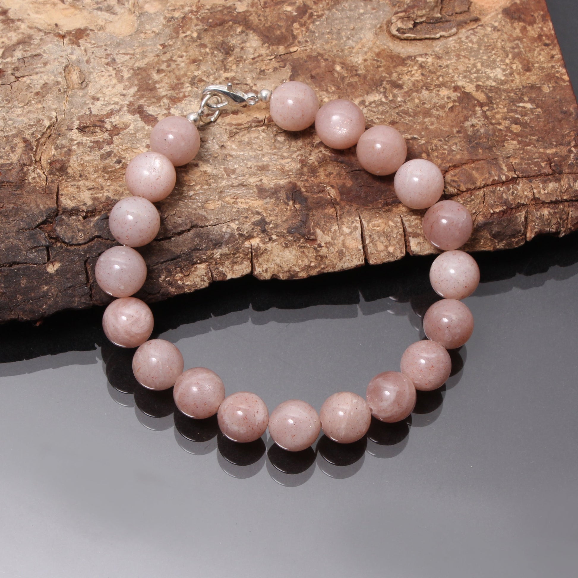 Natural Peach Moonstone Bracelet | 10mm Round Beaded 8 Inch Bracelet - Silver Lock