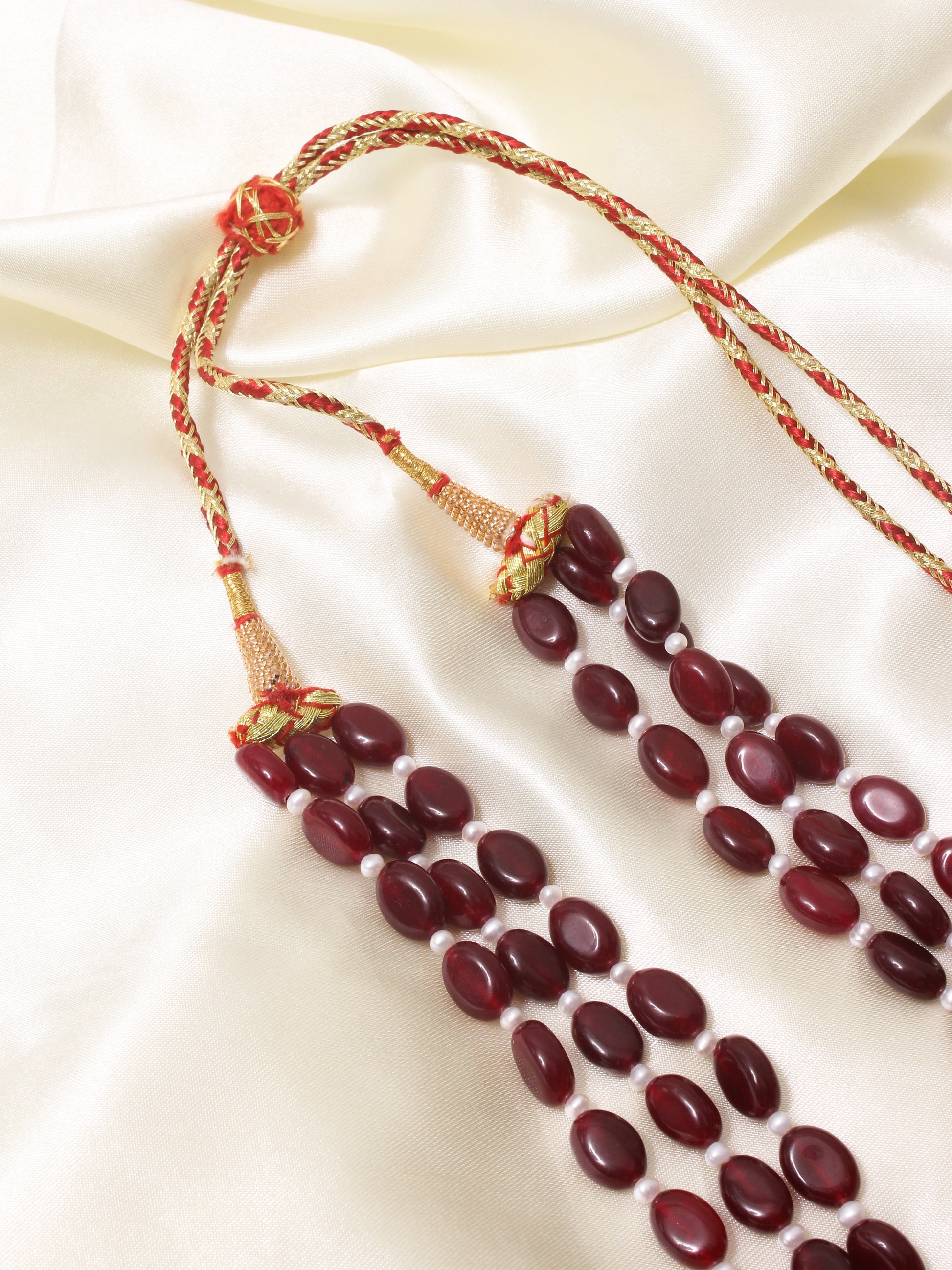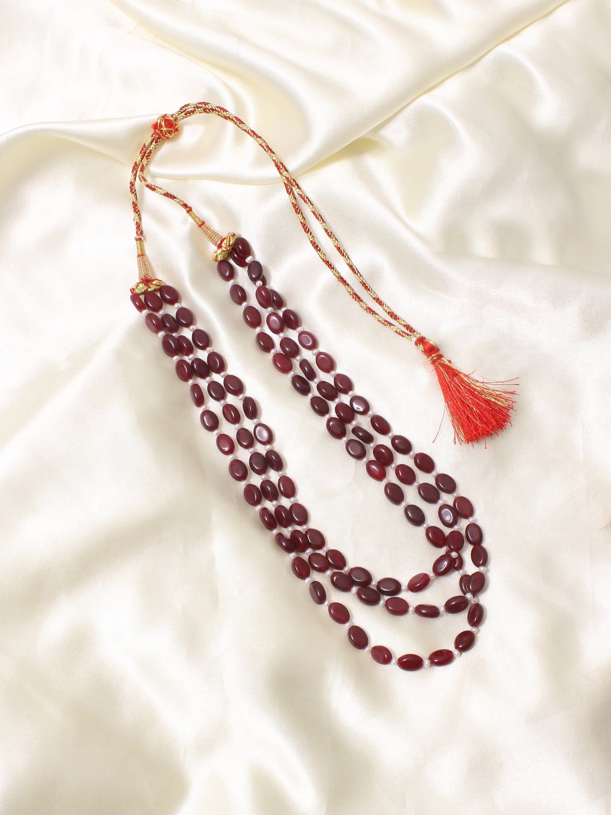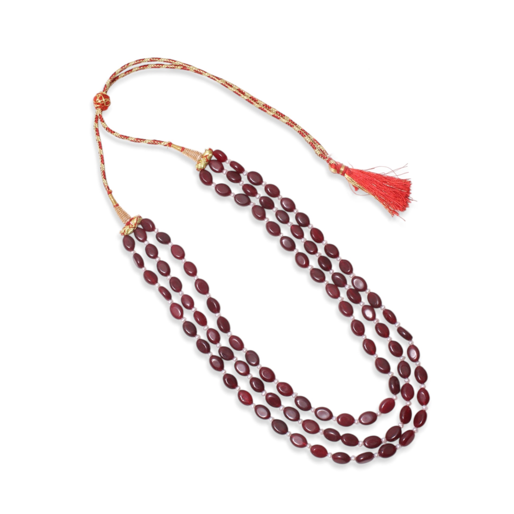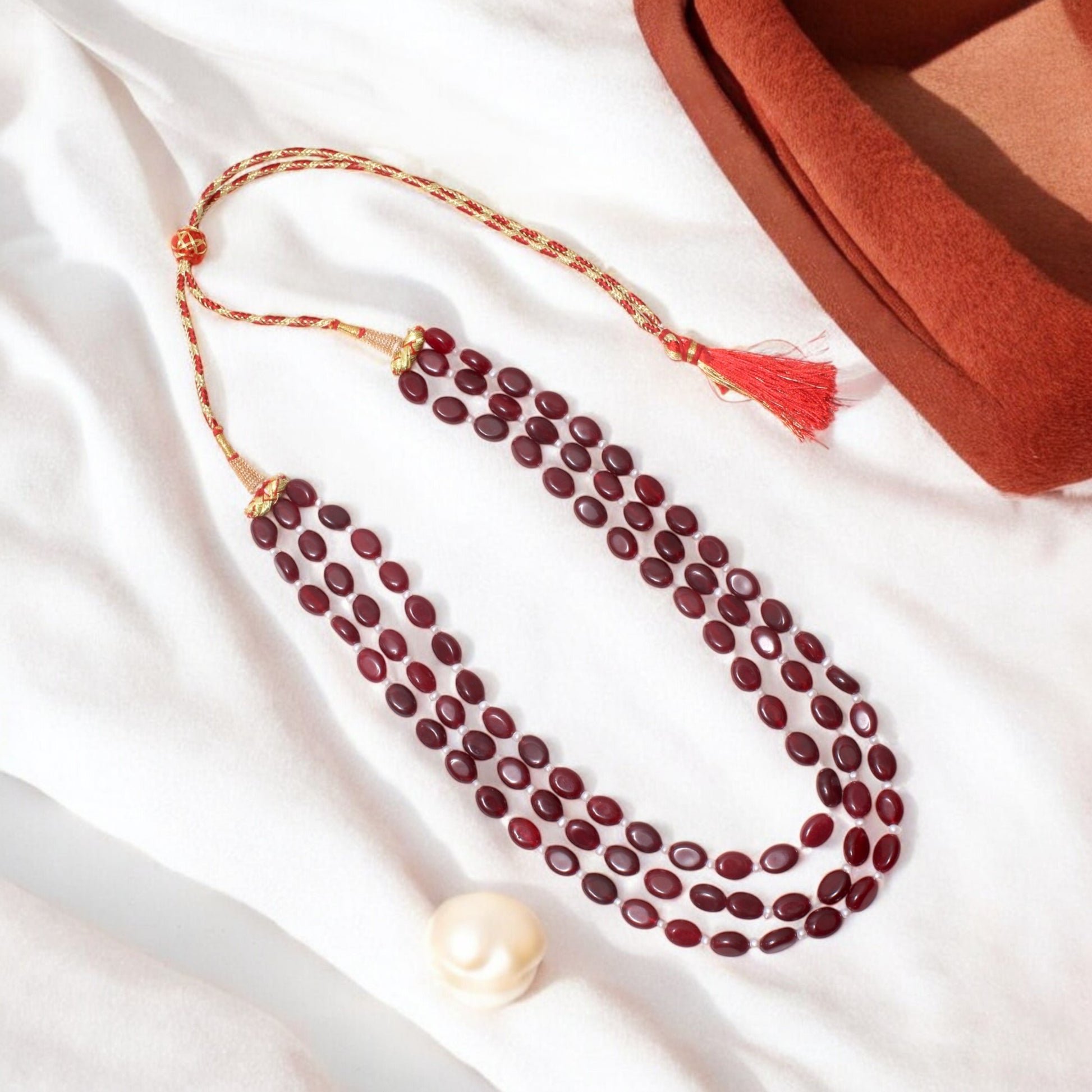 Add timeless charm to your look with this elegant three-layer necklace crafted from natural ruby quartz and luminous pearls. The deep red hues radiate sophistication, while the adjustable thread ensures a perfect fit. Ideal for weddings, festive events, or gifting, this piece beautifully blends tradition with luxury.