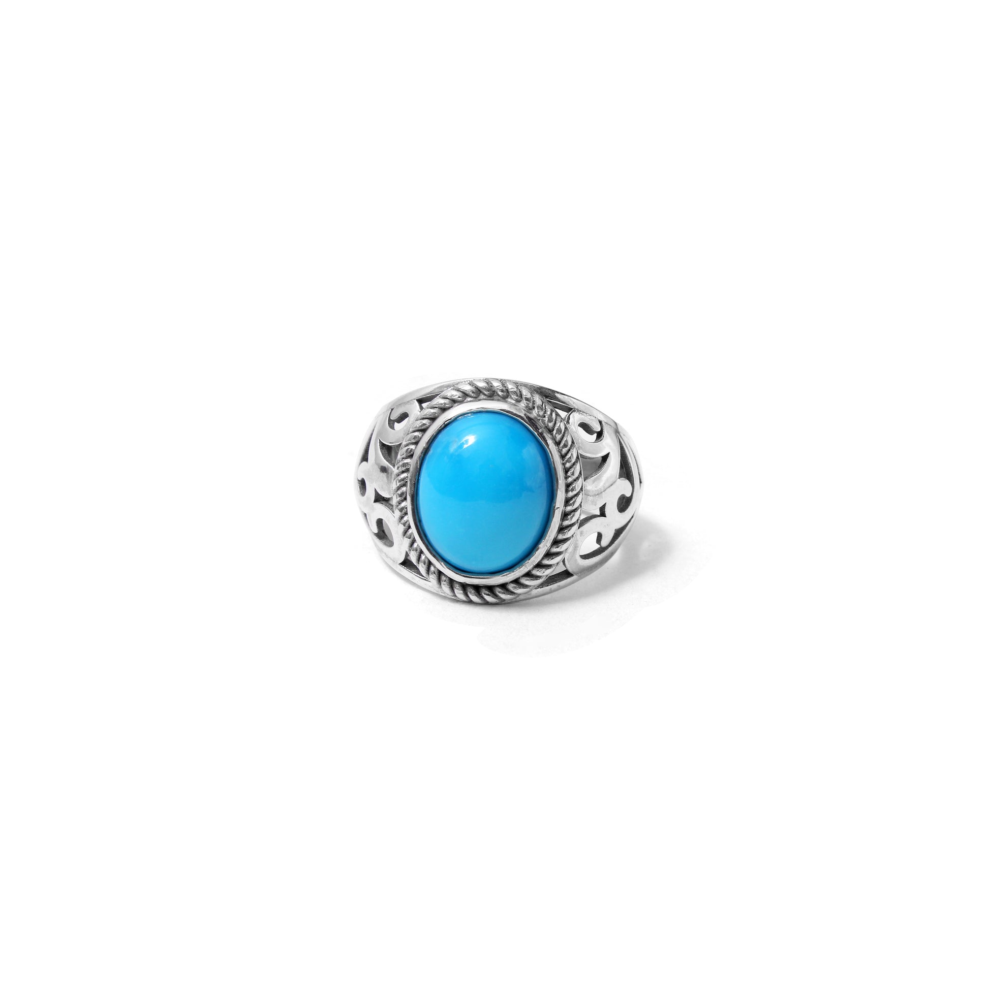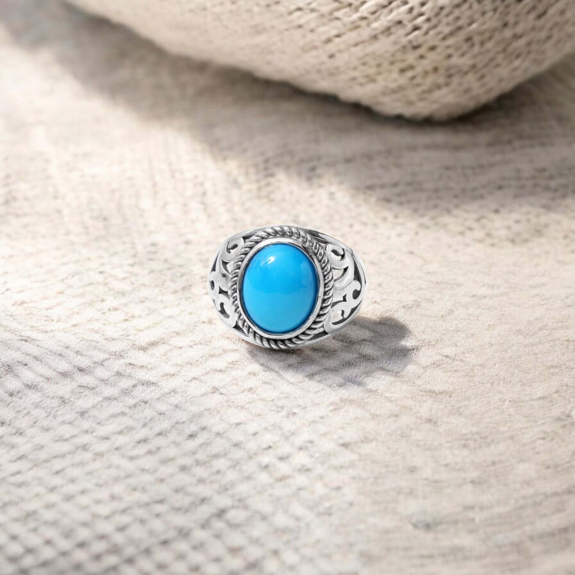 This bold and elegant men's ring showcases a striking turquoise gemstone set in premium 925 sterling silver. Featuring intricate vintage-inspired filigree on the sides, it offers a unique blend of strength, style, and spiritual significance. Known for its calming and protective properties, turquoise adds a touch of clarity and confidence to your everyday look. Perfect for both casual and formal occasions.