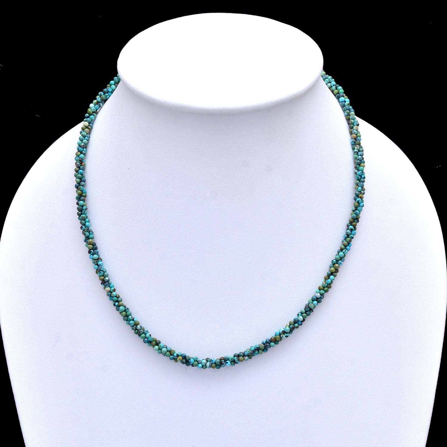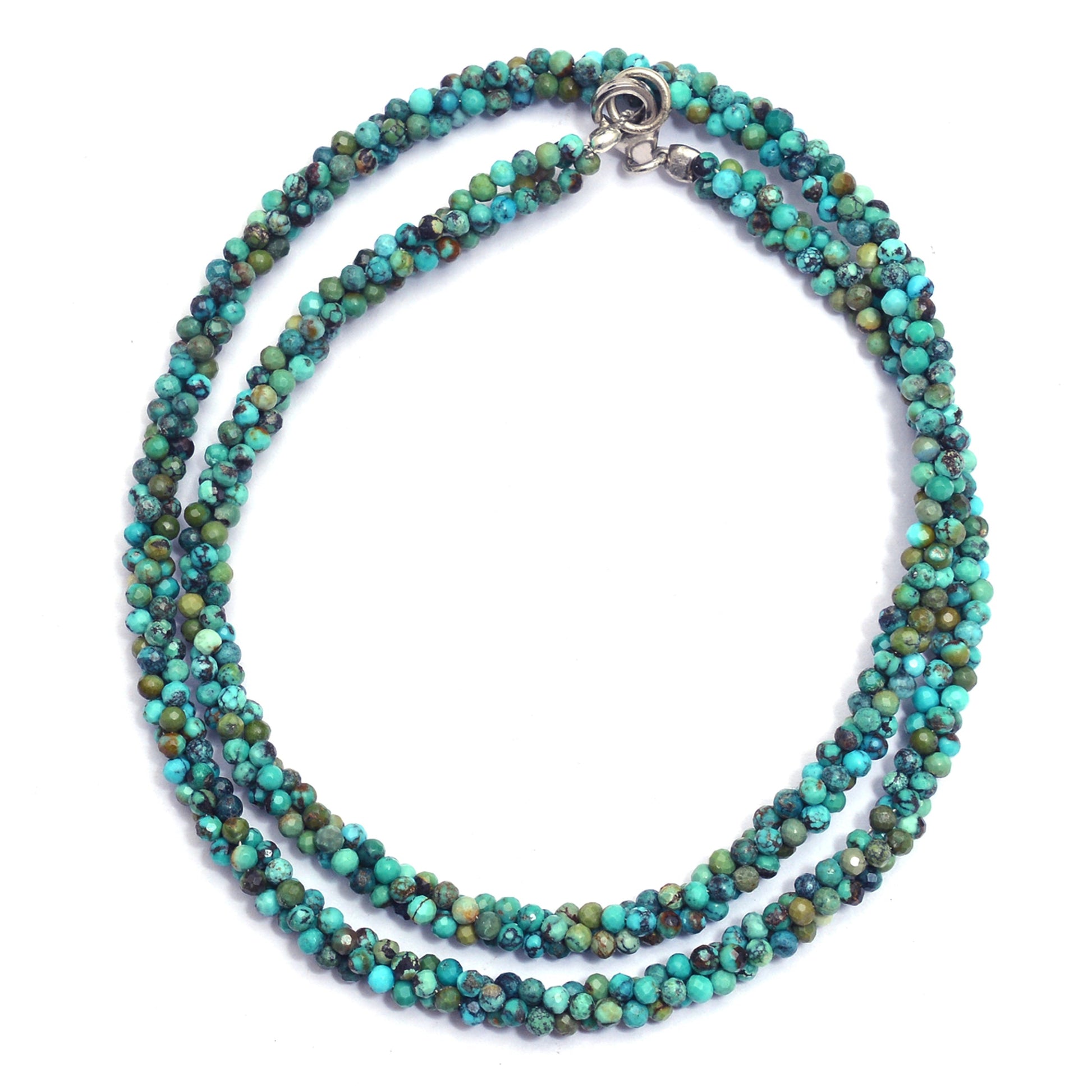 Product Details : This stunning necklace features a twisted strand of turquoise faceted beads. The silver clasp is a simple and elegant addition. The necklace is available in a variety of lengths to suit your personal style.